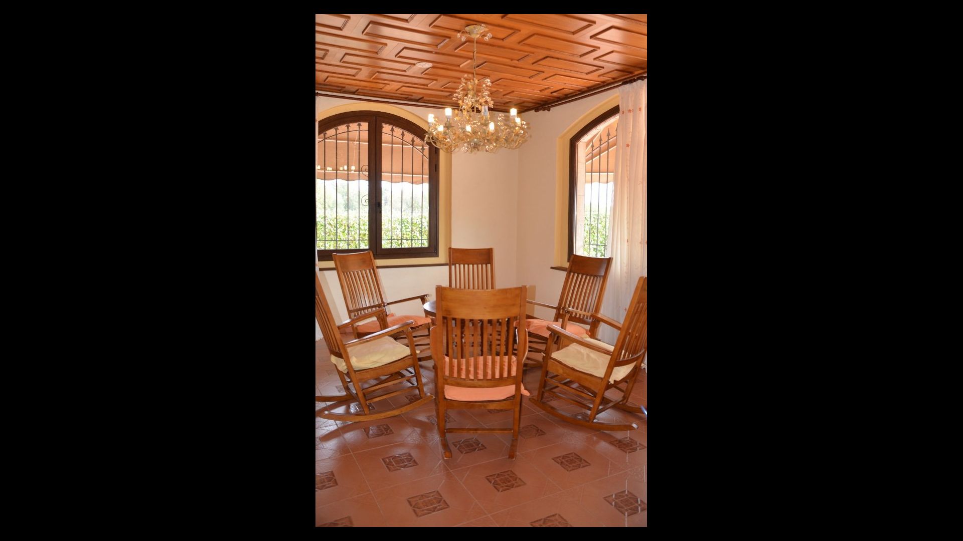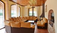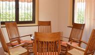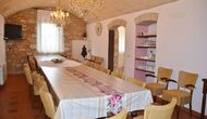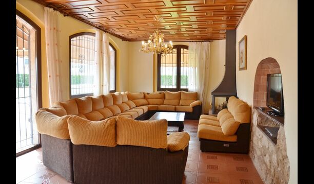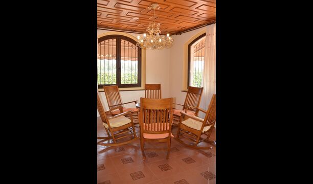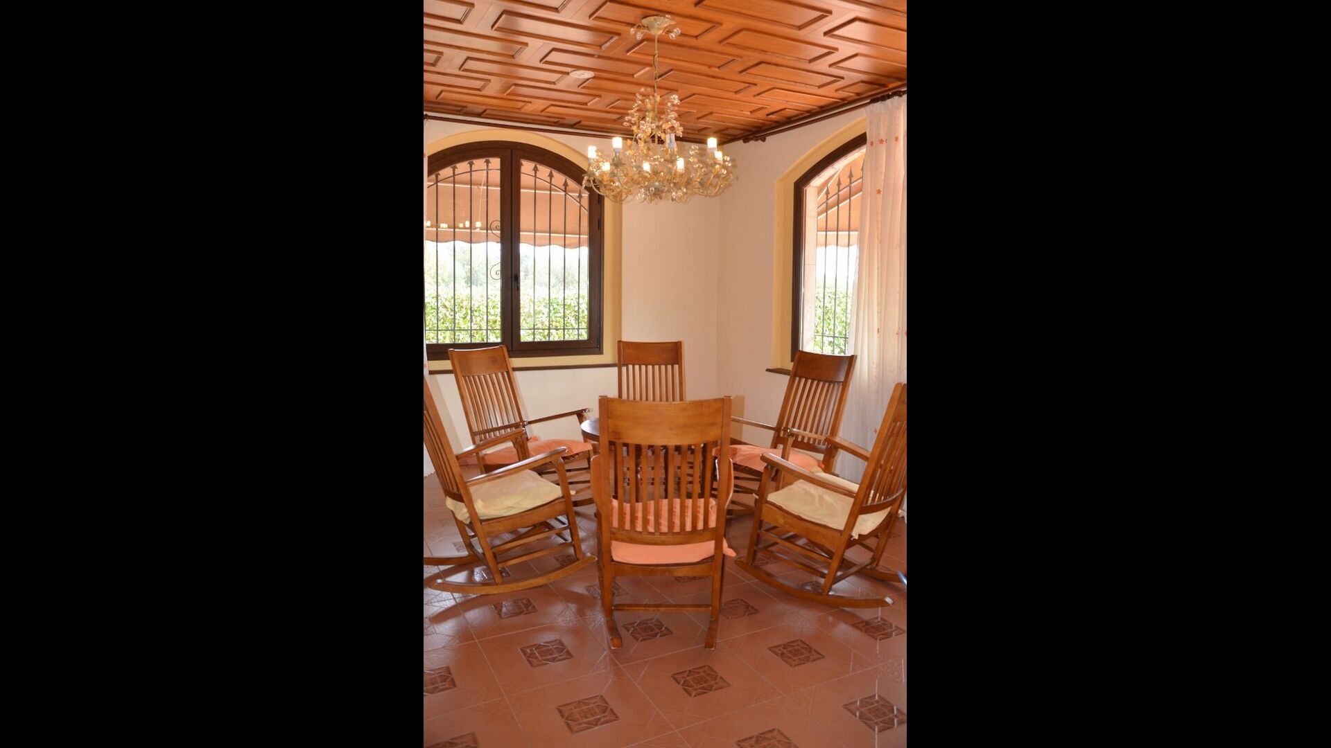 Inside the house, the kitchen is directly connected to the very big dining room, with a long dining table, so you can also dine together inside if you prefer. To the left, there is a spacious sitting room where you can either relax in the “grandmother” area with 8 rocking chairs, or in the sofa area with the biggest sofa we have ever seen, TV and fireplace, if you come in the wintertime.