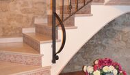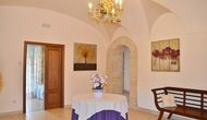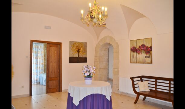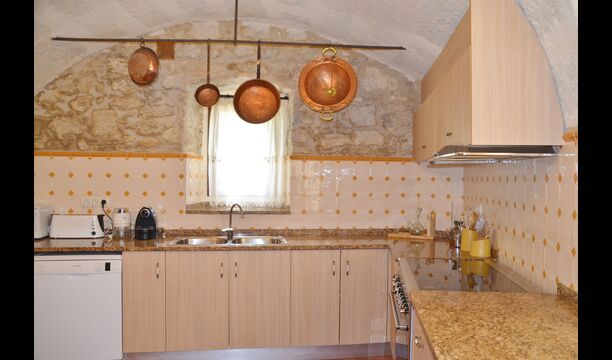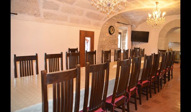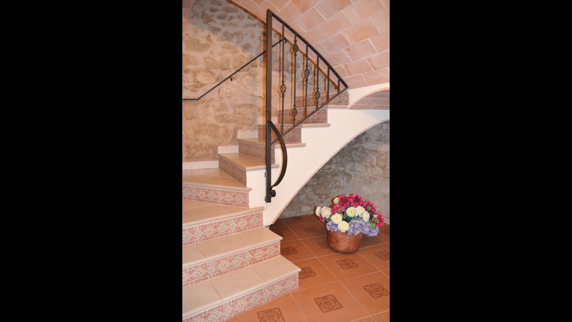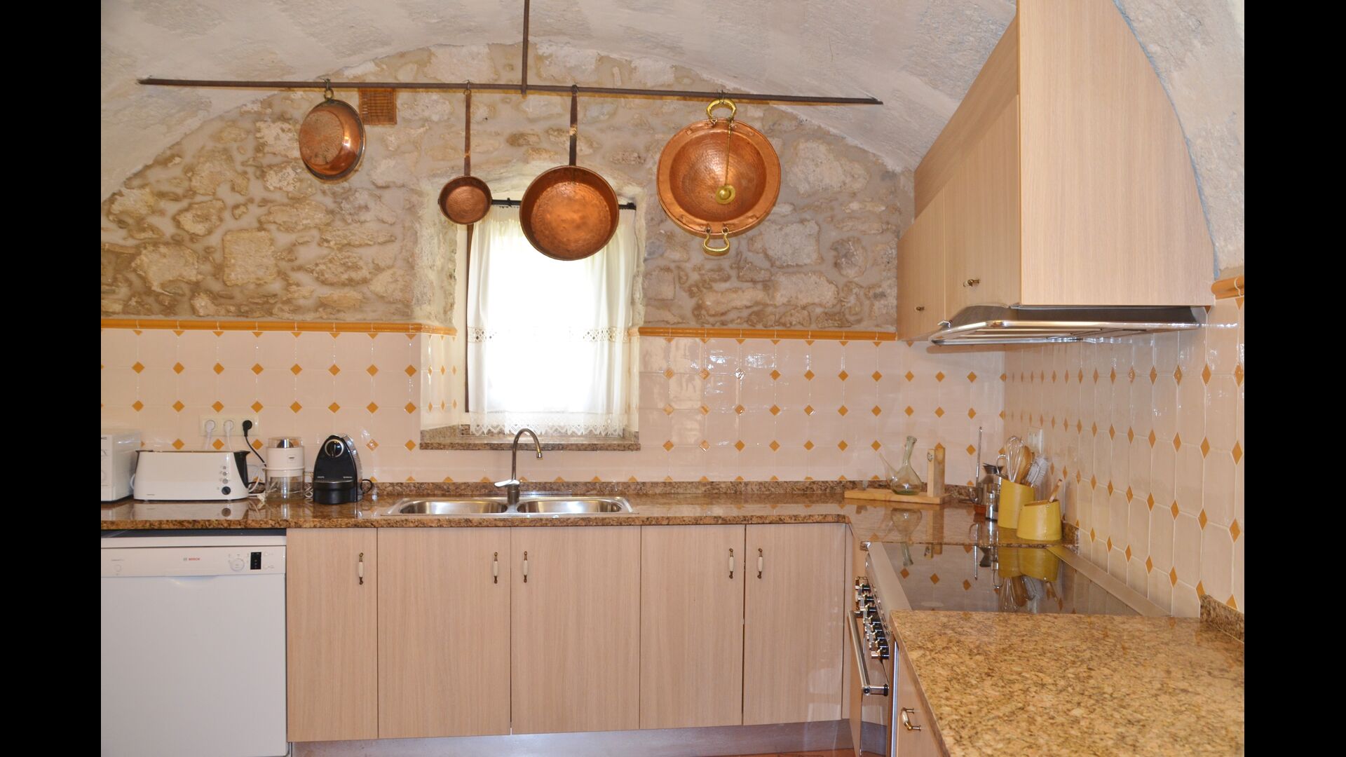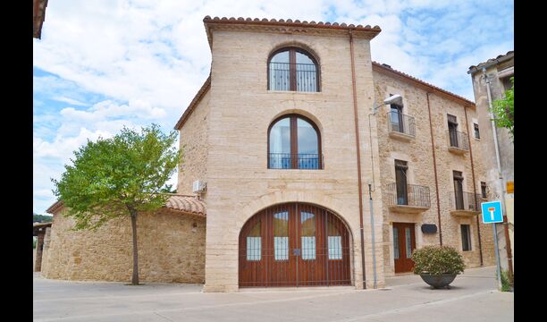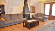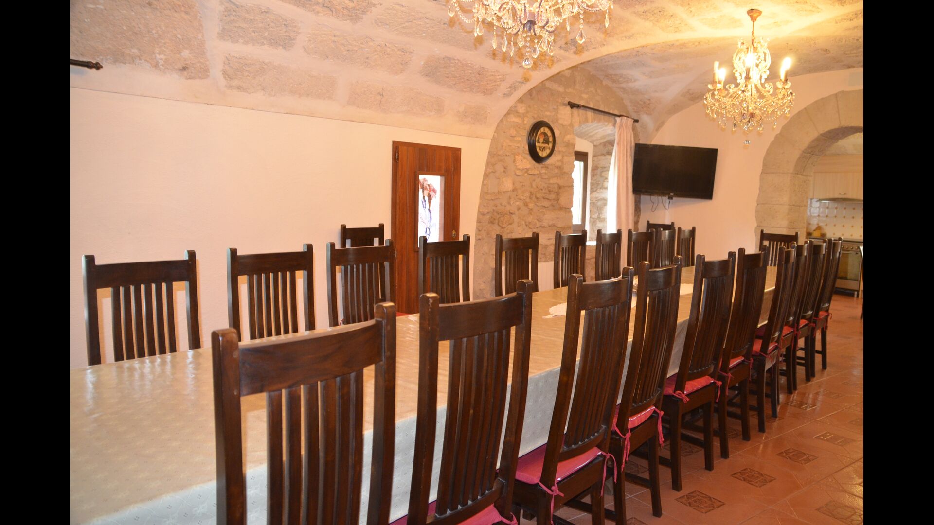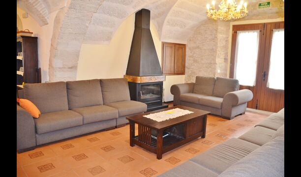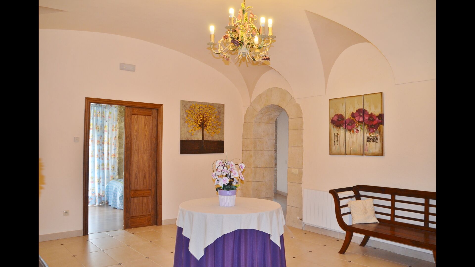 La casa está situada al lado de la gran iglesia de la ciudad, y se ingresa a la casa de vacaciones directamente desde la hermosa plaza de la iglesia. Cuando entras en la Masía de las Flores, que tiene un tamaño de 710 m2, te encuentras con una hermosa sala de estar con sofás grandes y cómodos y un televisor de pantalla plana. El interior de la casa es muy hermoso: el techo curvo y las hermosas puertas arqueadas brindan un ambiente amplio y excelente. Aquí, en la planta baja, también hay una cocina, y conectada a esto, hay una larga mesa de comedor.