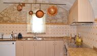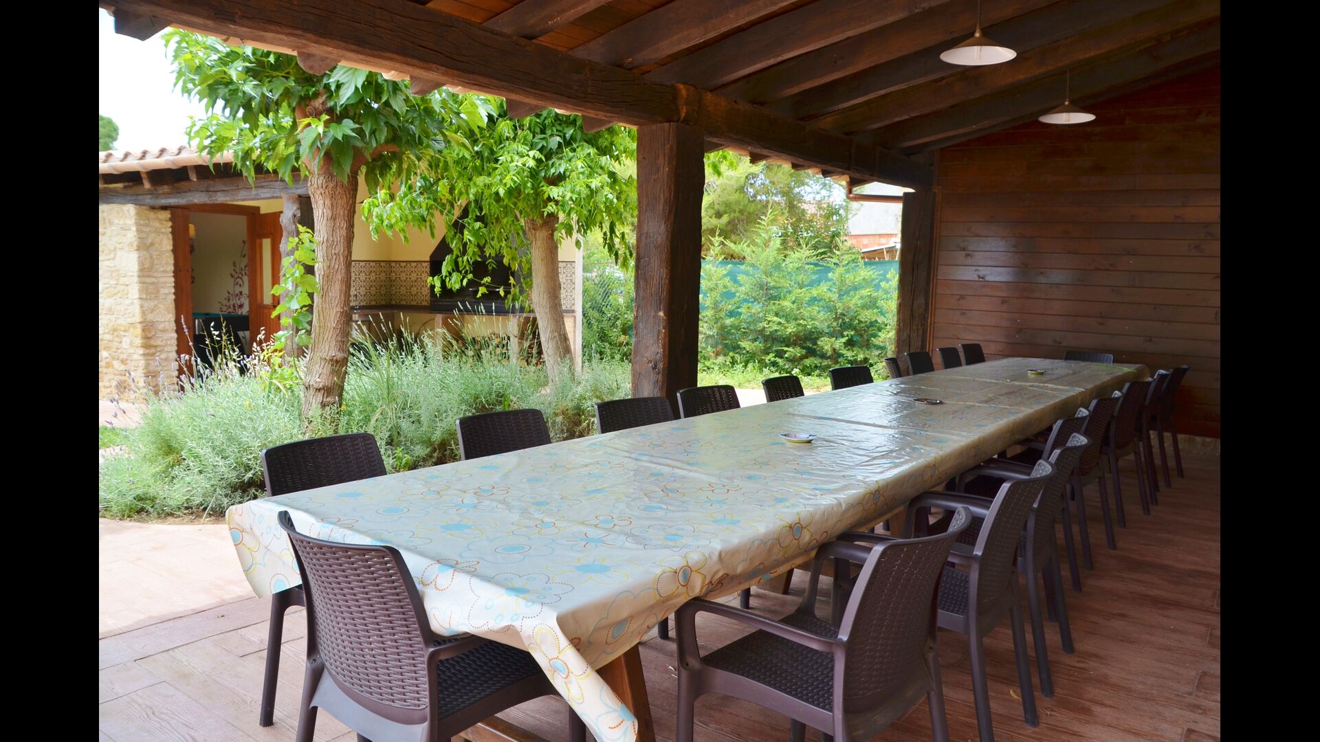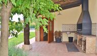 En el jardín, justo al lado de la casa, hay una gran terraza cubierta donde hay una gran parrilla de barbacoa y una cocina al aire libre. Junto a esto, hay una larga mesa de comedor. Aquí puede cocinar y disfrutar de la cena casera durante las cálidas horas de la noche.