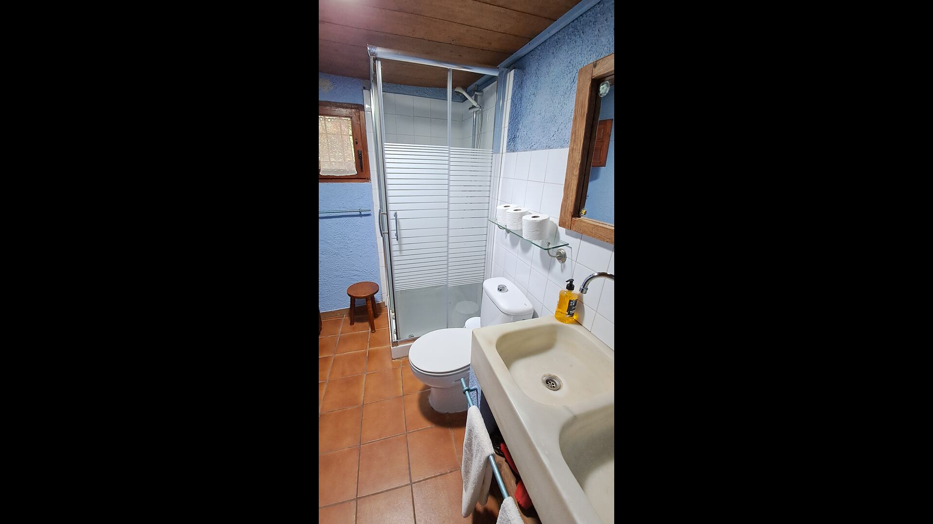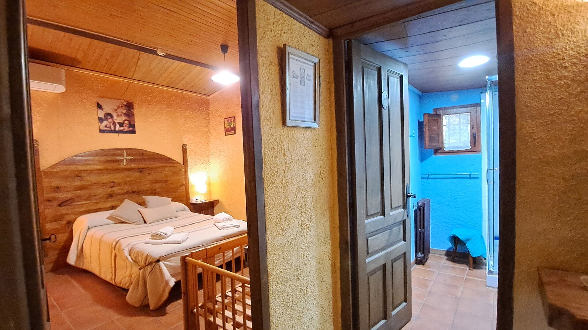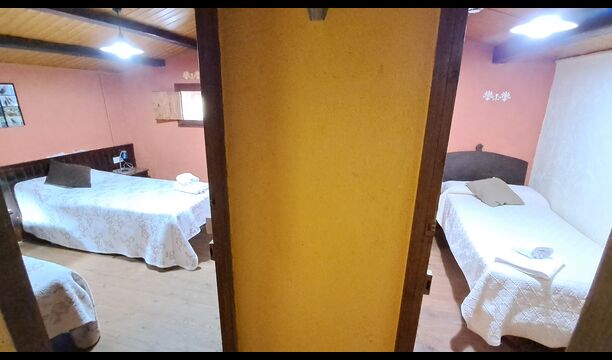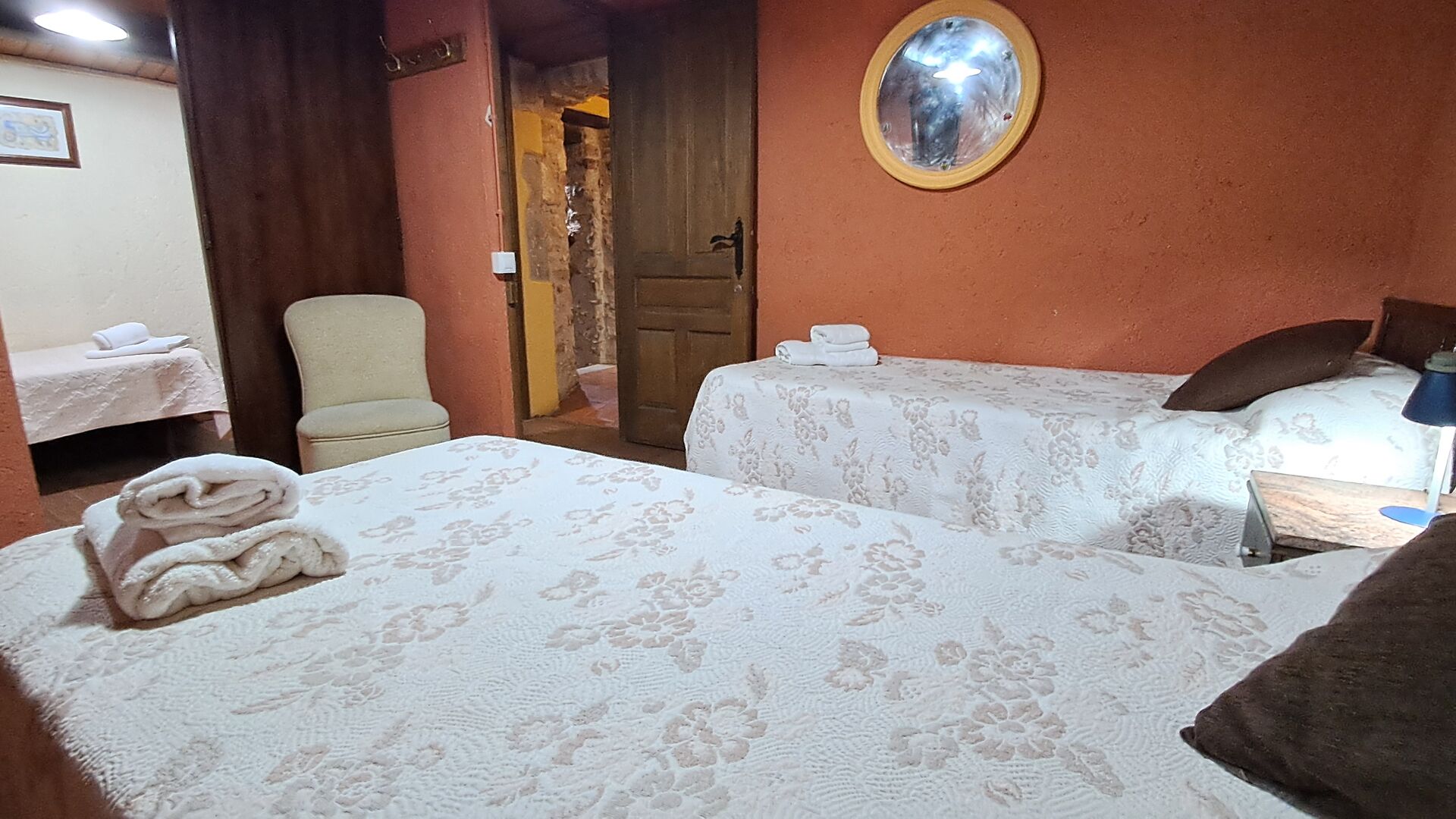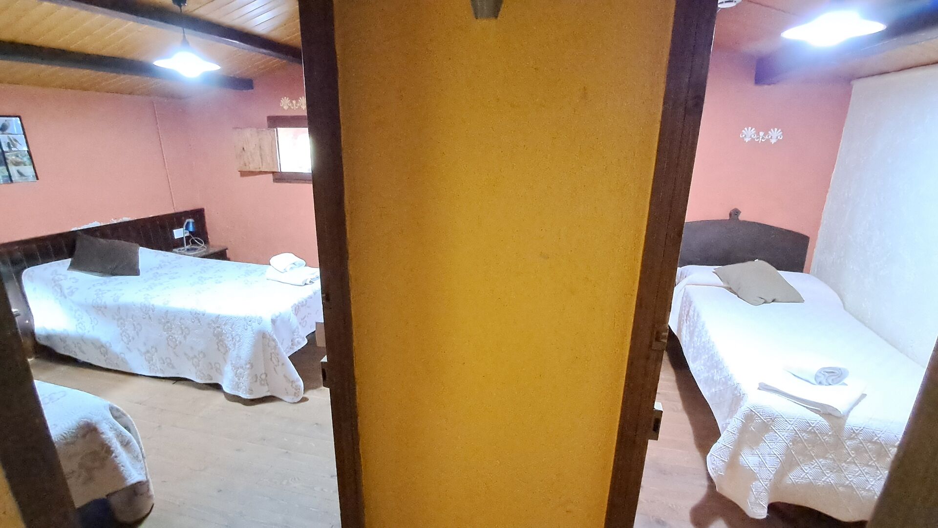 En el pis superior una sala amb sofàs i TV, d'on surten les portes de les habitacions i de l'altre bany amb dutxa. Hi ha tres habitacions: una amb llit de matrimoni, una altra habitació és triple i l'habitació més gran està dividida per una porta poden utilitzar-la com una habitació doble i una individual independent o bé com una de triple. Hi ha un bressol a la vostra disposició. En total té una capacitat per a 8 persones en tres habitacions.