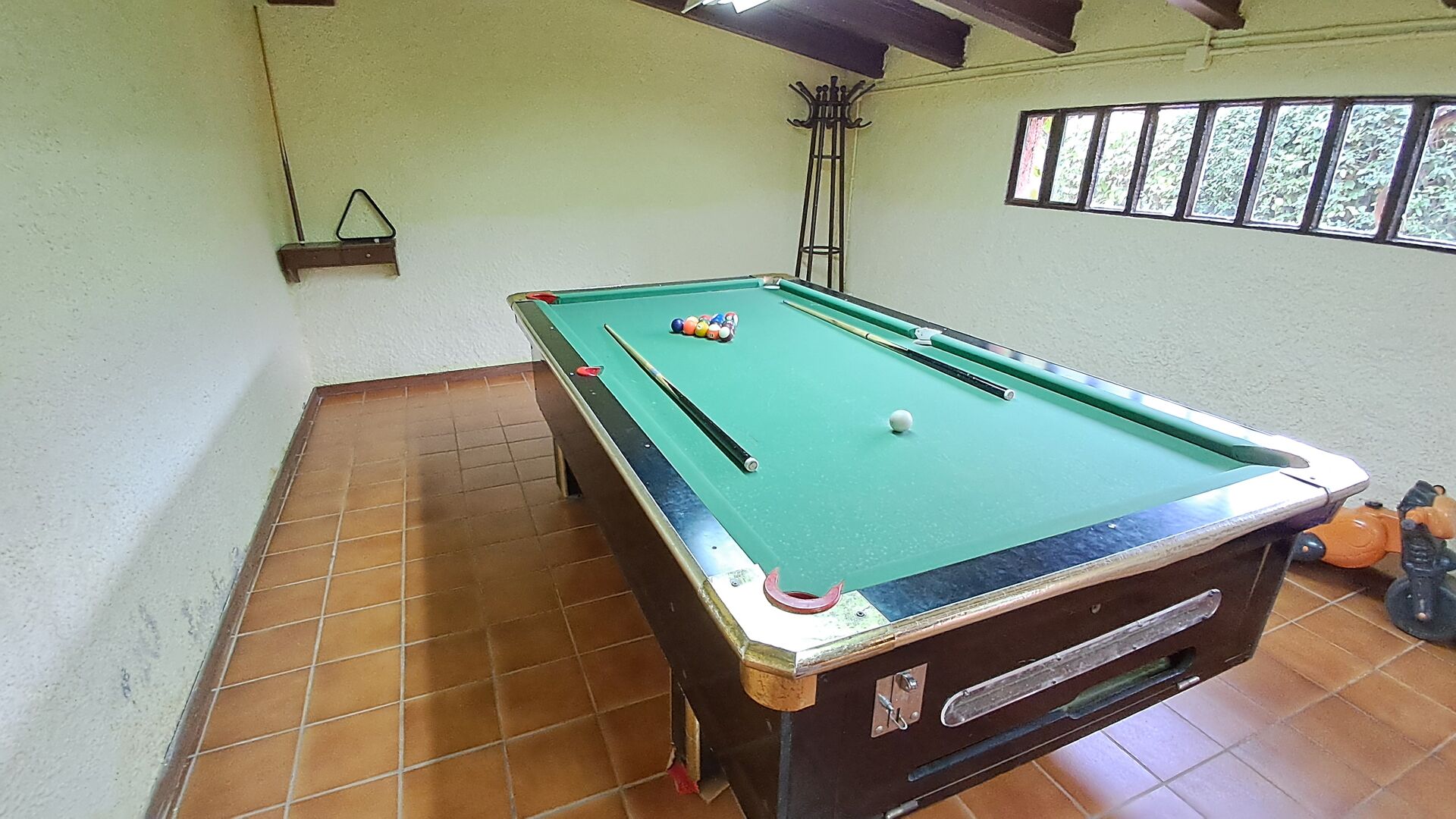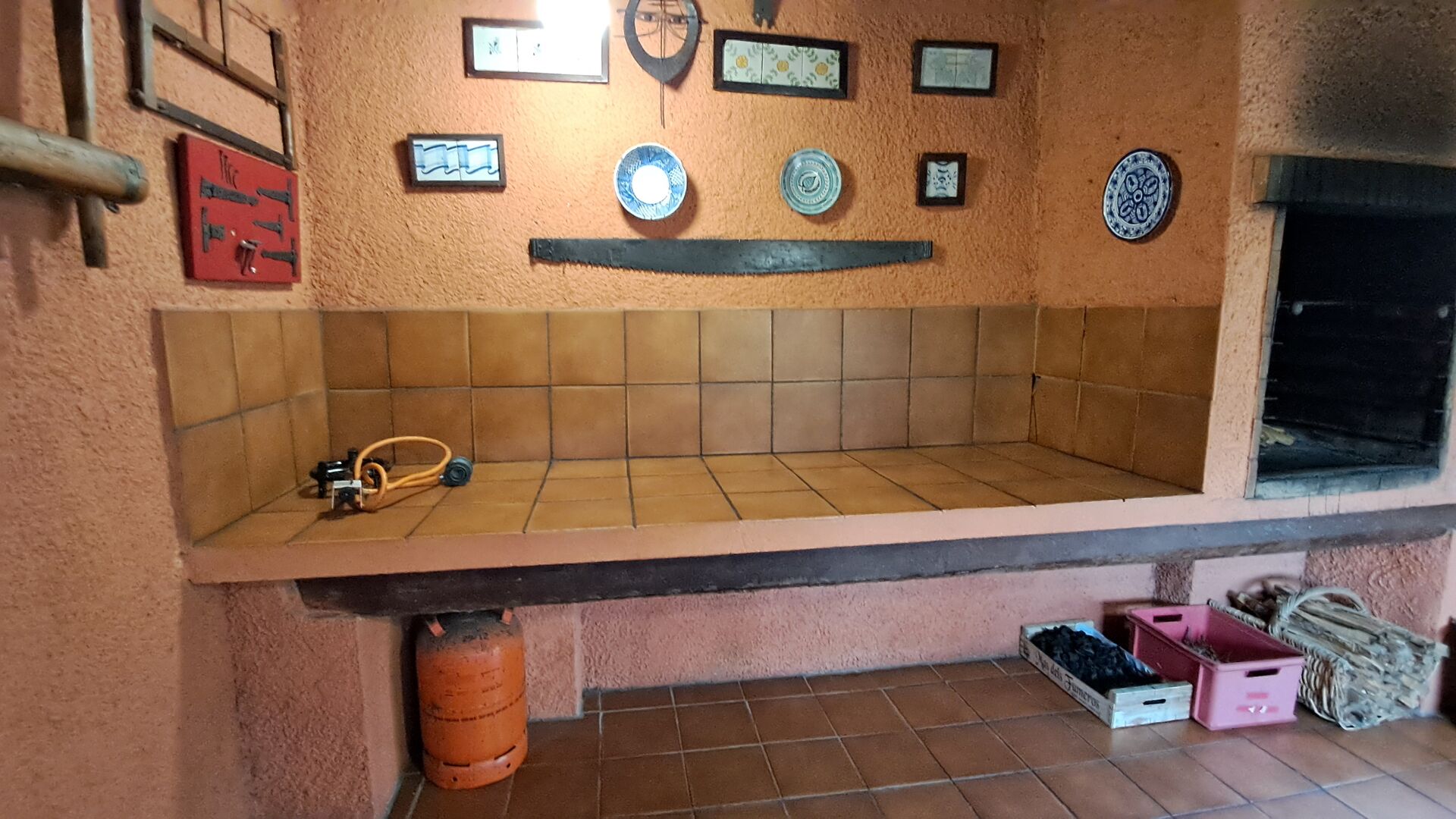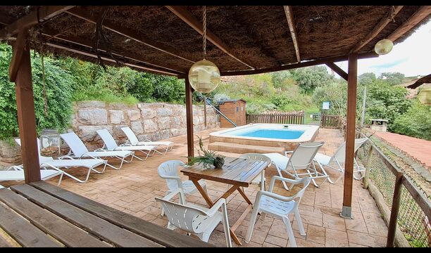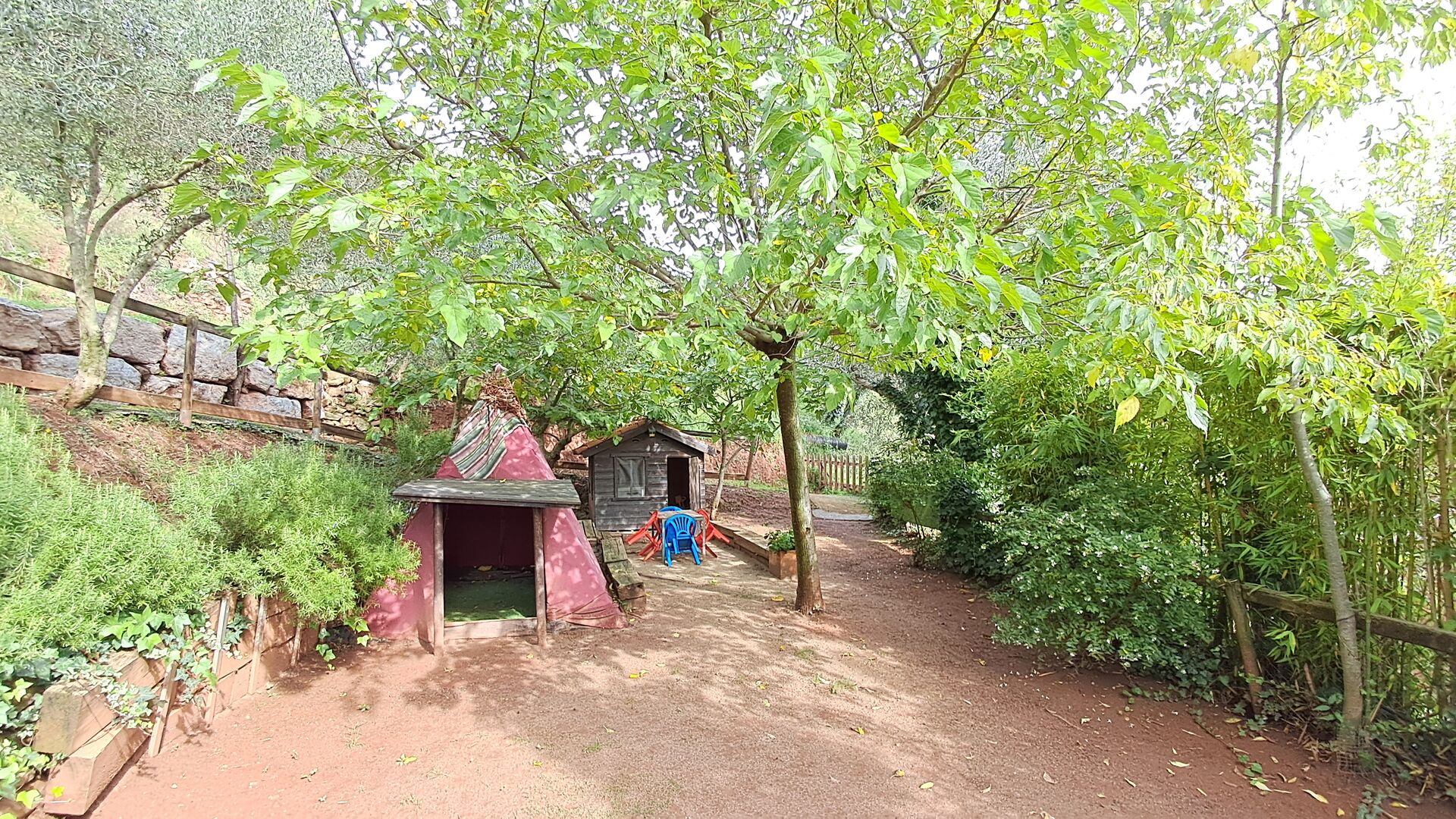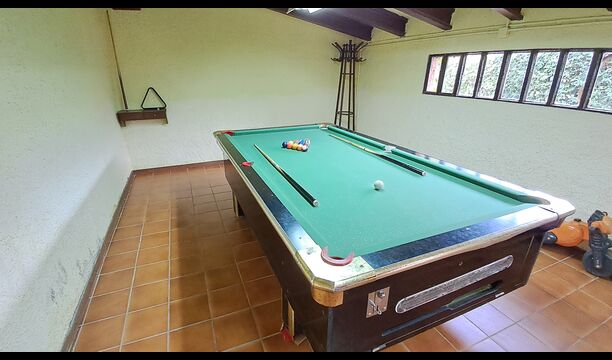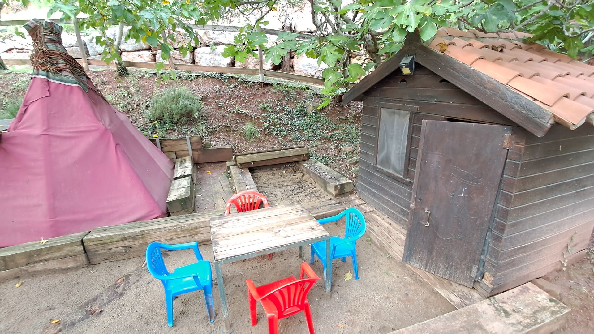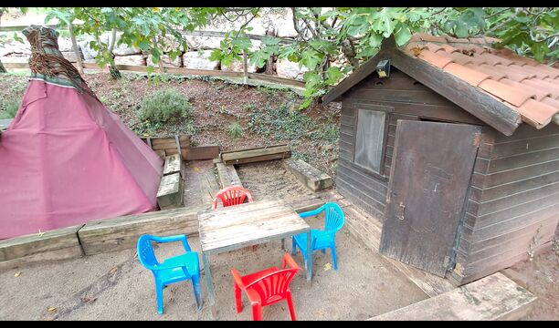 La casa està situada en el vessant de la muntanya. A la vostra esquerra trobéssiu la zona de la barbacoa coberta i en el jardí taules i cadires de fusta per si voleu fer un pícnic, prendre el sol o buscar la ombra, al mateix nivell està la zona per a nens amb una caseta de fusta, una tenda d'indis, joguines, cadires i una tauleta, així podreu veure'ls mentre preneu l'aperitiu tranquil·lament. Pels més grans o els adults amb ganes de passar-ho bé, està a la vostra disposició la sala amb billar, futbolin (l'autèntic de fusta i metall) i en l'exterior petanca i pin-*pong.