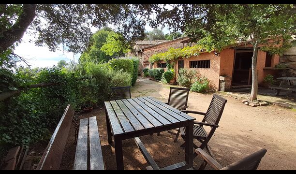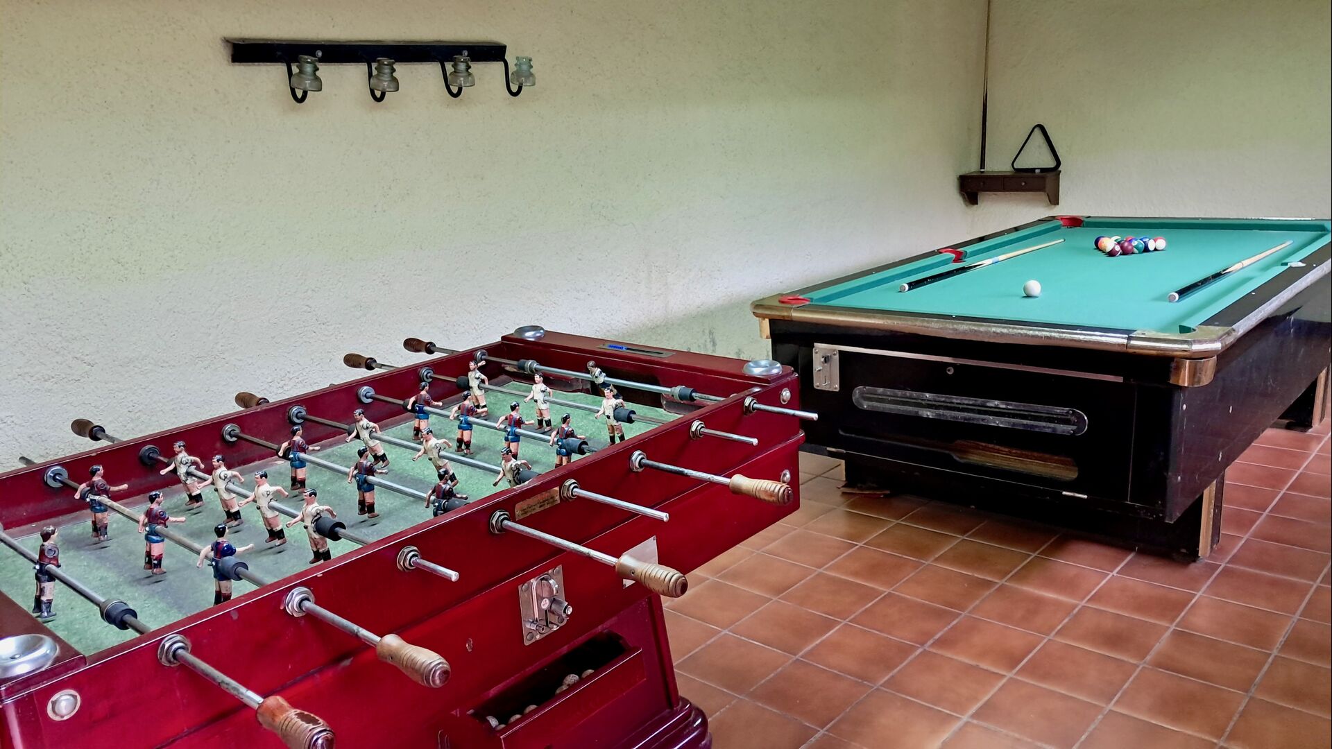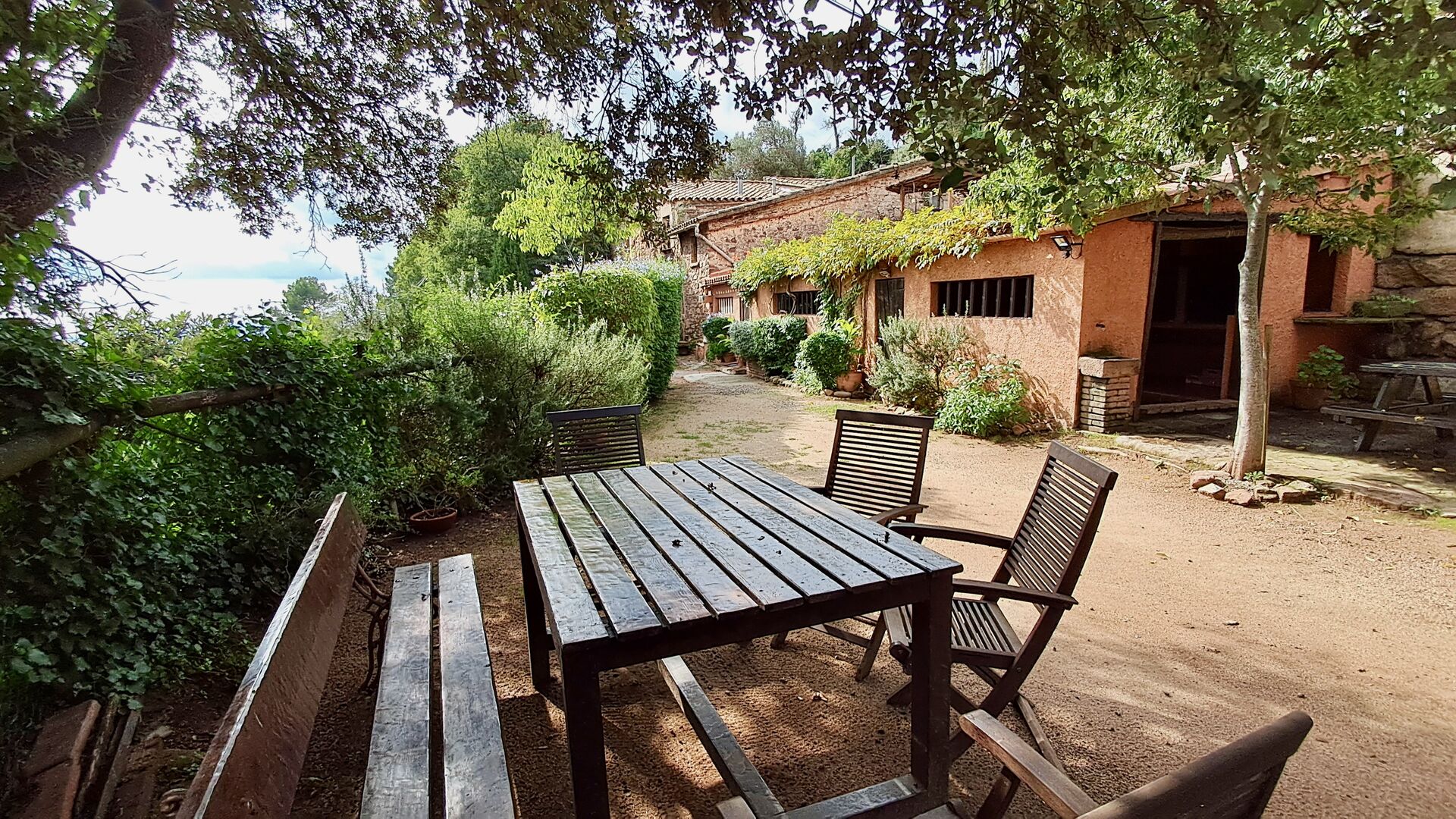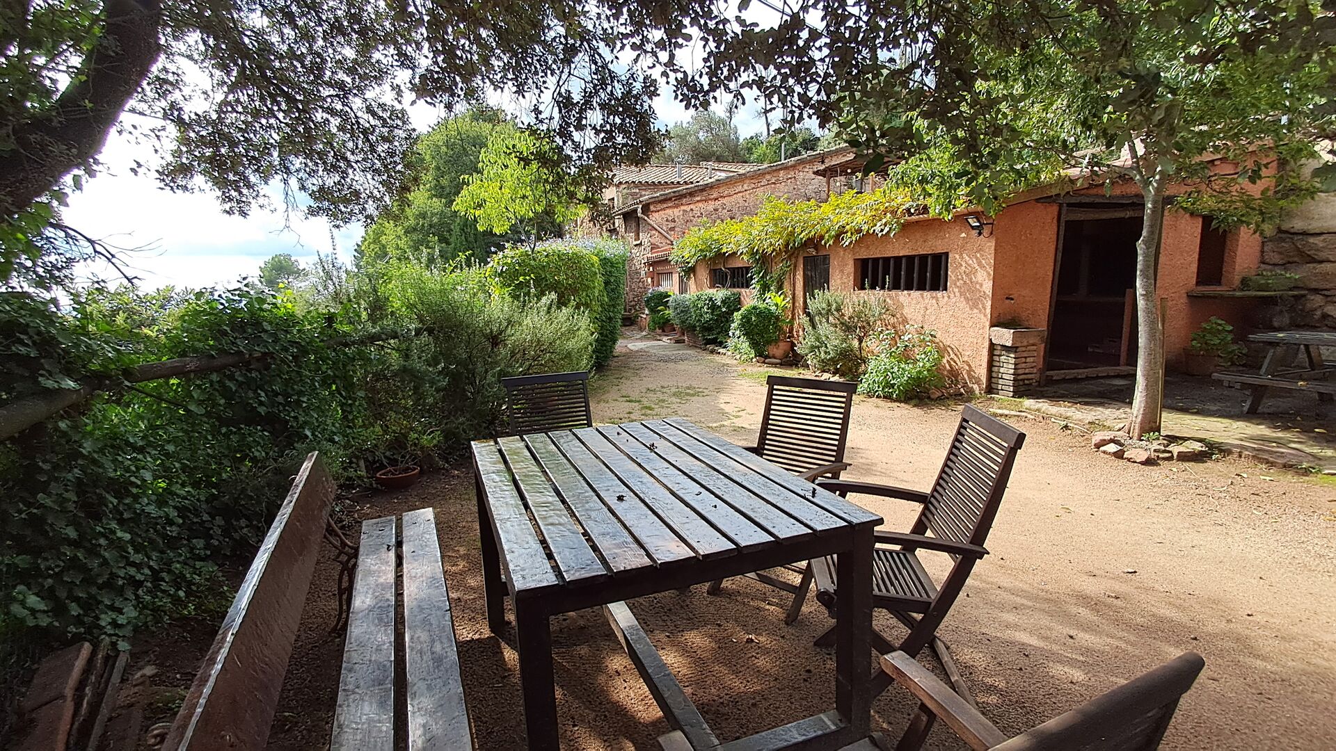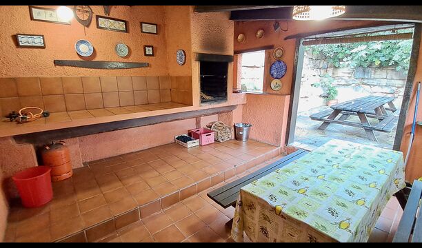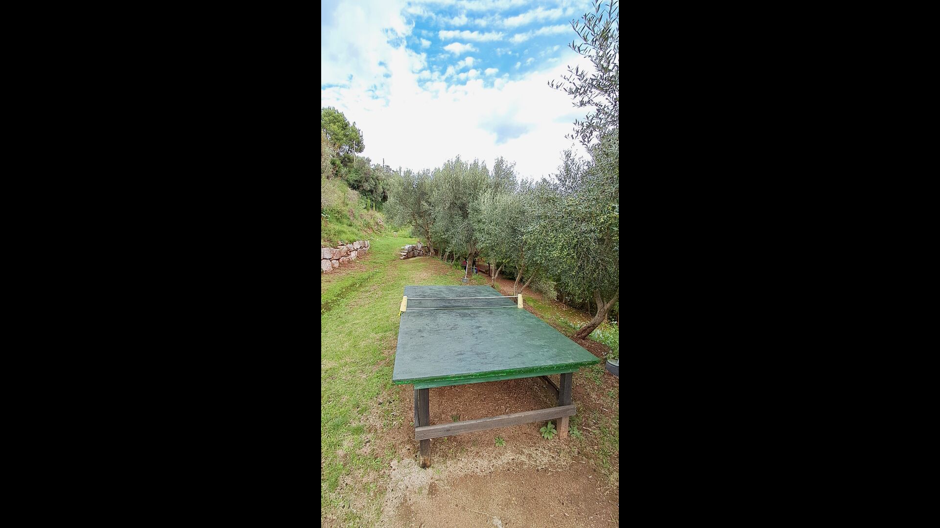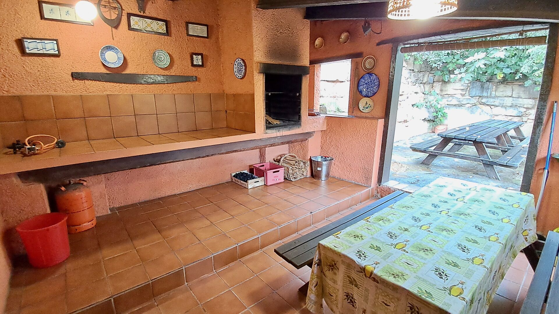 La casa està situada en el vessant de la muntanya. A la vostra esquerra trobéssiu la zona de la barbacoa coberta i en el jardí taules i cadires de fusta per si voleu fer un pícnic, prendre el sol o buscar la ombra, al mateix nivell està la zona per a nens amb una caseta de fusta, una tenda d'indis, joguines, cadires i una tauleta, així podreu veure'ls mentre preneu l'aperitiu tranquil·lament. Pels més grans o els adults amb ganes de passar-ho bé, està a la vostra disposició la sala amb billar, futbolin (l'autèntic de fusta i metall) i en l'exterior petanca i pin-*pong.