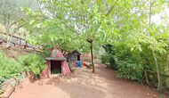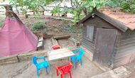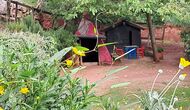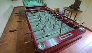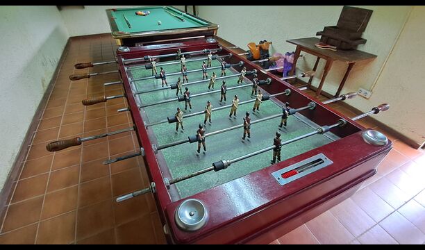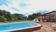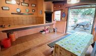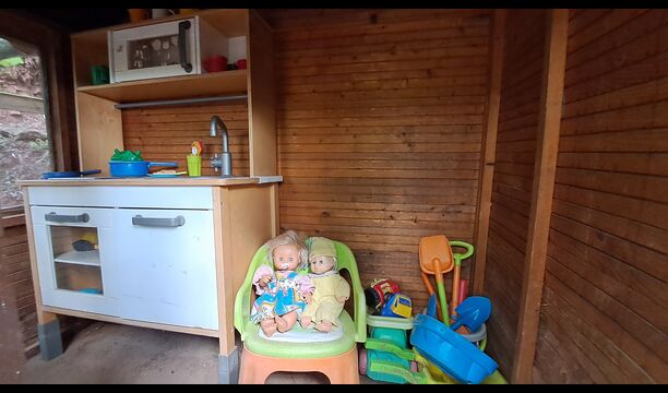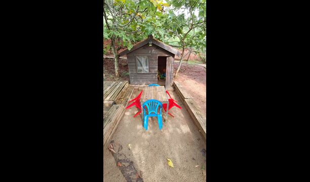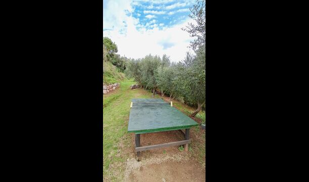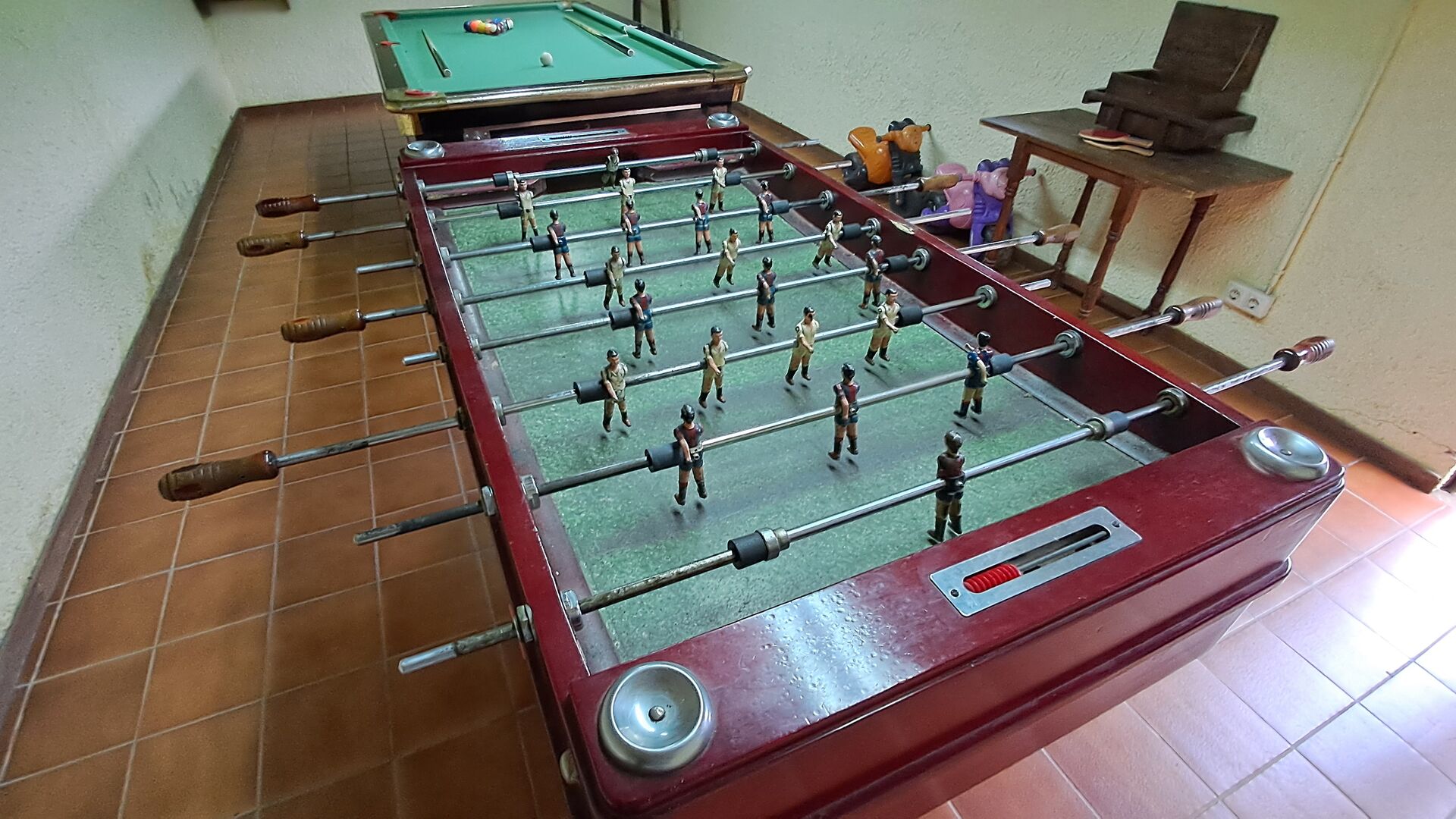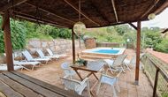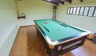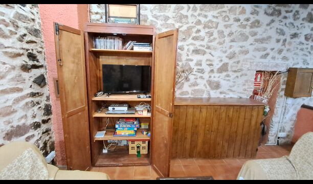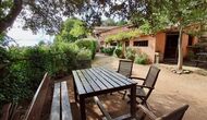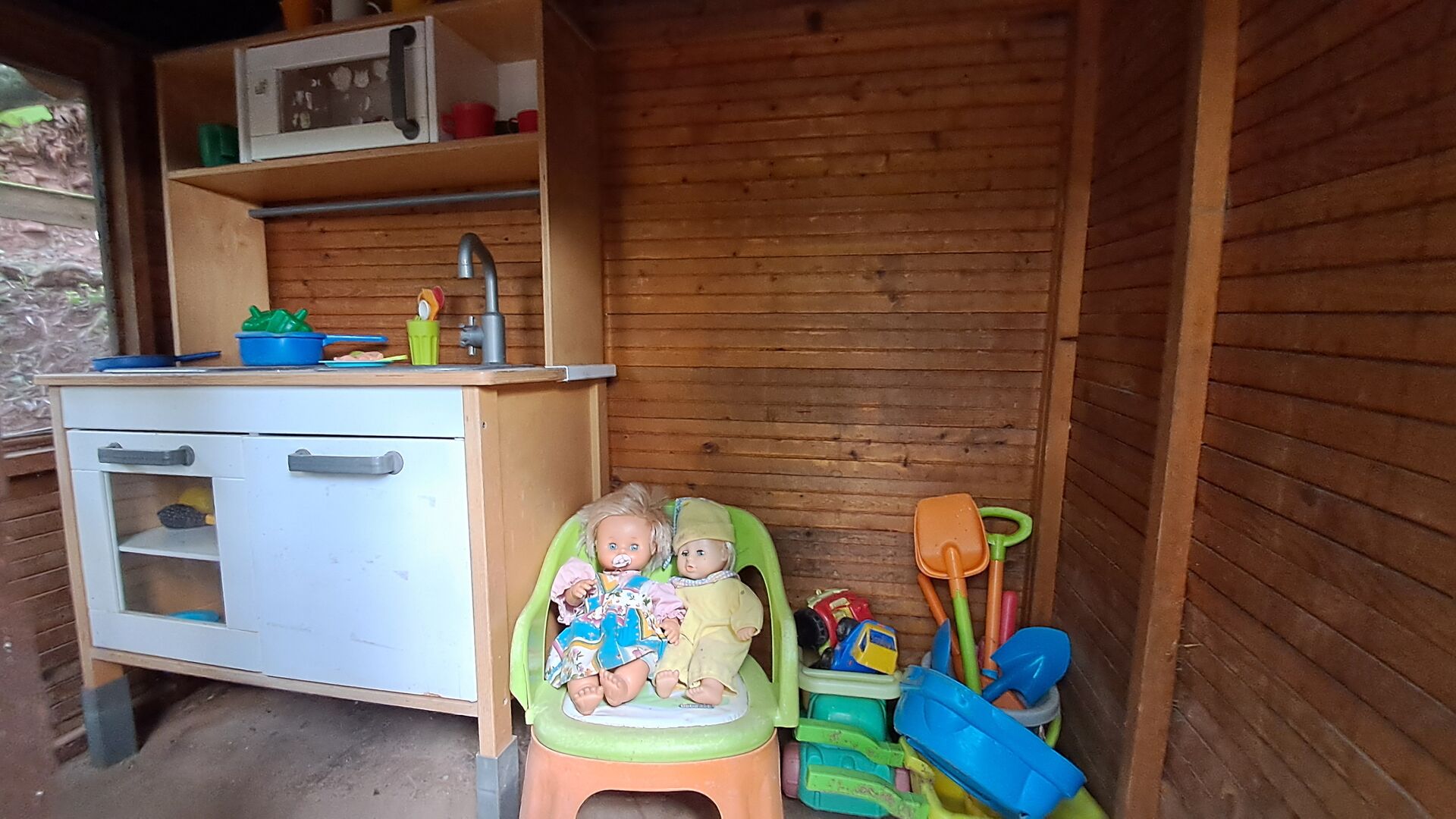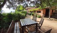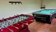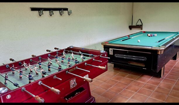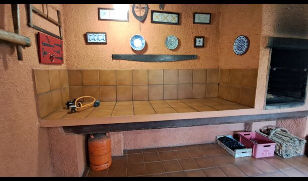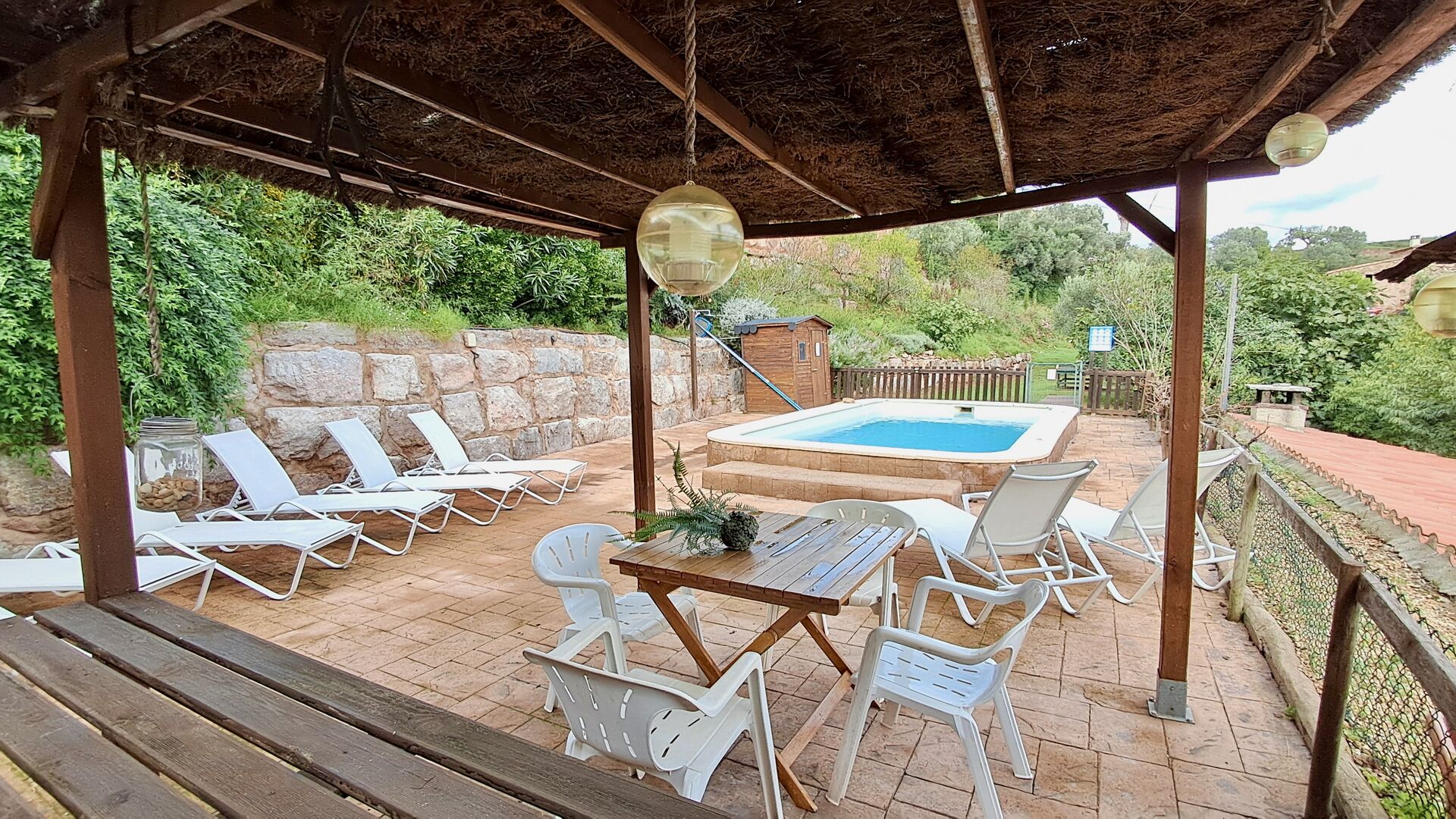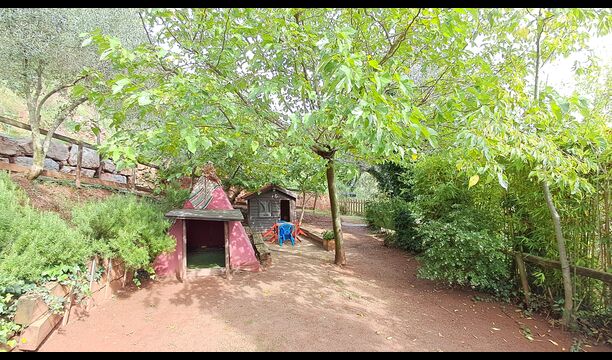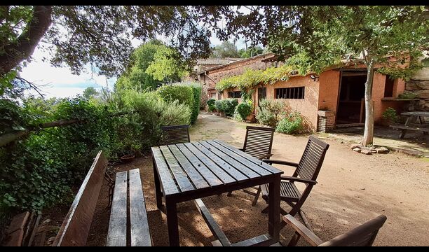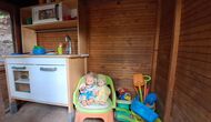 La casa està situada en el vessant de la muntanya. A la vostra esquerra trobéssiu la zona de la barbacoa coberta i en el jardí taules i cadires de fusta per si voleu fer un pícnic, prendre el sol o buscar la ombra, al mateix nivell està la zona per a nens amb una caseta de fusta, una tenda d'indis, joguines, cadires i una tauleta, així podreu veure'ls mentre preneu l'aperitiu tranquil·lament. Pels més grans o els adults amb ganes de passar-ho bé, està a la vostra disposició la sala amb billar, futbolin (l'autèntic de fusta i metall) i en l'exterior petanca i pin-*pong.