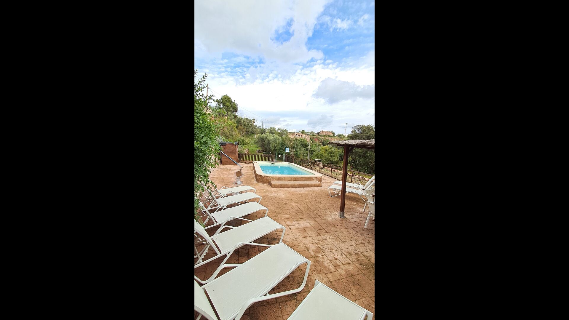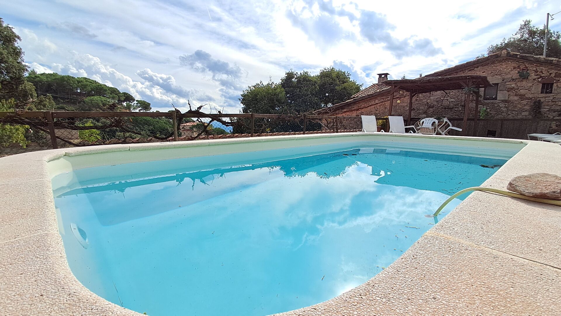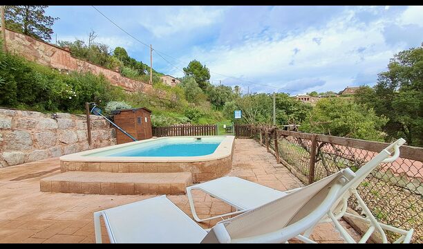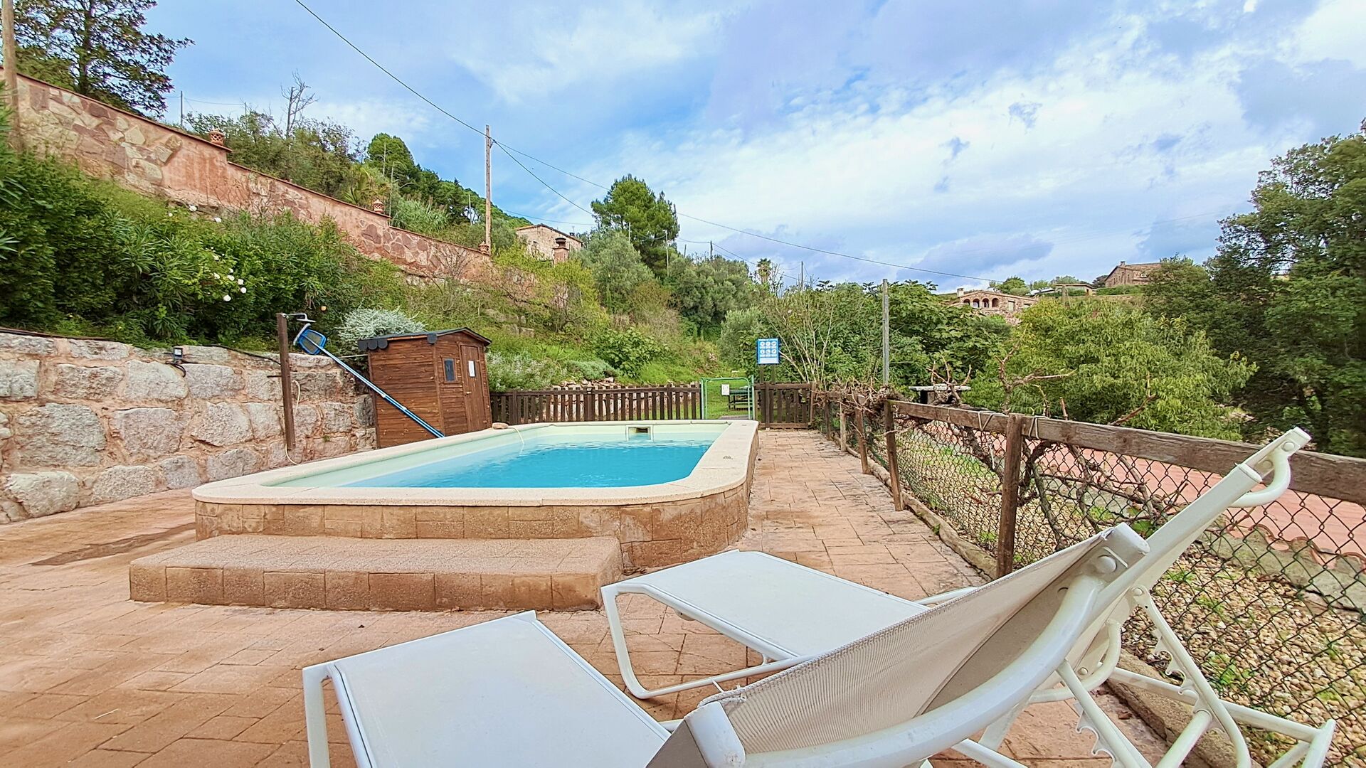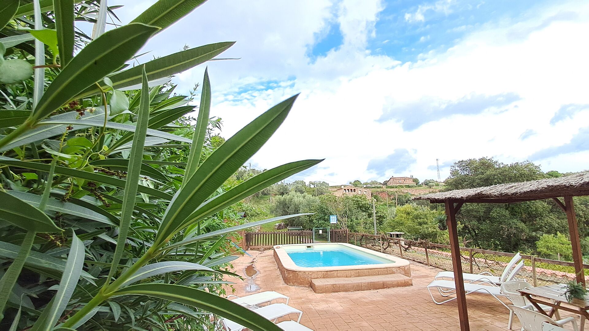 En un nivell superior del jardí està situada la piscina de 8x4 metres i 1,5 de profunditat (Màxima profunditat per llei).Per a major seguretat està envoltada per una tanca amb porta i candau i la piscina està sobrelevada del sòl uns 50cm. En aquesta zona teniu una vista sensacional i aquesta envoltada de vegetació típica de la zona, oliveres, parres, figueres, romaní que us brindaran els seus fruits segons sigui l'època de l'any.