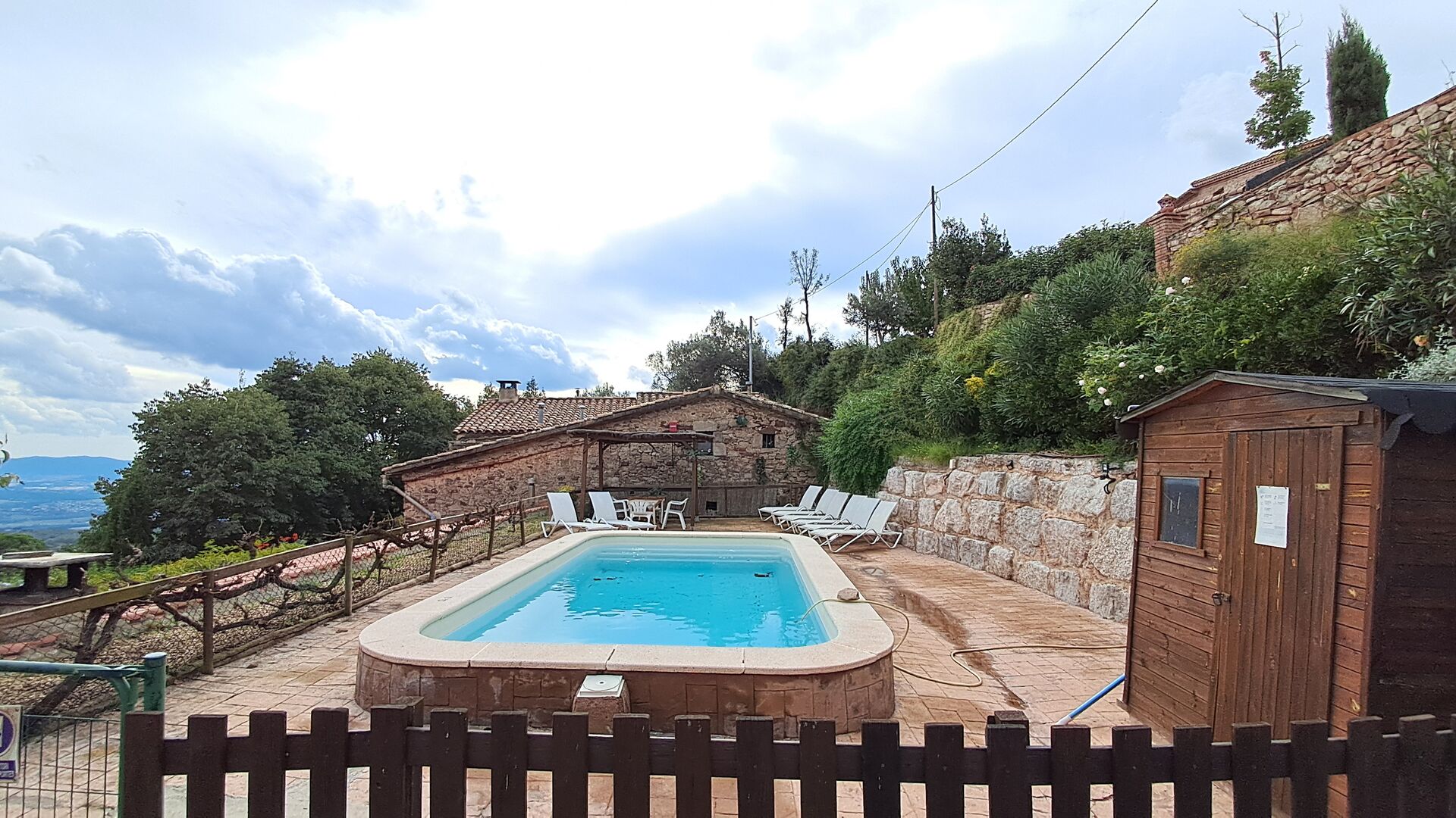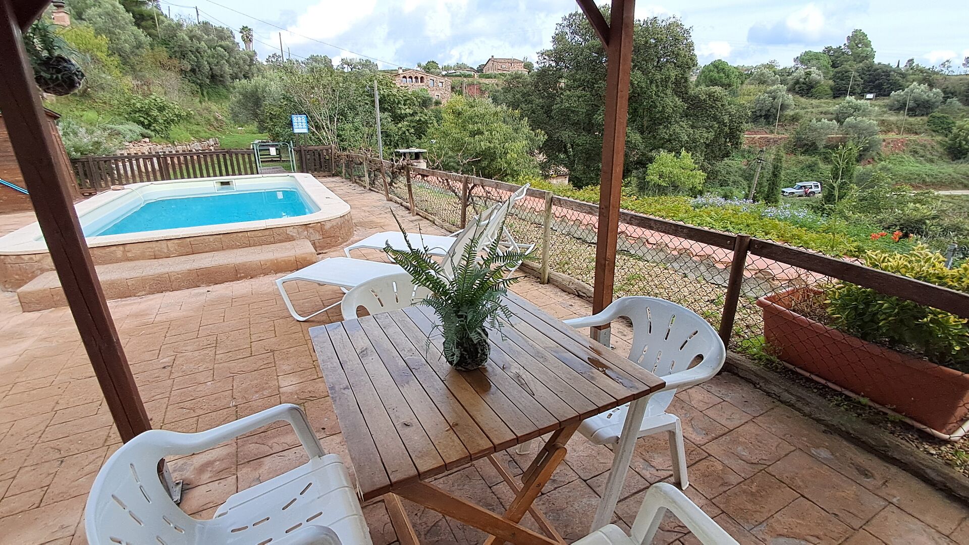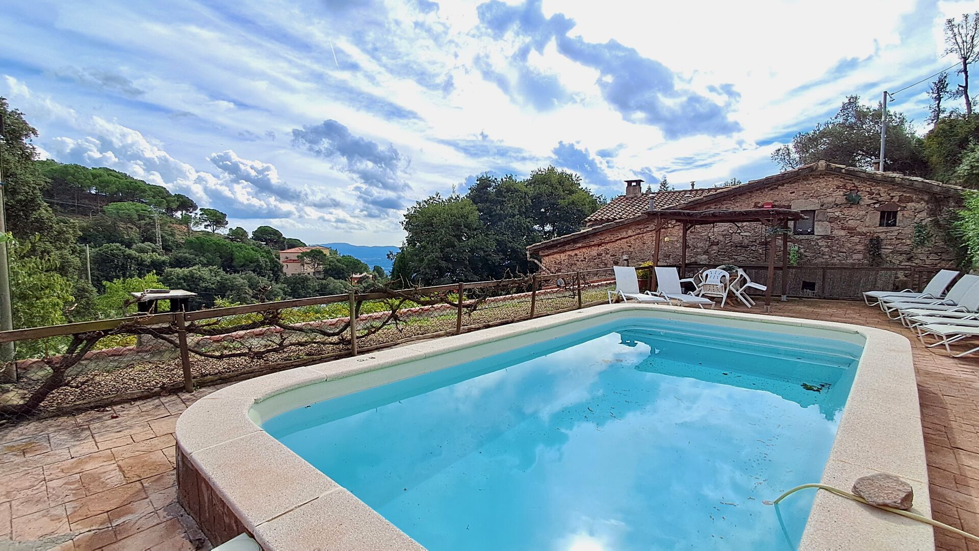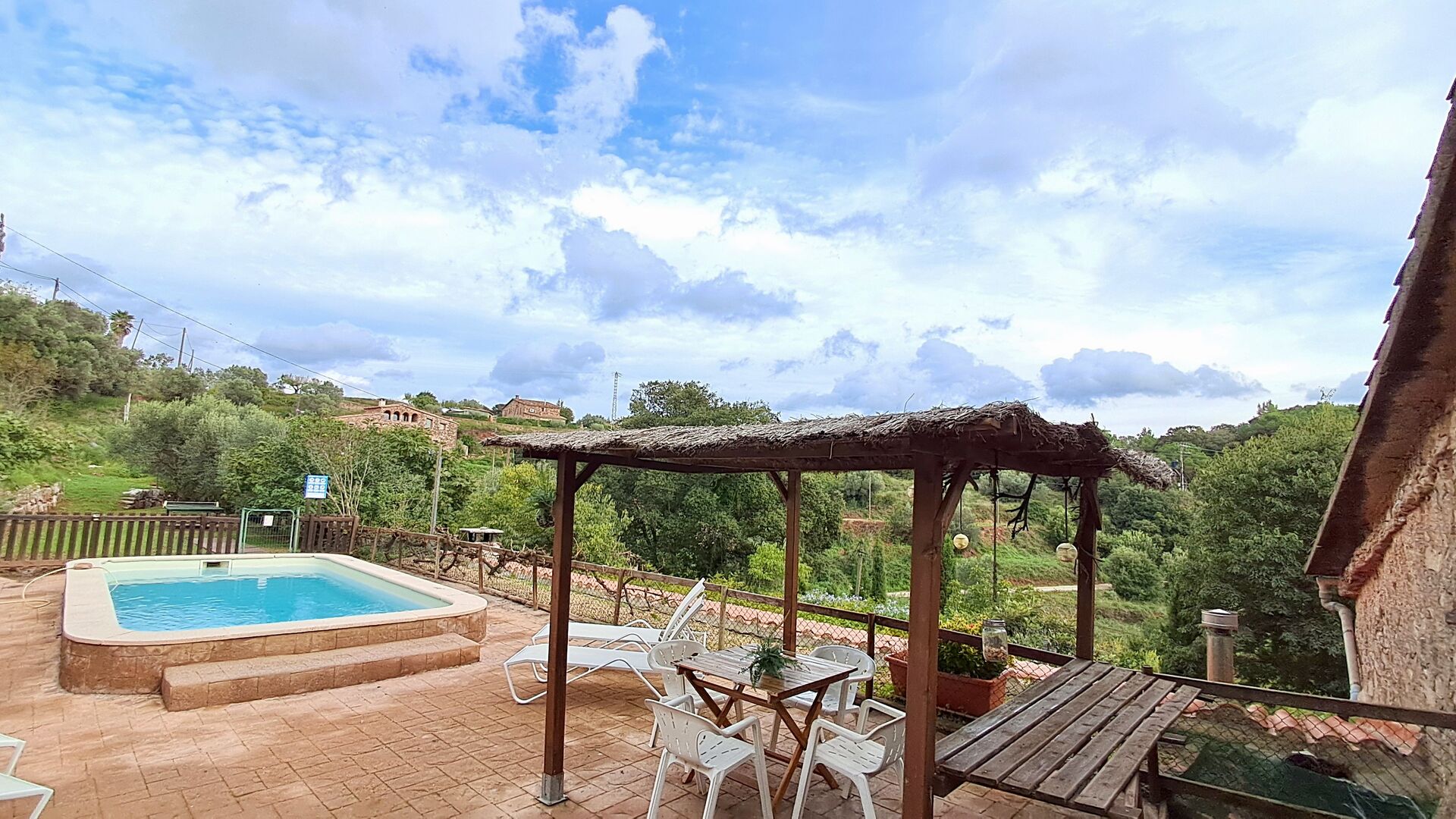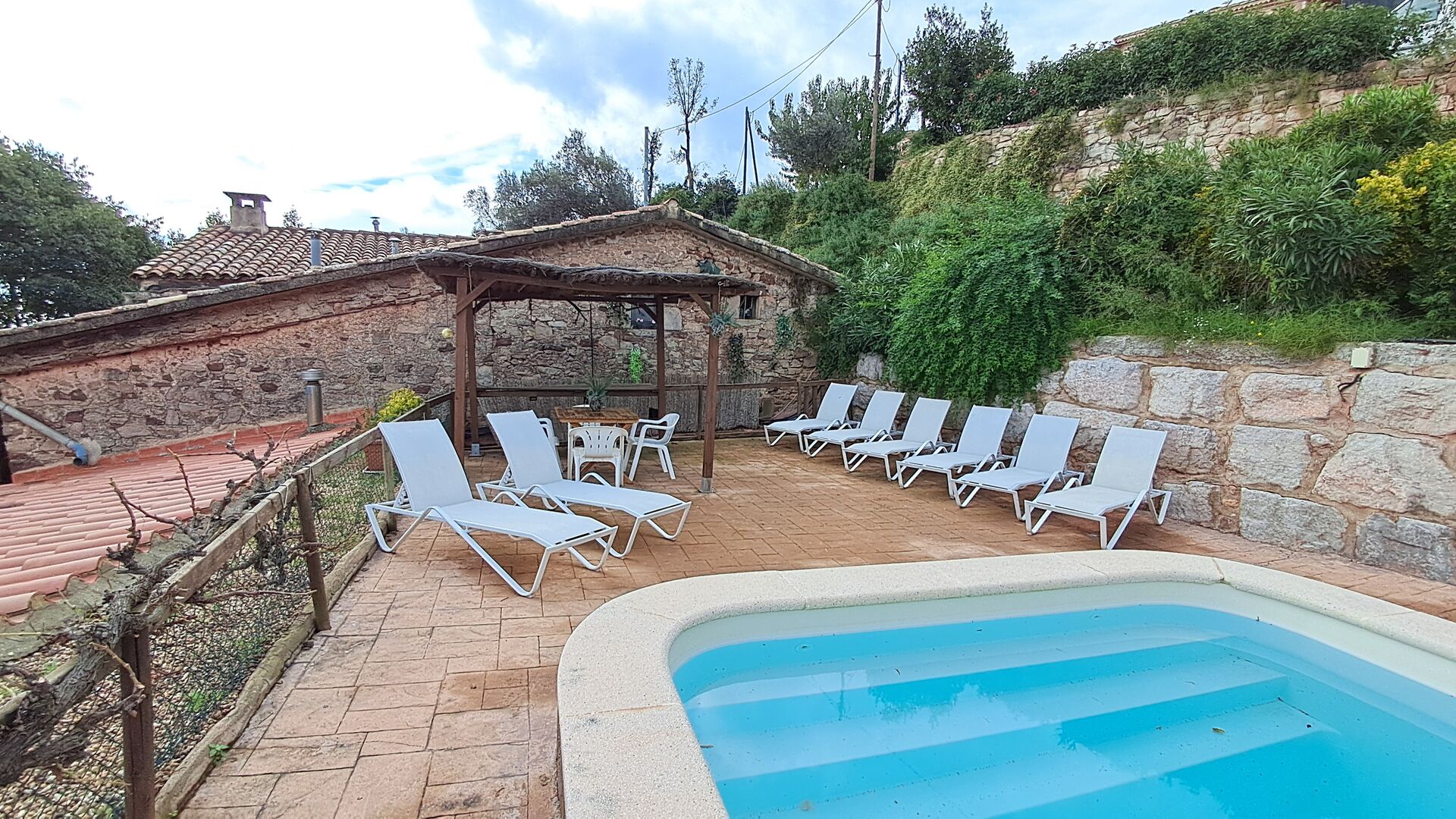 En un nivell superior del jardí està situada la piscina de 8x4 metres i 1,5 de profunditat (Màxima profunditat per llei).Per a major seguretat està envoltada per una tanca amb porta i candau i la piscina està sobrelevada del sòl uns 50cm. En aquesta zona teniu una vista sensacional i aquesta envoltada de vegetació típica de la zona, oliveres, parres, figueres, romaní que us brindaran els seus fruits segons sigui l'època de l'any.
