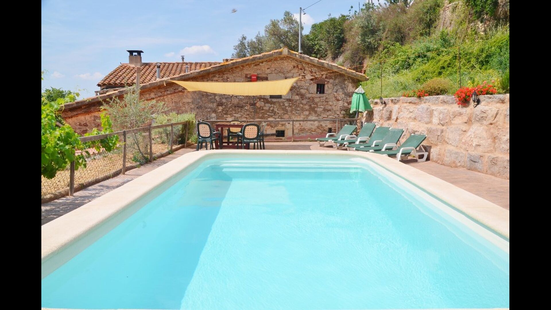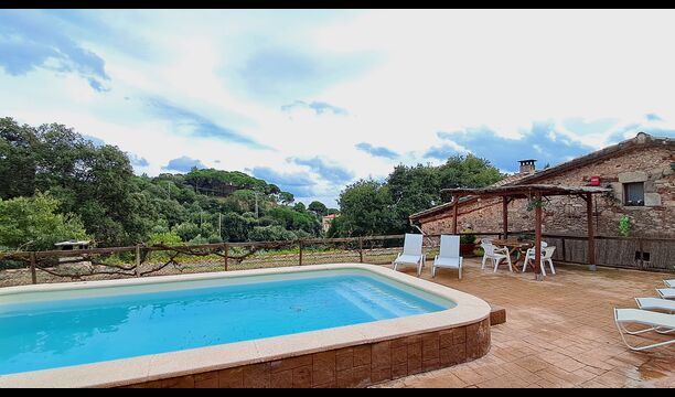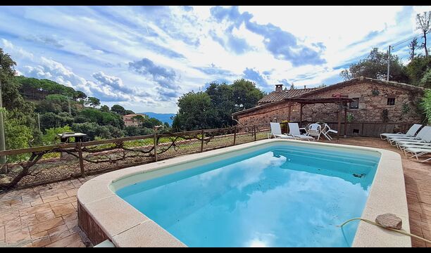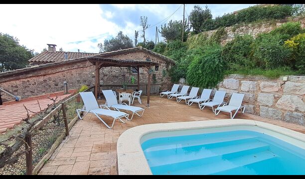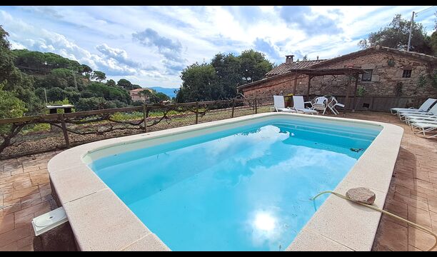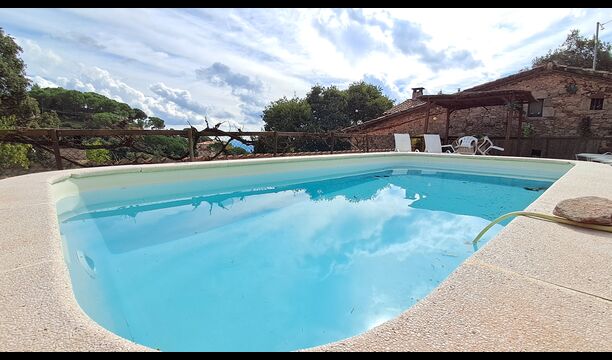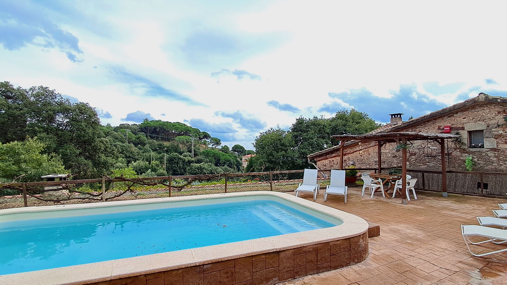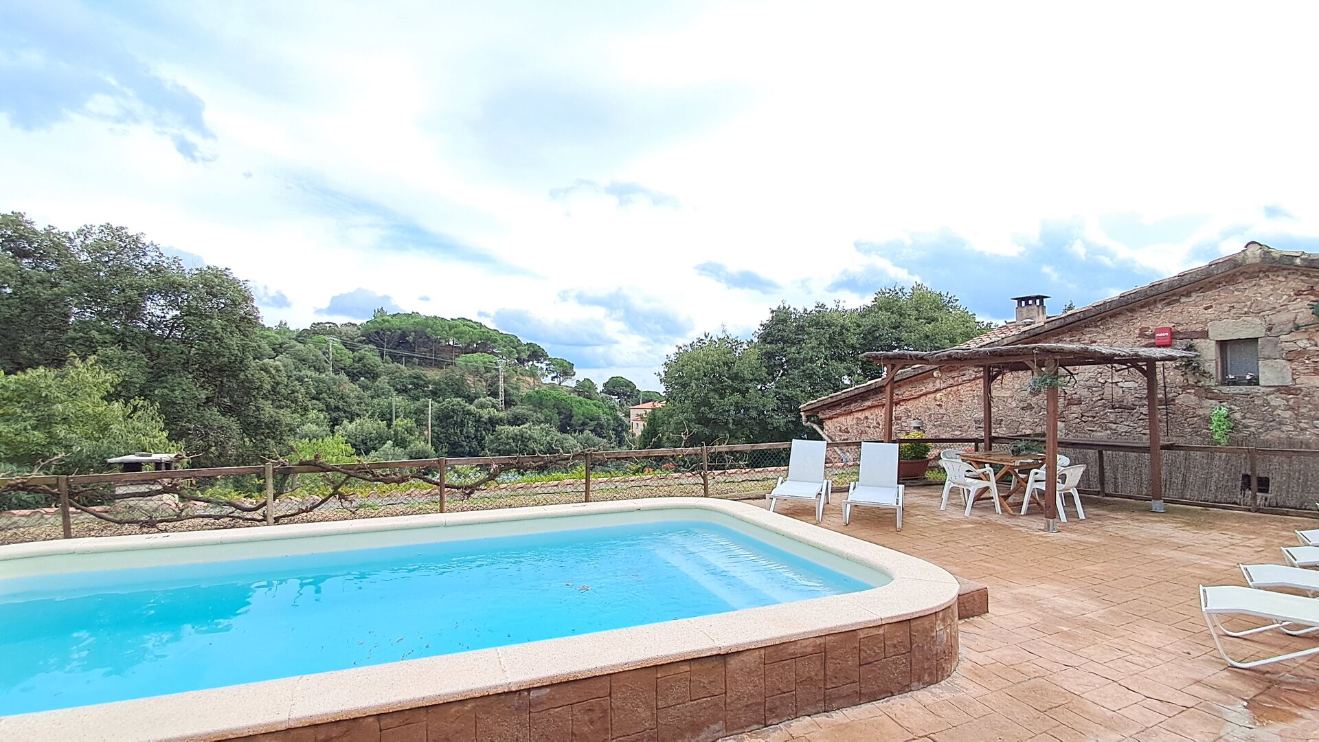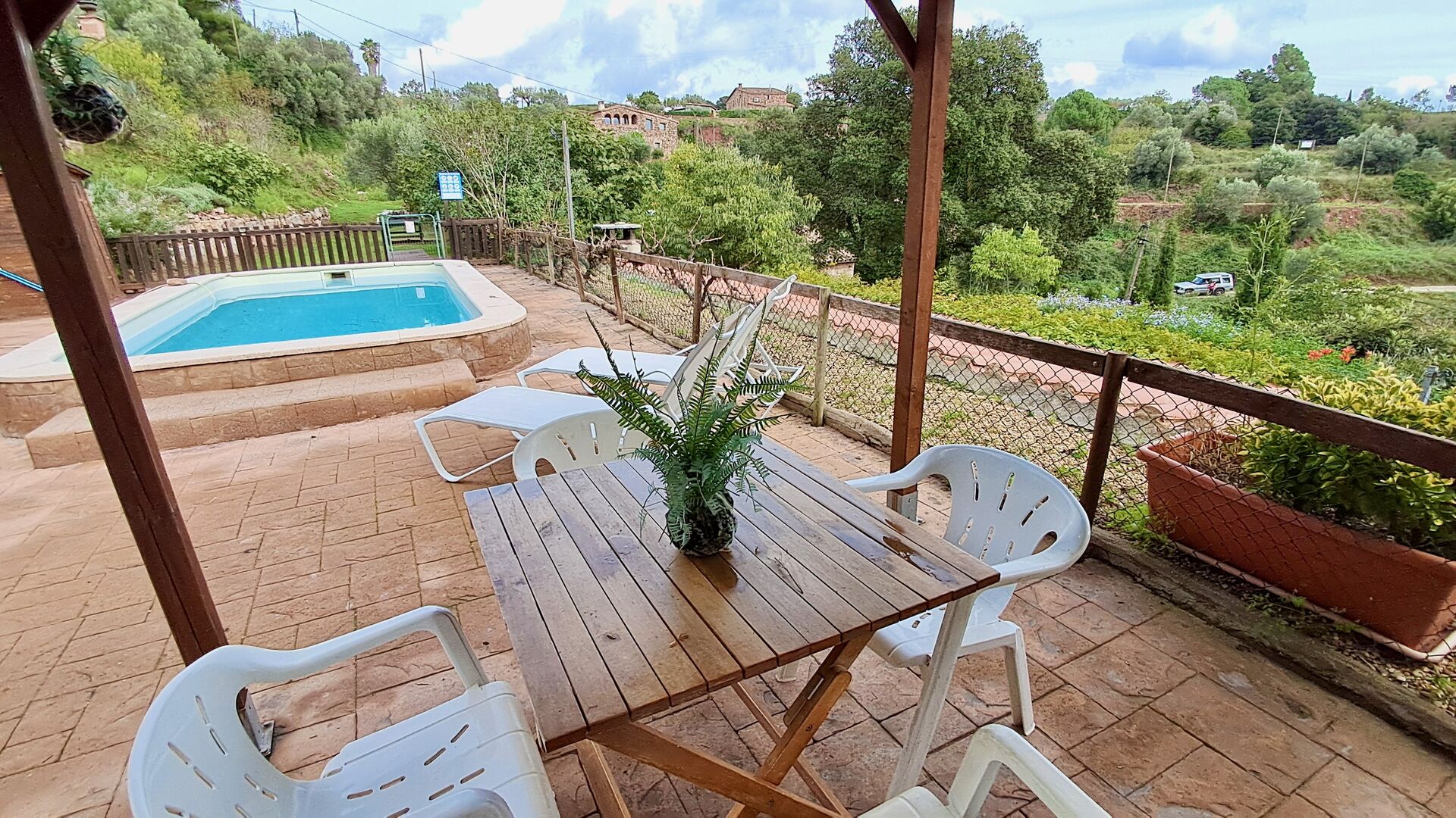 En un nivell superior del jardí està situada la piscina de 8x4 metres i 1,5 de profunditat (Màxima profunditat per llei).Per a major seguretat està envoltada per una tanca amb porta i candau i la piscina està sobrelevada del sòl uns 50cm. En aquesta zona teniu una vista sensacional i aquesta envoltada de vegetació típica de la zona, oliveres, parres, figueres, romaní que us brindaran els seus fruits segons sigui l'època de l'any.