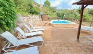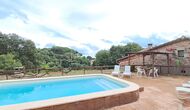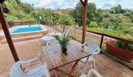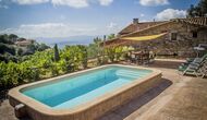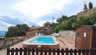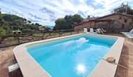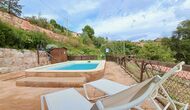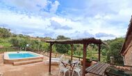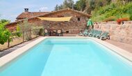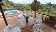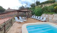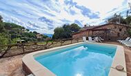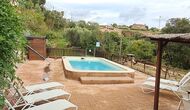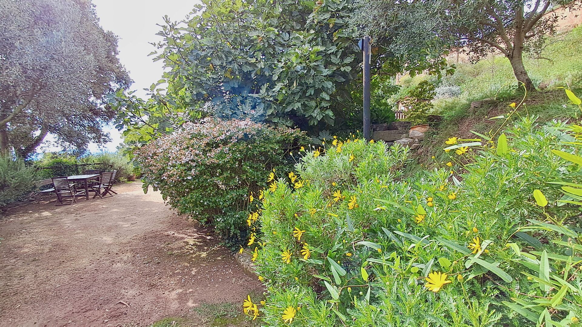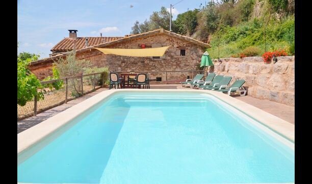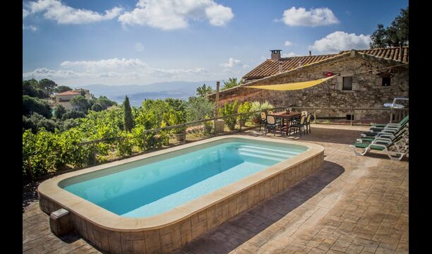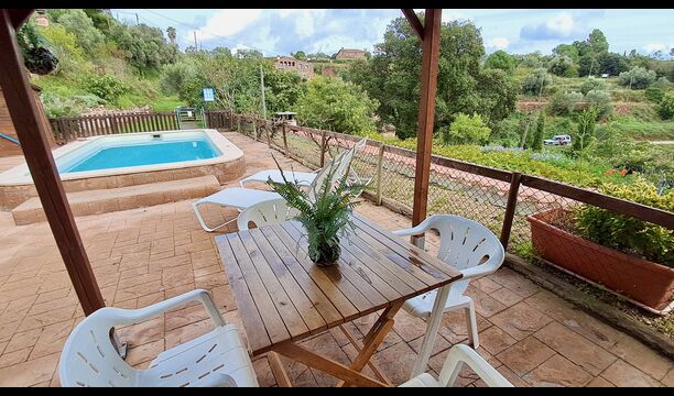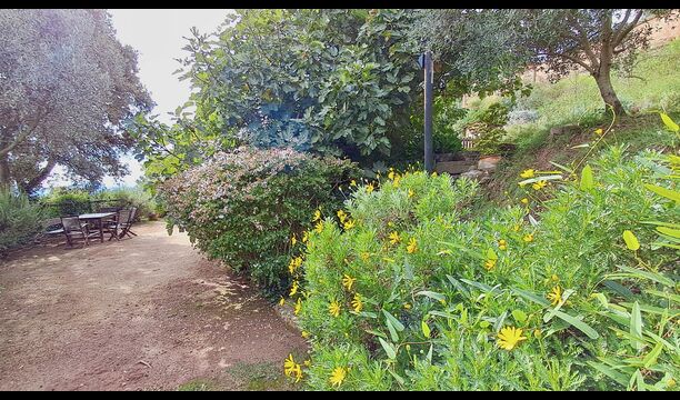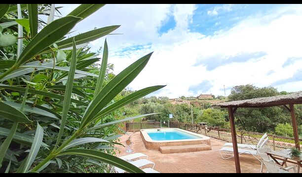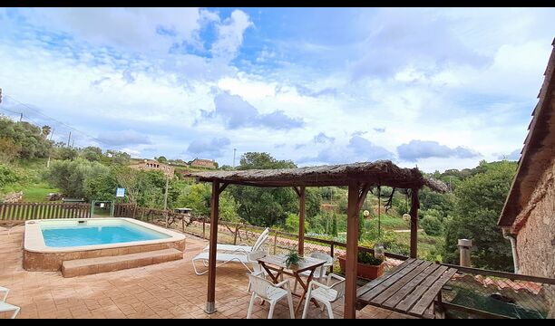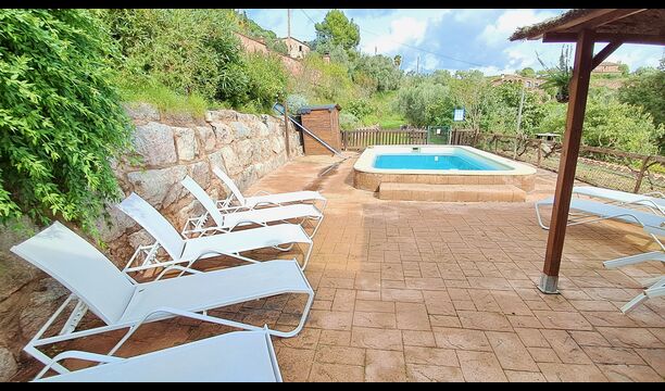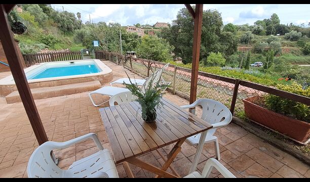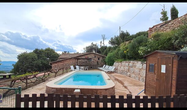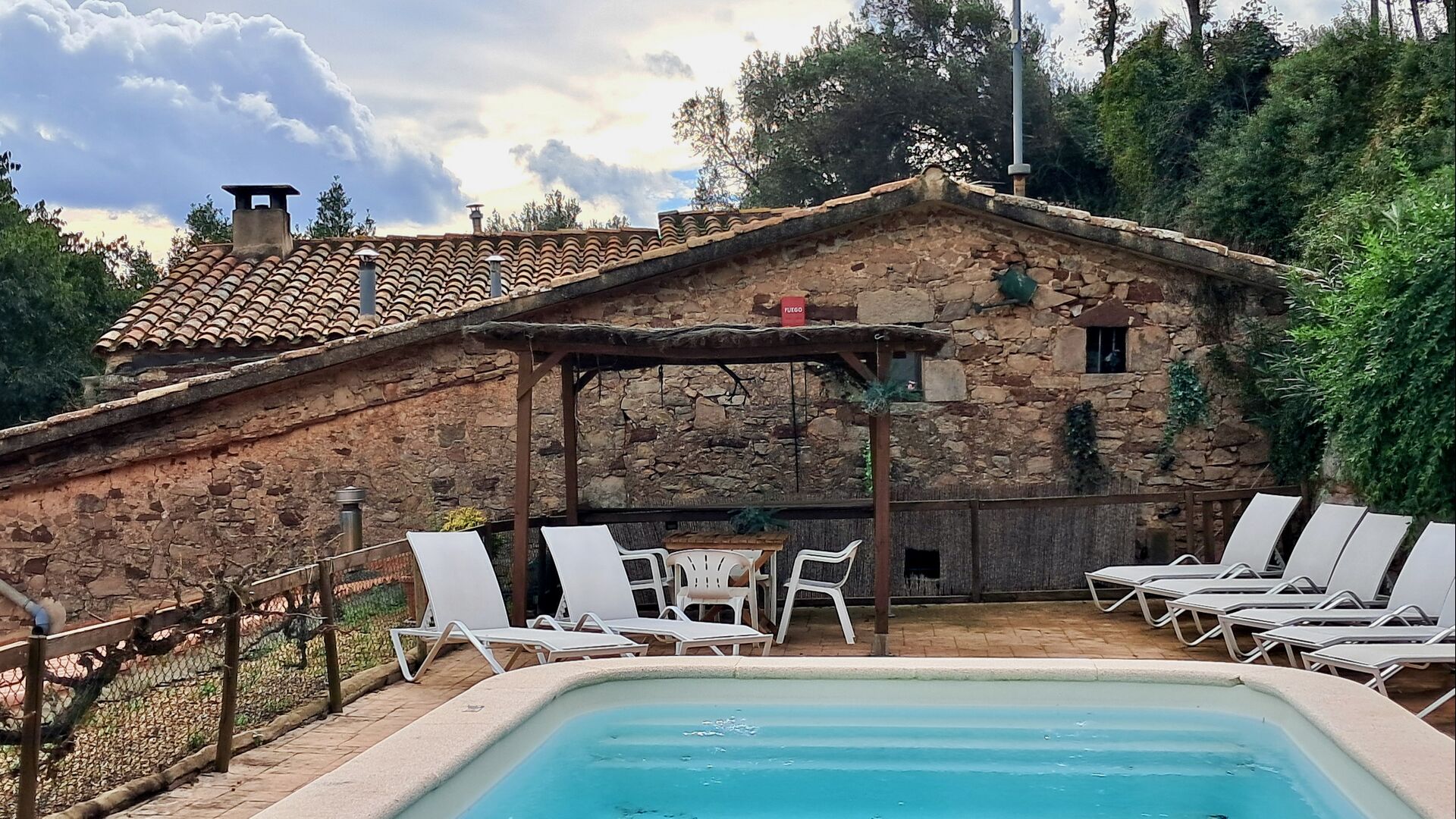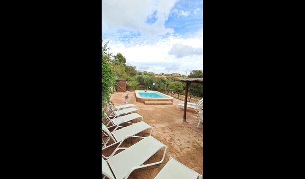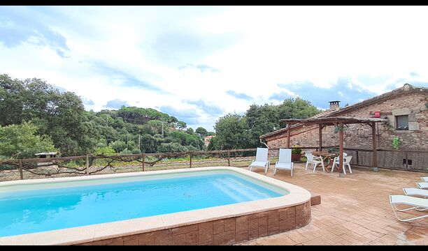 En un nivell superior del jardí està situada la piscina de 8x4 metres i 1,5 de profunditat (Màxima profunditat per llei).Per a major seguretat està envoltada per una tanca amb porta i candau i la piscina està sobrelevada del sòl uns 50cm. En aquesta zona teniu una vista sensacional i aquesta envoltada de vegetació típica de la zona, oliveres, parres, figueres, romaní que us brindaran els seus fruits segons sigui l'època de l'any.