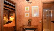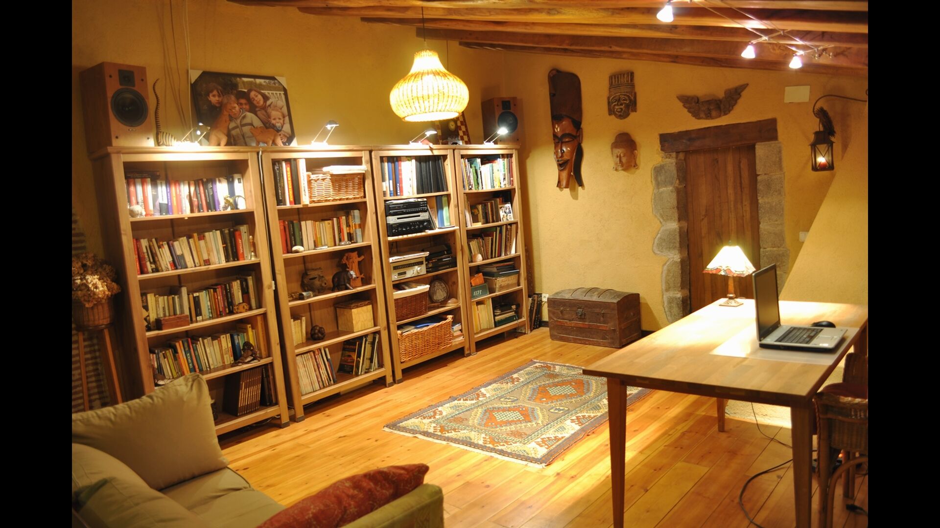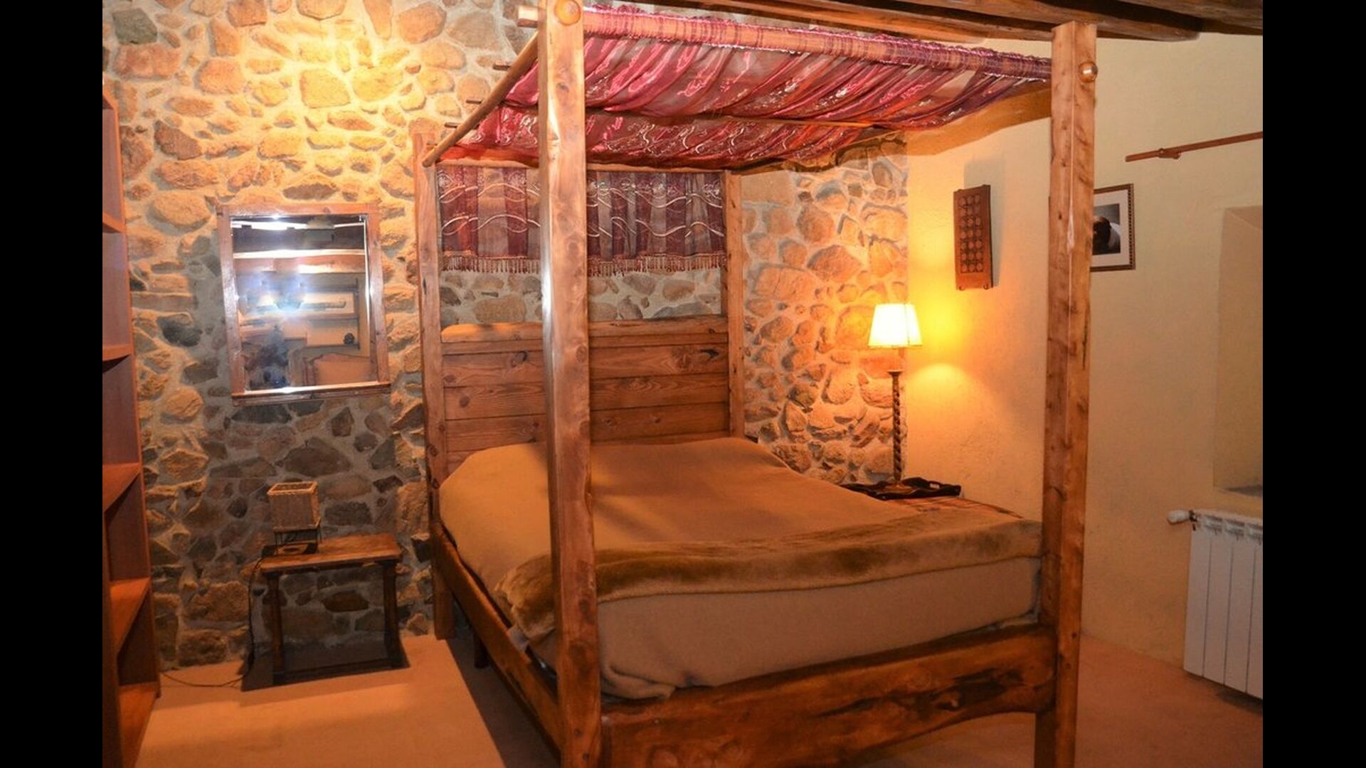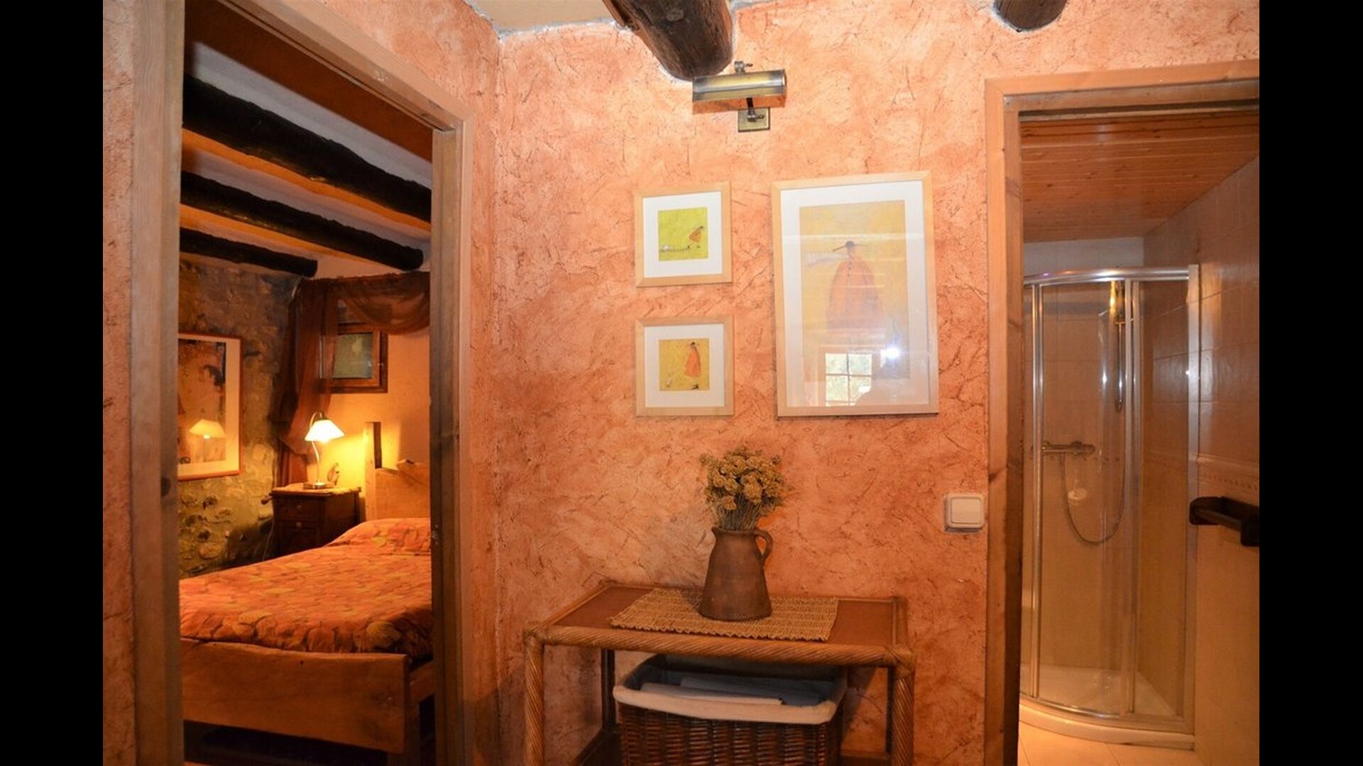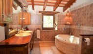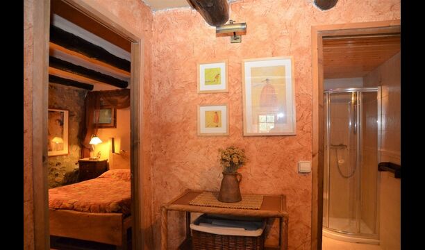 There are 4 bedrooms in total. Two of the bedrooms are located on the ground floor, one of them is a double room and the other is a triple room. They share the bathroom on the ground floor. The second floor is separated into two sections, with one bedroom in each section, which provides privacy. Therefore there are two sets of stairs, leading up to the second floor. In one of the ends you will find a triple bedroom with a double bed and a comfortable sofa bed. On the same level, next to this room is a very old and charming library filled with books. When entering the other end of the second floor, you will find the large master bedroom and the luxurious master bathroom with a very large bath tub and shower.