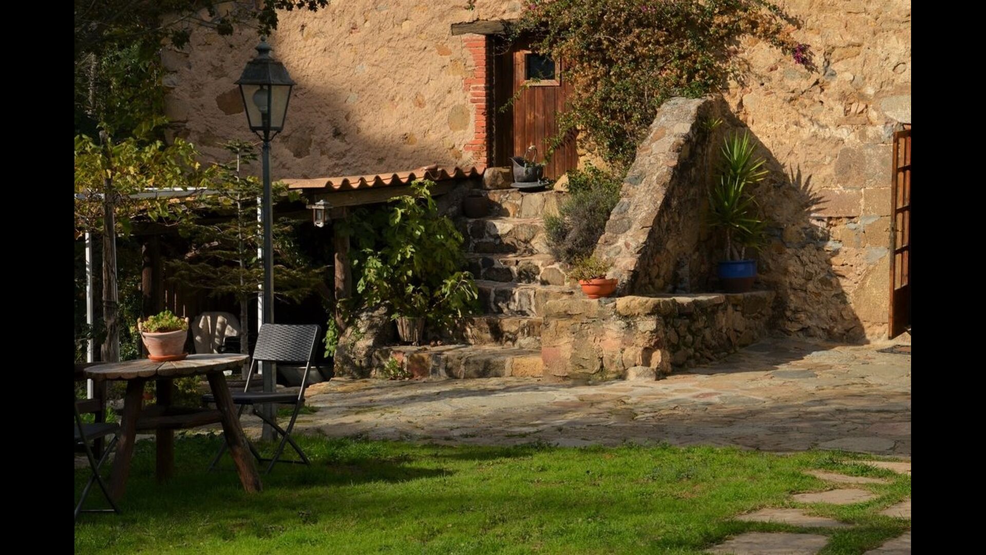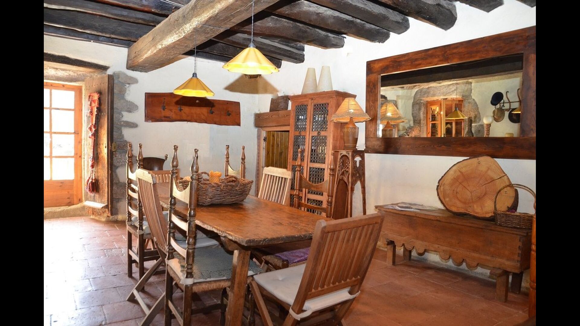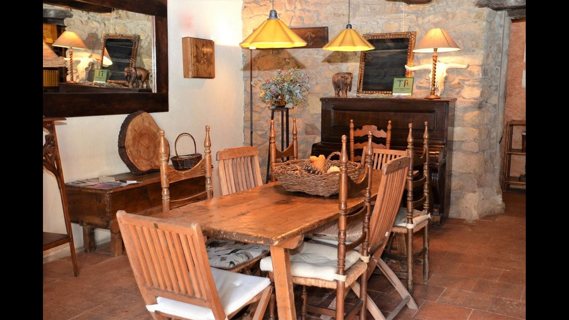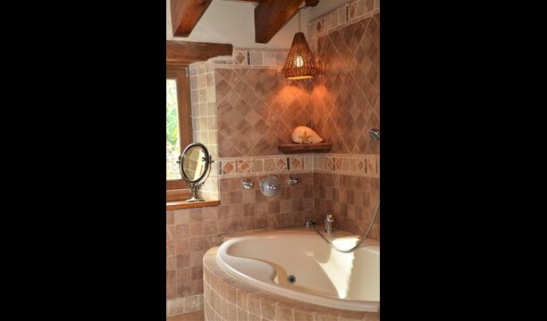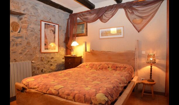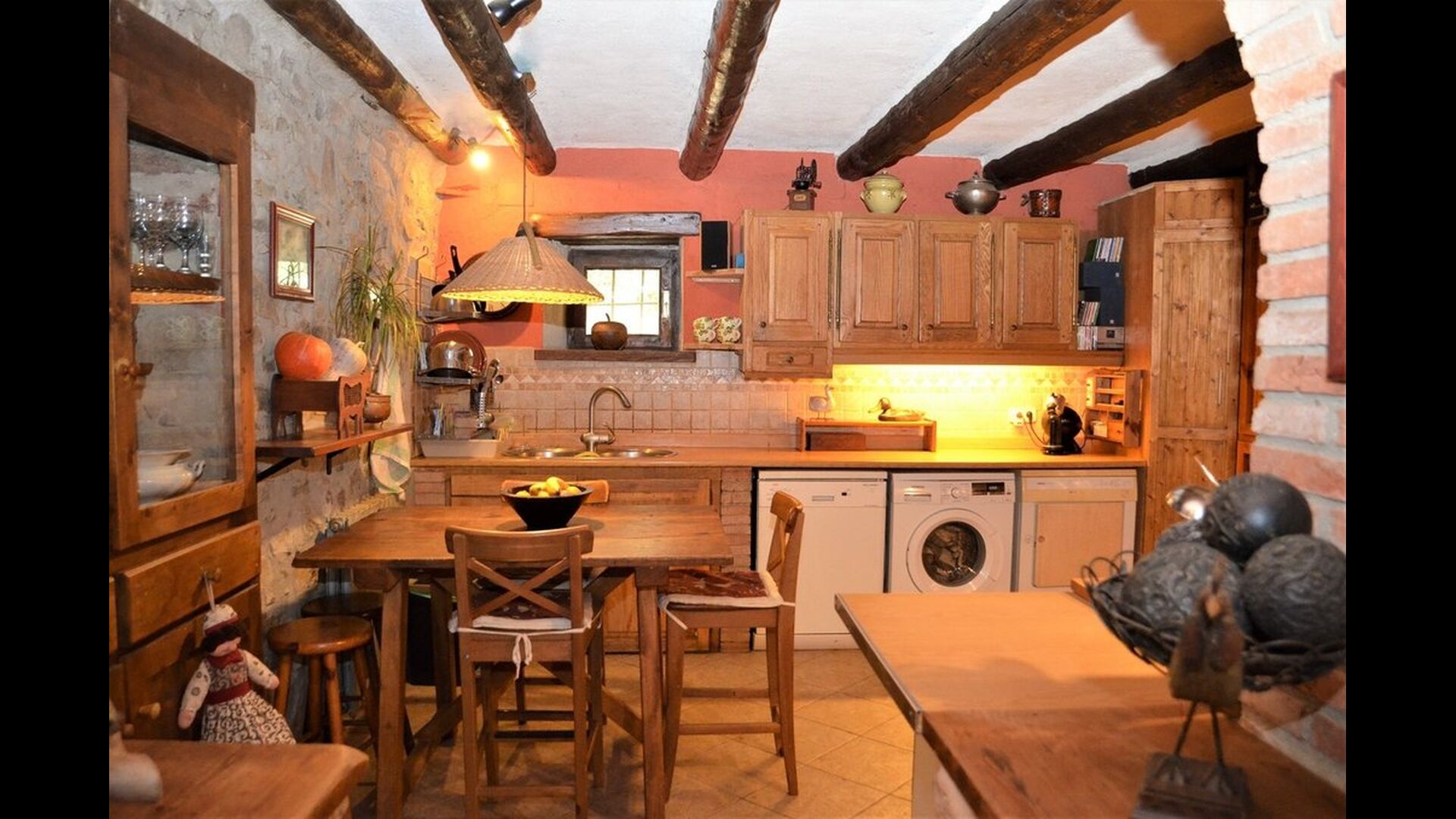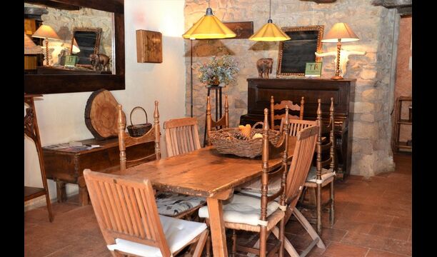 The house itself is incredibly authentic and very charming, with its original framework and construction. Although the house has been renovated, the owners have chosen to keep the house’s original construction which dates all the way back to 1663. These historical features of the house can among other things be recognized by the beautiful Catalan limestone walls and the wooden beams in the ceilings. The common rooms are located on the ground floor. Here you will find a cozy loungeroom with couches and chairs. There is a large flat screen TV and the house also has WIFI. The kitchen is very well equipped with fridge, freezer, dishwasher machine, stove, washing machine etc. It also has a small table which can seat around 4 people. In the next room is the dining room. The room is decorated with authentic wooden furniture, including a wooden piano. This room also has door which provides access to the garden.