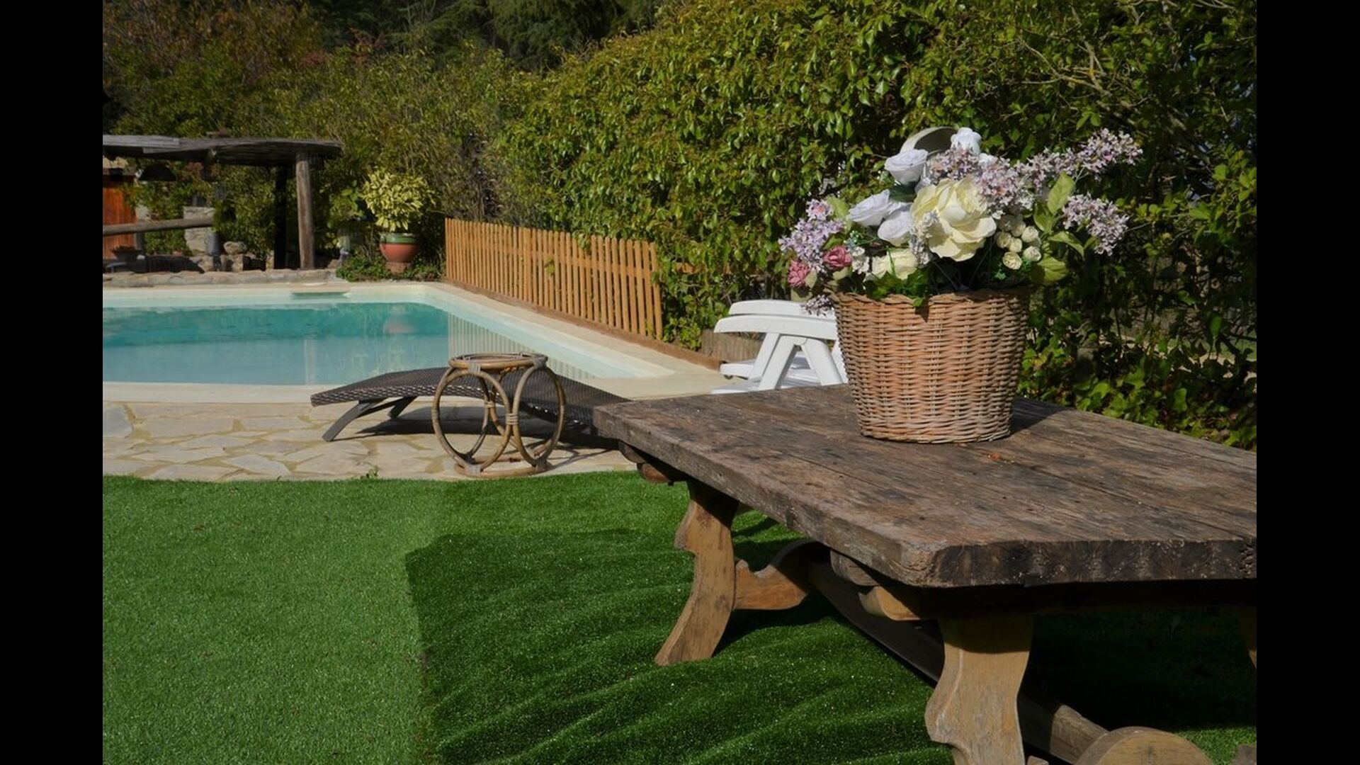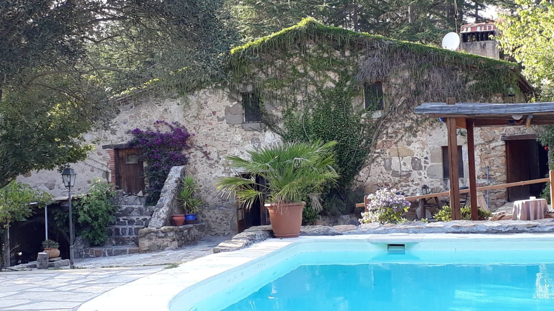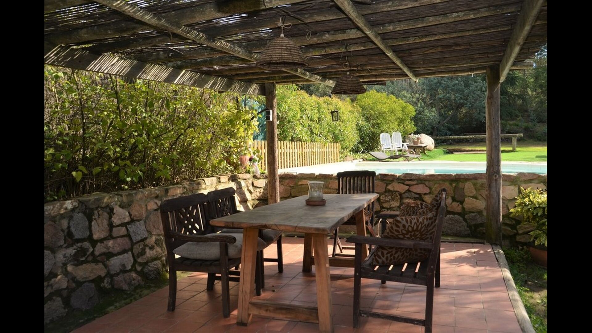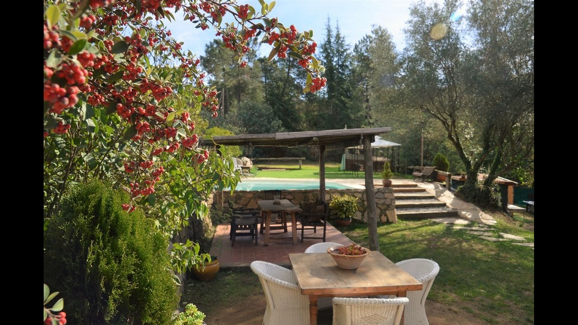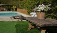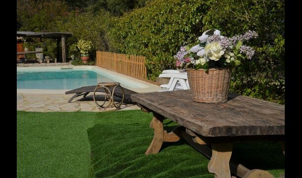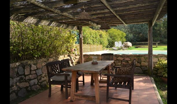 Mas Can de Cuex is located in a nature park surrounded by 67 hectares of forest. The holiday home has fantastic outdoor areas – an absolute must when spending the summer in Catalonia! The green garden surrounding the house, has plenty of benches and tables and shady areas where you will be able to relax and enjoy the great weather. The pool area is levelled a little higher from the house, and has sunchairs etc. lined up on the side. The pool is very safe and good for children, as it has a very low end. There is also a very cozy covered terrace by the end of the pool with an outdoor dining table and chairs. There is even table tennis in the garden, where the children and adults can entertains themselves with a game.