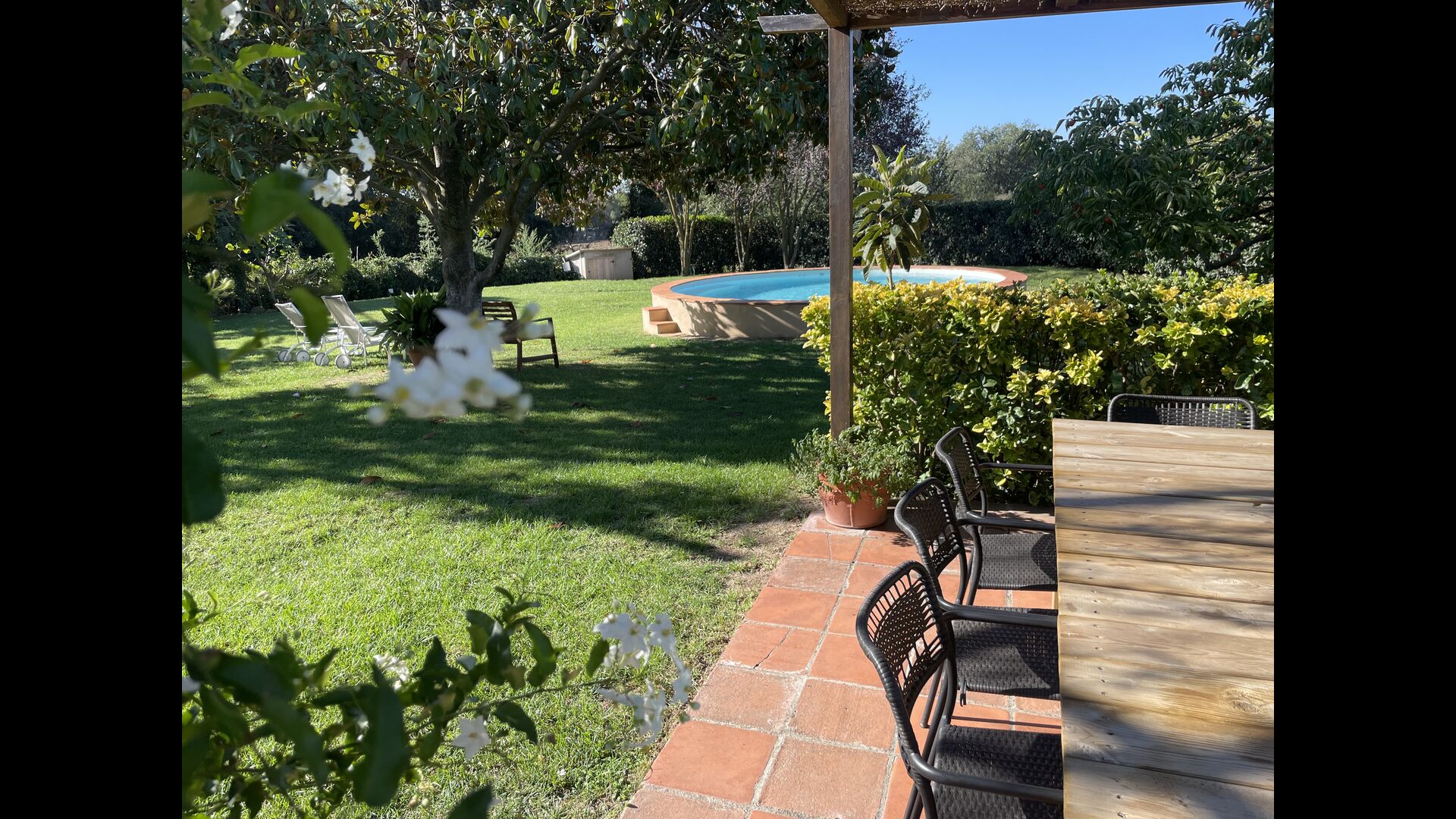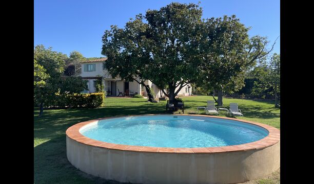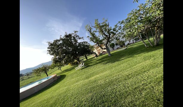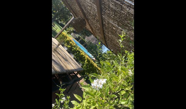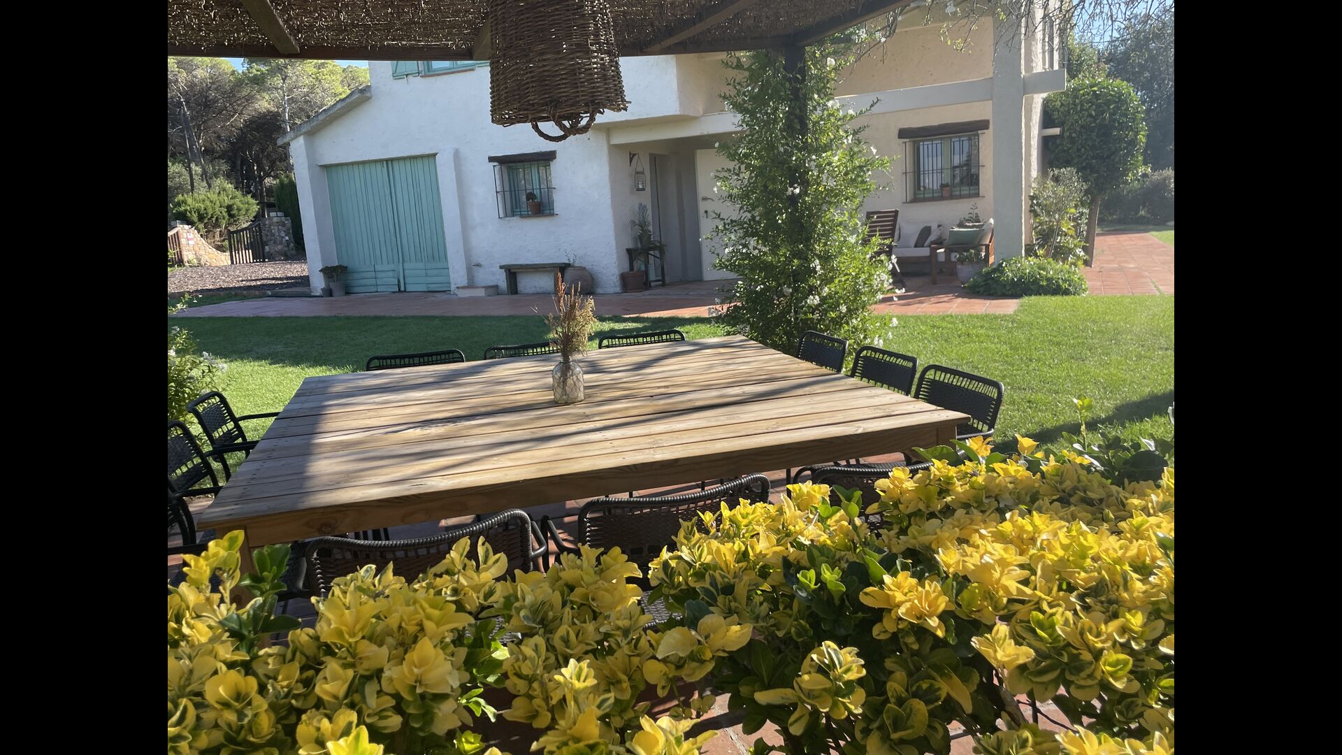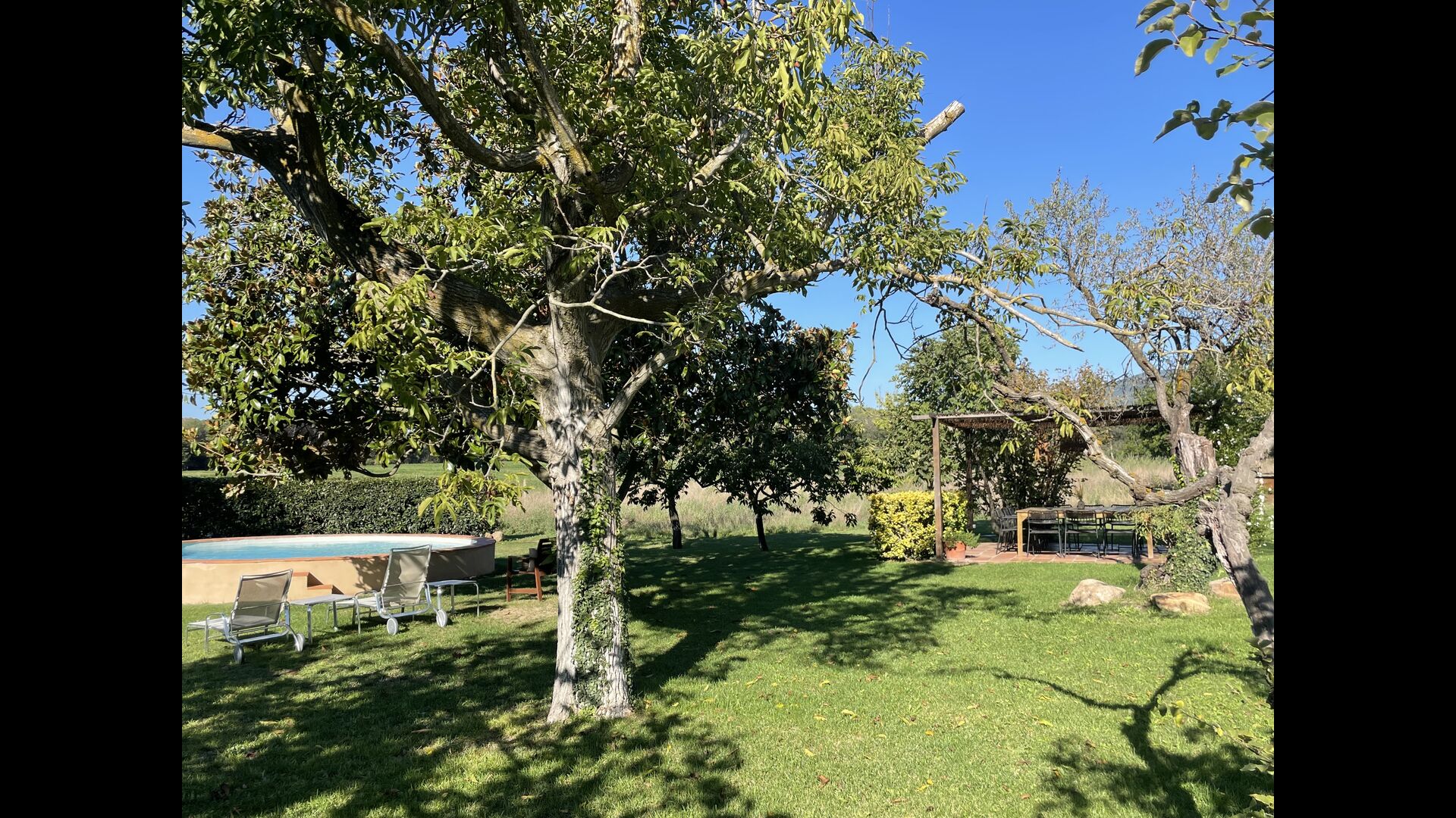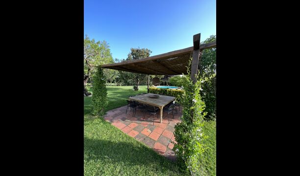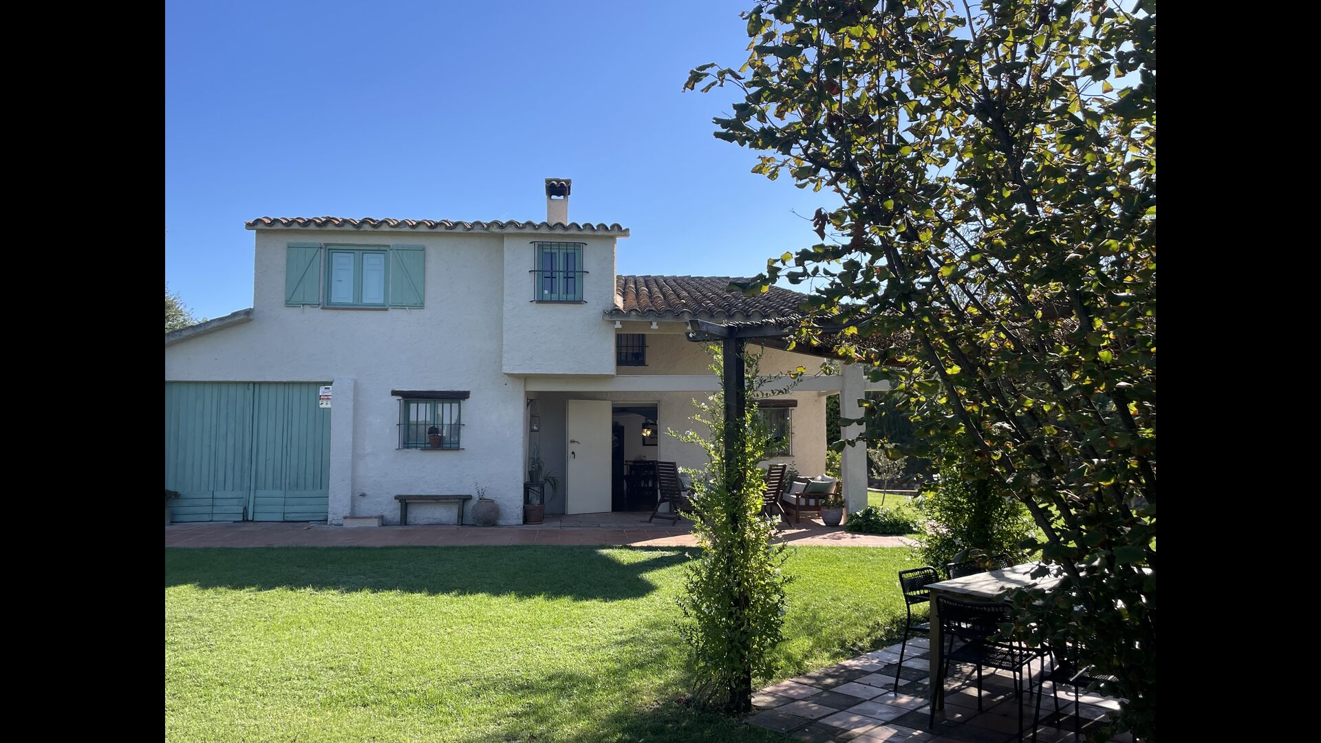 La “masia”, acuradament renovada, que amb els seus colors pastel regala records del sud de França, està envoltada d'un gran jardí > amb una terrassa ombrejada encantadora amb una gran taula; a més, hi ha la terrassa matinal més acollidora amb cantons de sofà just davant de la porta d'entrada a la casa. El jardí té molts arbres fruiters, que ofereixen molts llocs d'ombra, i una bella piscina rodona amb esglaons i un banc, que inclou; pots seure a l'aigua i gaudir de la vista.