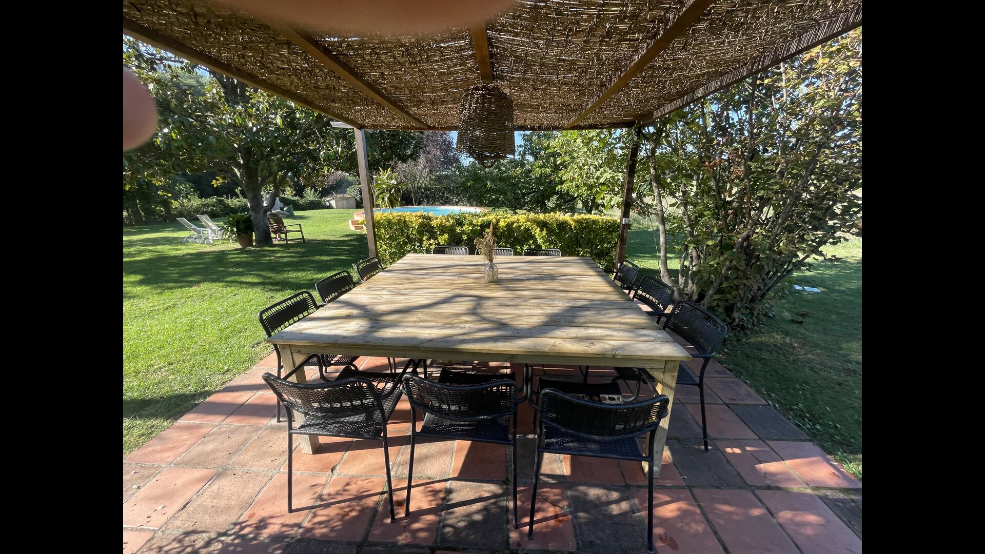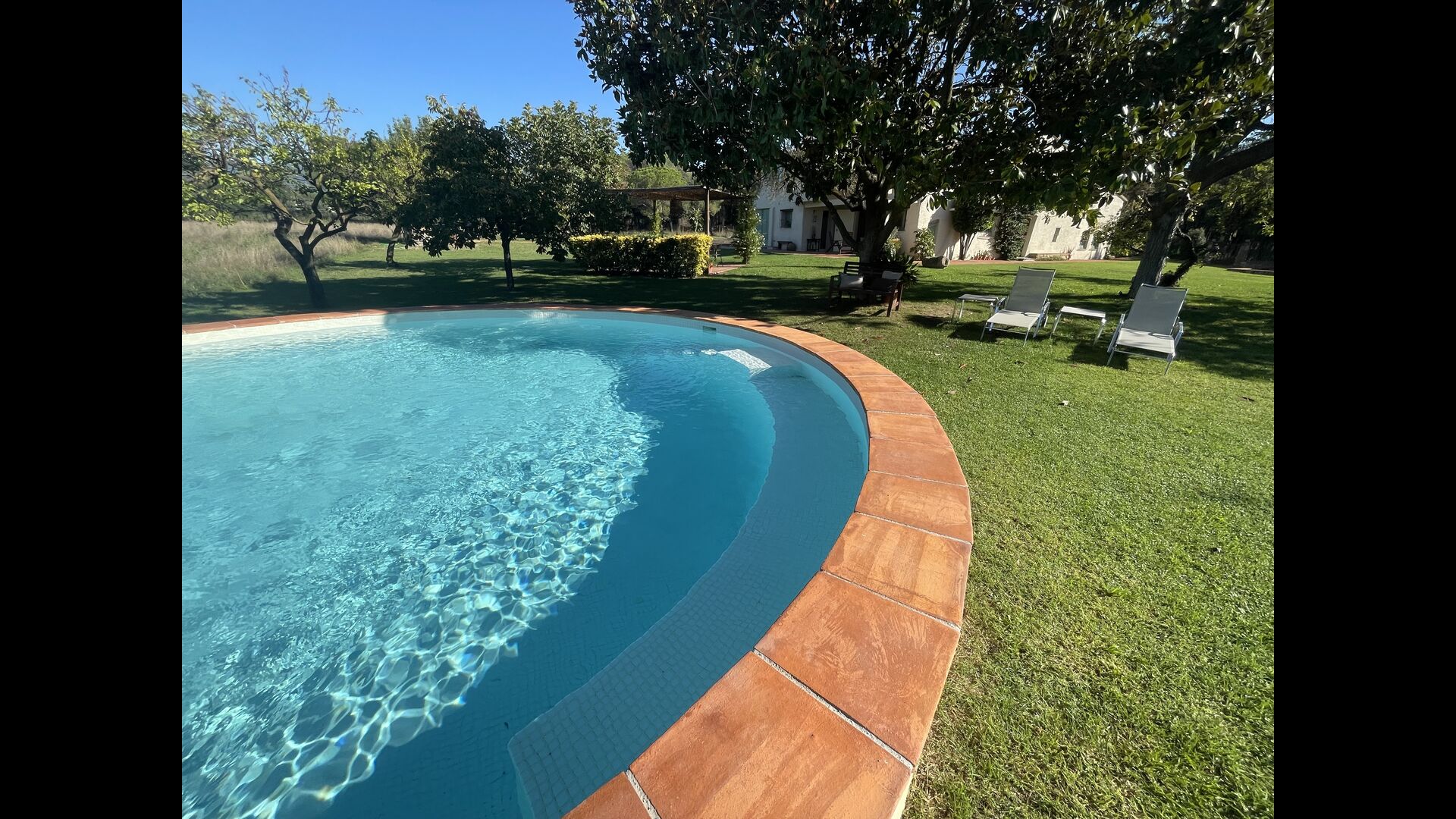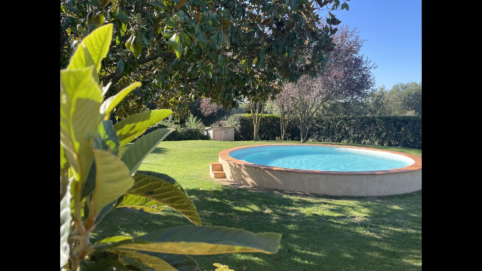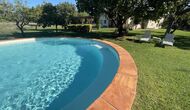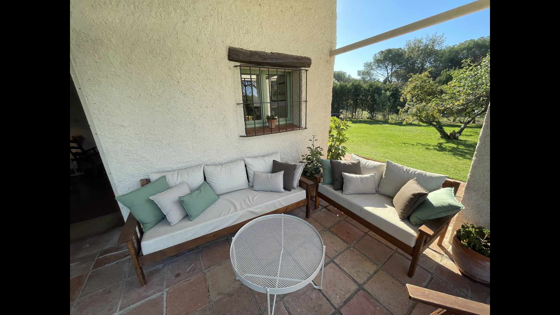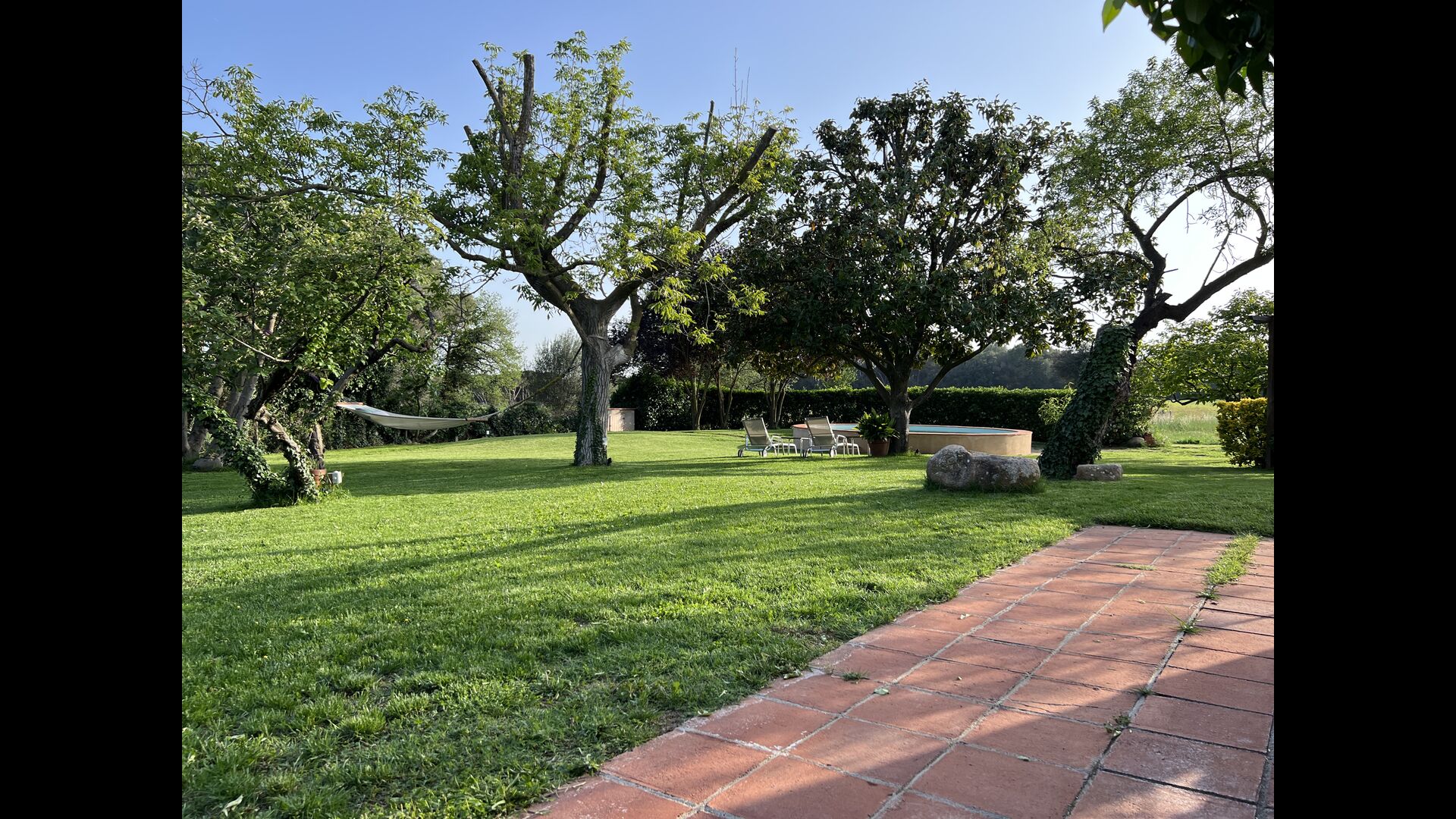 La “masia”, acuradament renovada, que amb els seus colors pastel regala records del sud de França, està envoltada d'un gran jardí > amb una terrassa ombrejada encantadora amb una gran taula; a més, hi ha la terrassa matinal més acollidora amb cantons de sofà just davant de la porta d'entrada a la casa. El jardí té molts arbres fruiters, que ofereixen molts llocs d'ombra, i una bella piscina rodona amb esglaons i un banc, que inclou; pots seure a l'aigua i gaudir de la vista.