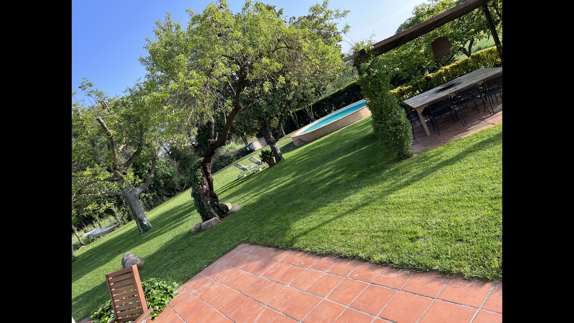 El jardí de la casa és perfecte, tant per a adults com per a nens. Estàs envoltat pel idíl·lic paisatge català, alluny del soroll de la ciutat i støj – però encara a només 45 minuts amb cotxe de Barcelona! Des de la terrassa de la casa y Pots seure i gaudir de la vista, només a un pas de la porta a la planta baixa si augmenta la calor. Hi ha una zona de menjador/chill-out addicional al mig del jardí, amb dosser i una taula i cadires agradables. El jardí està adornat amb bells arbres i arbustos, i des de la bella piscina podreu contemplar el vostre petit paradís. La piscina també té banc incorporat, per a quan, p. necessiteu descansar les cames després de jugar amb els nens, o si només voleu relaxar-vos a l'aigua suaument llopejada sota el preciós sol català.