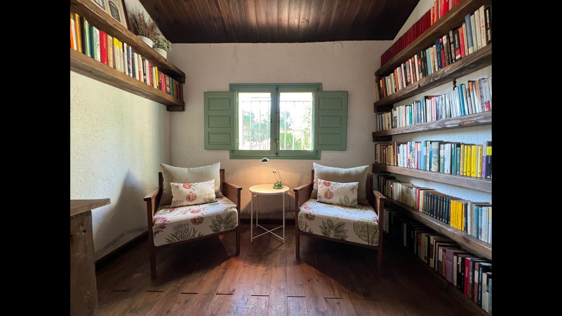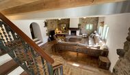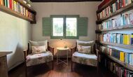 A l'esquerra trobareu un petit passadís amb un lavabo al davant. Si continueu recte des de la planta baixa, entreu al saló; aquí hi ha un sofà gran i preciós, amb tauleta i llar de foc, un llit de descans amb coixins i un televisor. La il·luminació, així com el menjador, és fantàstica amb diverses finestres des de les quals podeu mirar el sol. Continuant cap a l'esquerra des de la sala d'estar, entres a una oficina/minibiblioteca preciosa i ben cuidada, amb un escriptori antic i un gran bonica i llibreria encantadora – és gairebé com viatjar en el temps quan entres a l'habitació!