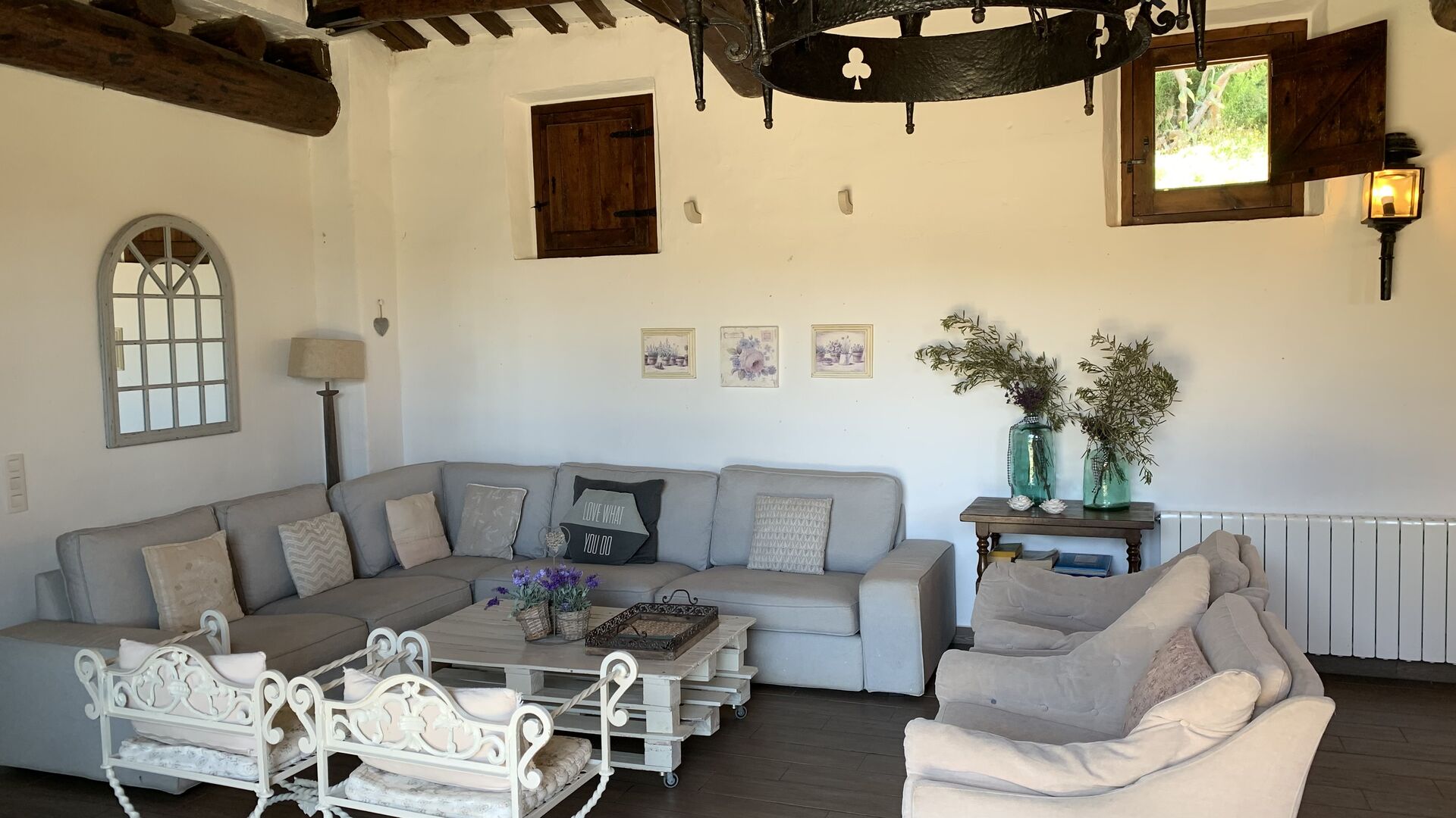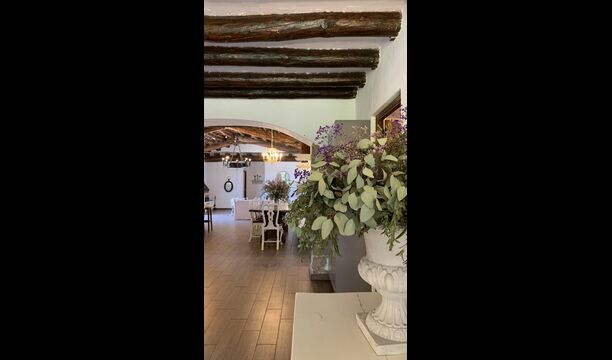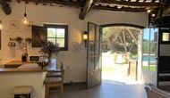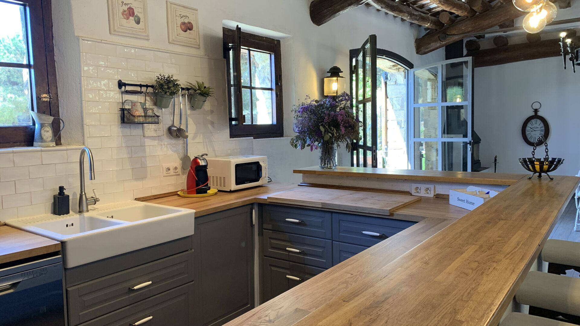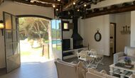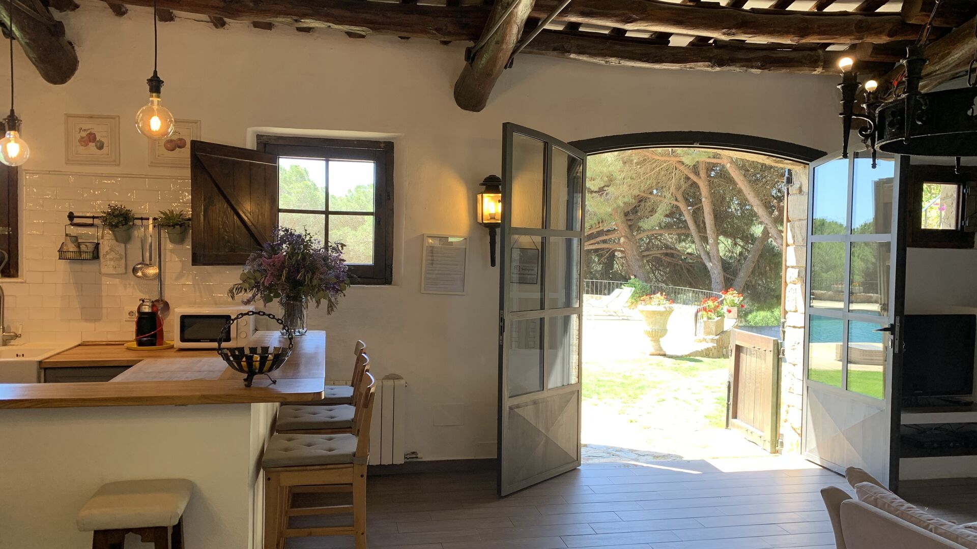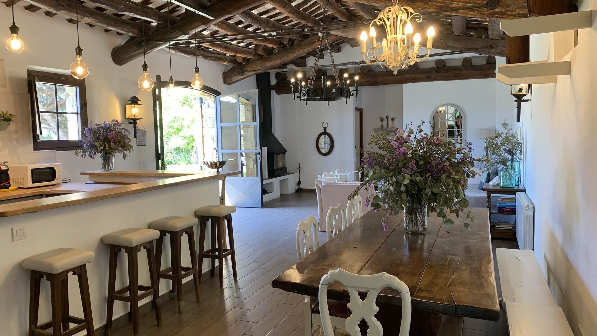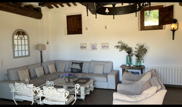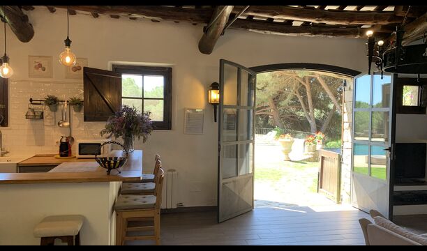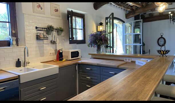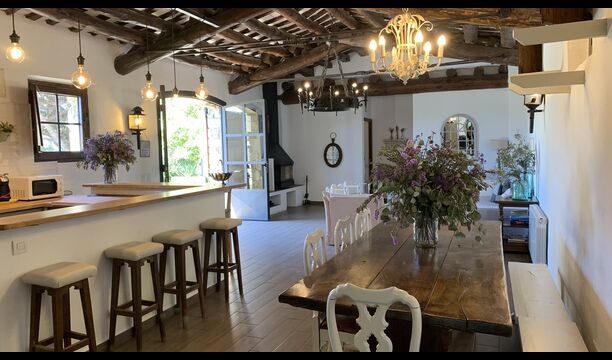 També trobareu la gran cuina oberta i sala d'estar a la planta baixa. La cuina està recentment reformada i totalment equipada amb tot el que necessiteu. També hi ha una gran taula llarga amb espai per a tot el grup, i un acollidor saló amb còmodes sofàs. És una habitació increïblement bonica, amb boniques bigues de fusta al sostre. En extensió del saló, hi ha grans portes dobles amb finestres, que donen accés directe a la zona de la piscina.