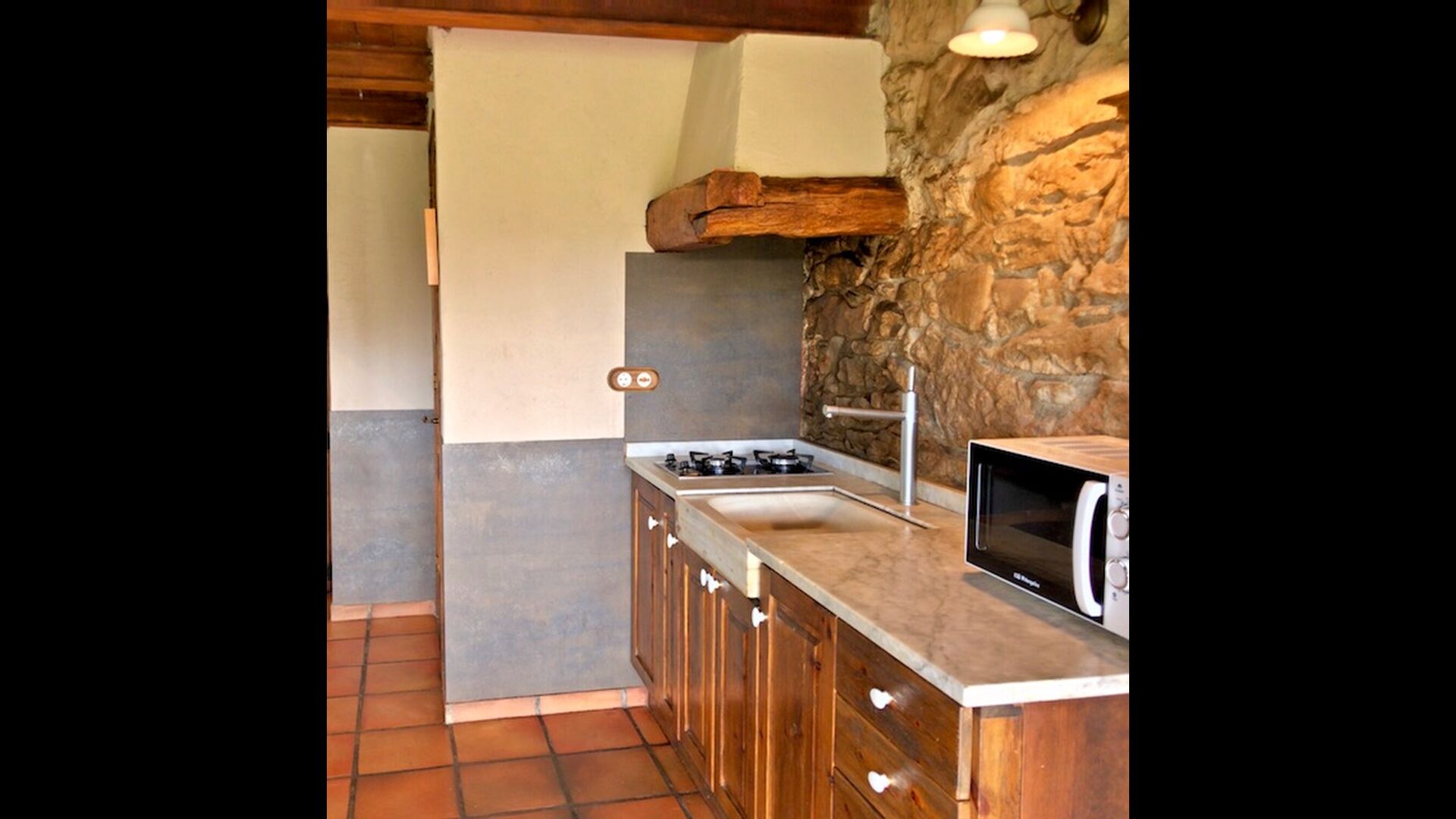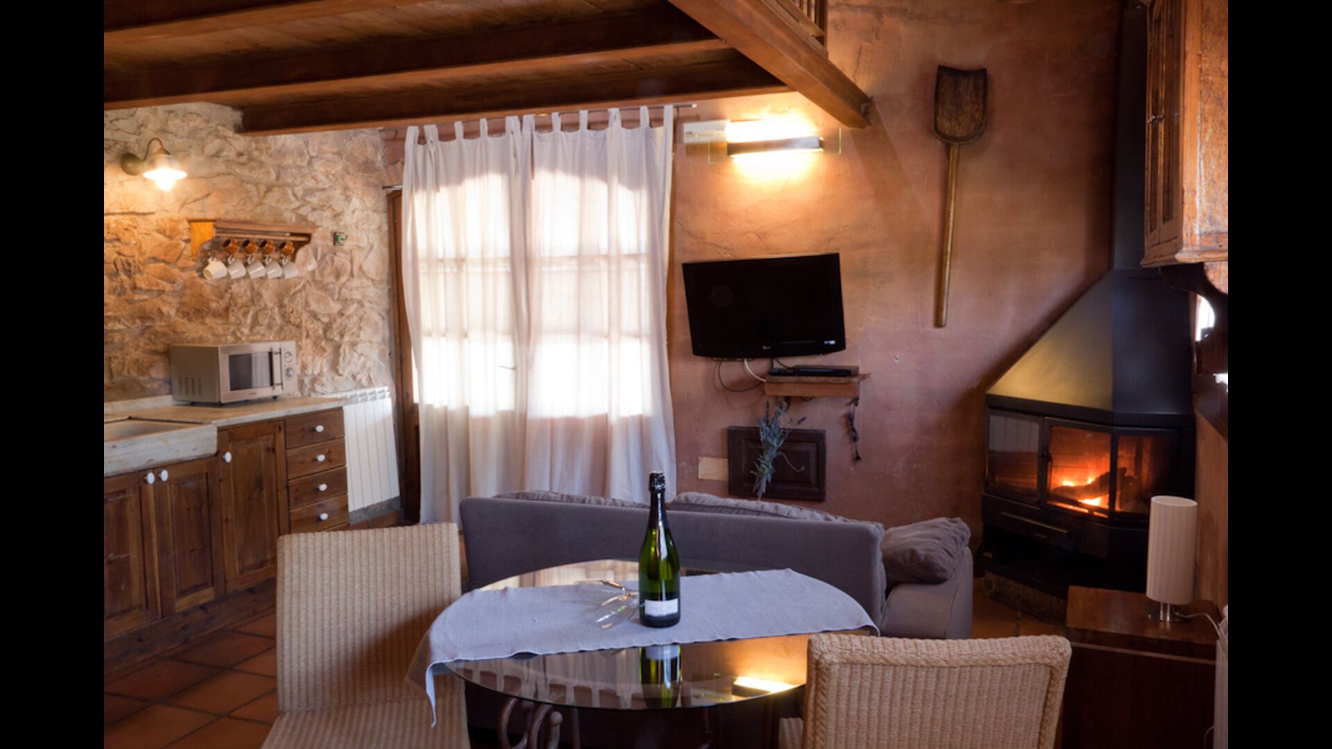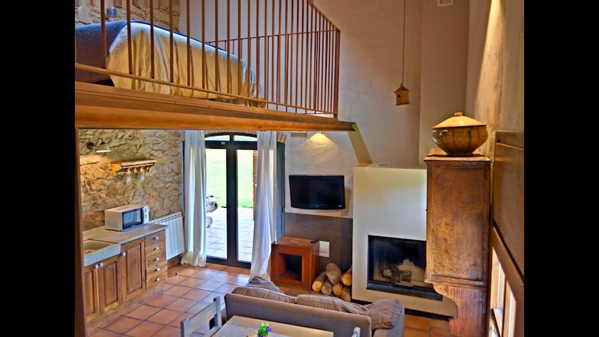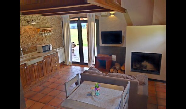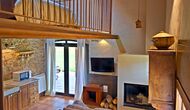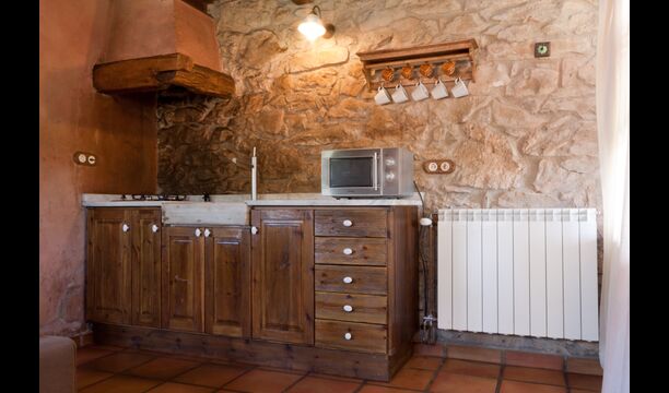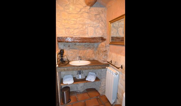 In this apartment, Piso Nio, there is room for two people. There is one double bed, which is a perfect base for a couple. There is also a modern bathroom. The flat has a size of 60 m2. Overall it is arranged very authentic and traditional in a Catalan style. It is also clear that there are a great respect for original materials and structures. This will provide, along with the fantastic location of the house, a good and romantic atmosphere. Furthermore there is a nice kitchen where the owners have done a lot to keep it traditional Catalan. In this there are a fridge, a stove, a dishwasher and a washing machine. In the same room there is a soft couch, where you can watch TV and there is a fireplace. Upstairs there is a spacious bedroom with a nice double bed. Outside there is a terrace next to the apartment next door. Here you can read a book or just relax in the shade if it gets too hot. However the best thing about the apartment is almost the breathtaking views that can be enjoyed. There is a very special calmness and peace that is unique to houses in the mountains.