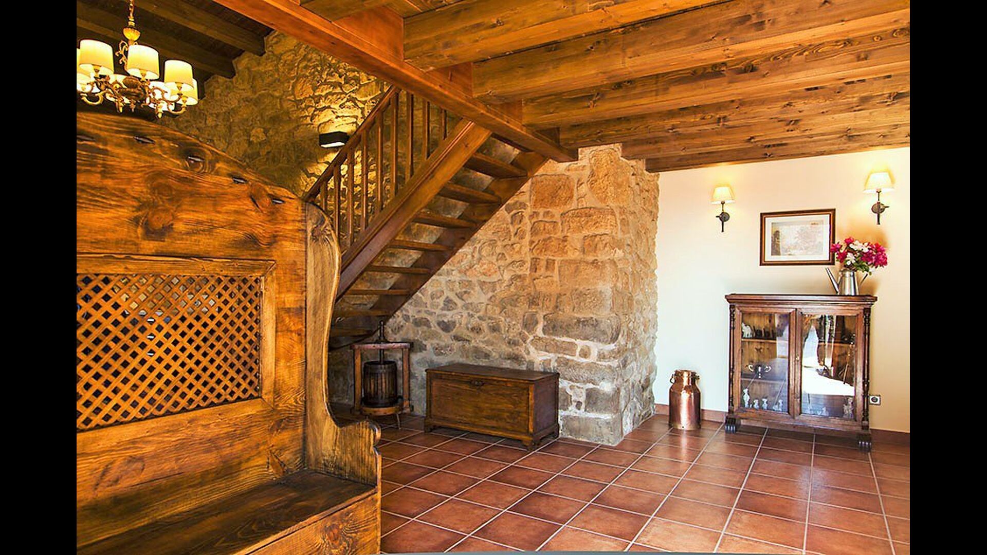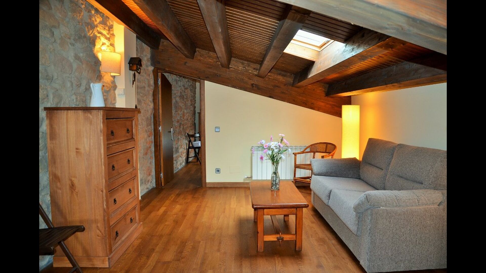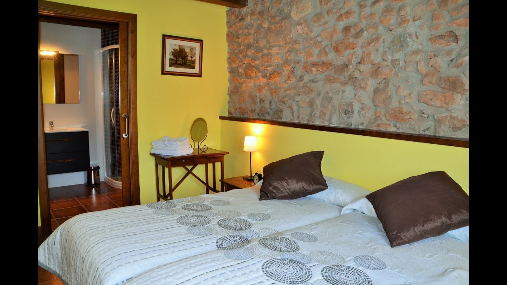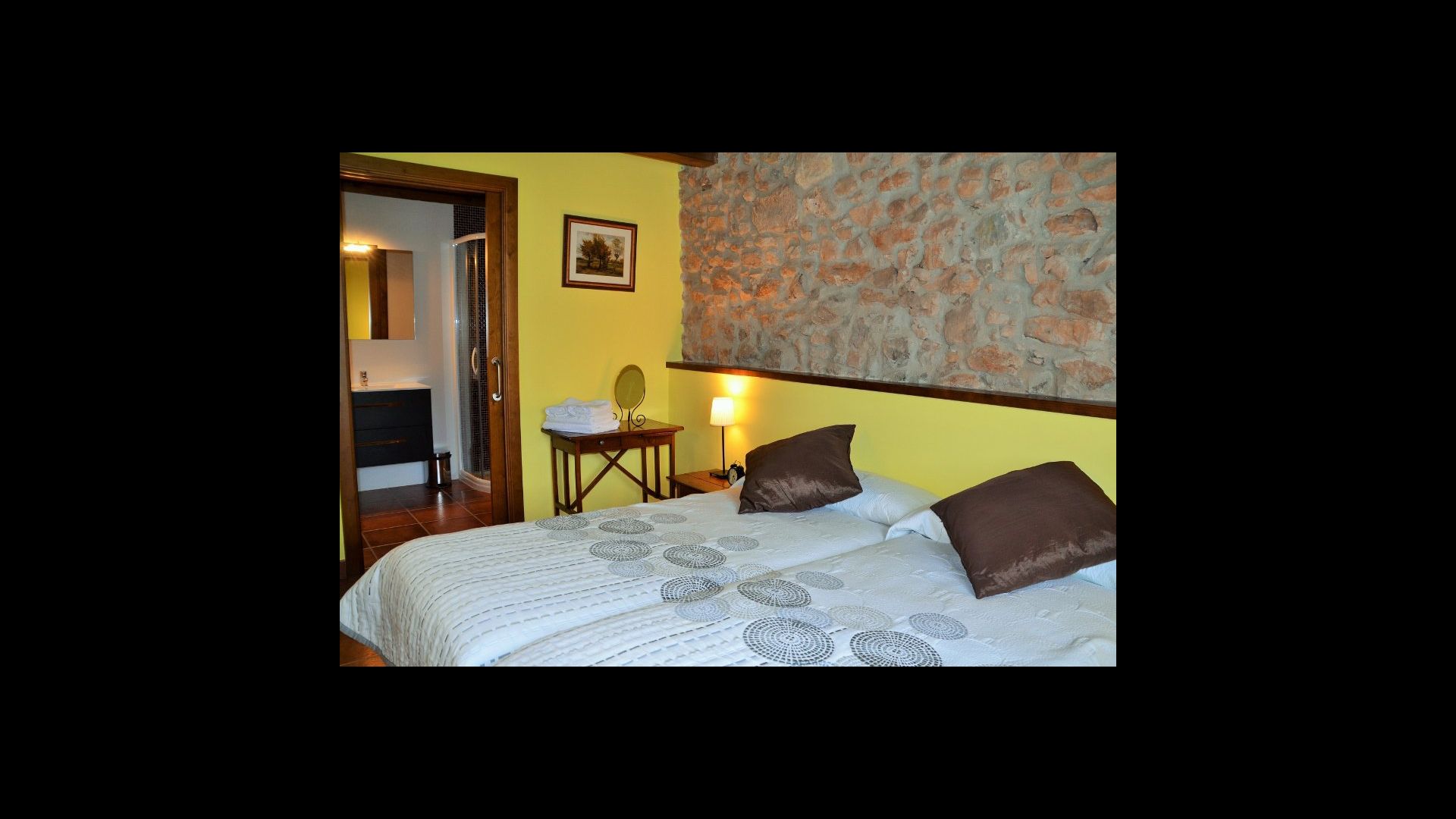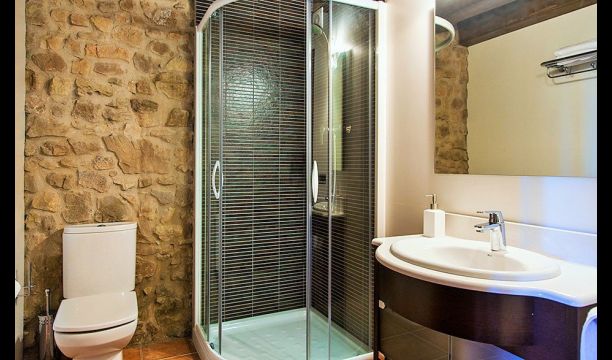 To the right of the hallway are four of the five beautiful bedrooms in Can de Mateo. The four bedrooms are all doubles, three of which have bath ensuite. One of the rooms has direct access to the terrace. This floor also contains a further bathroom which is shared with the last bedroom on the top floor of the house.