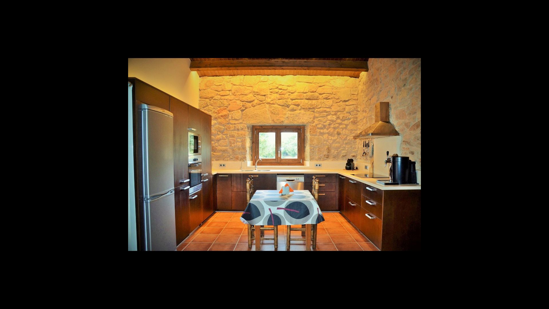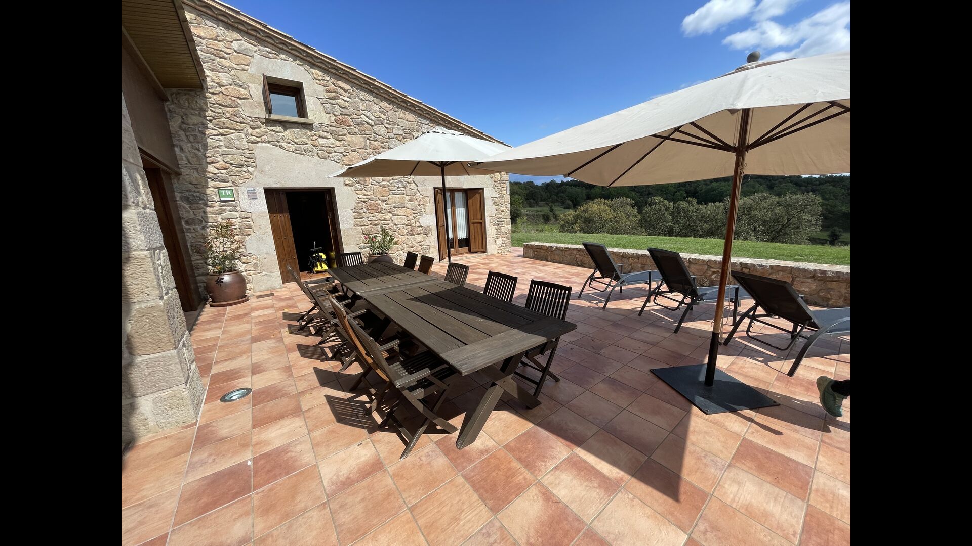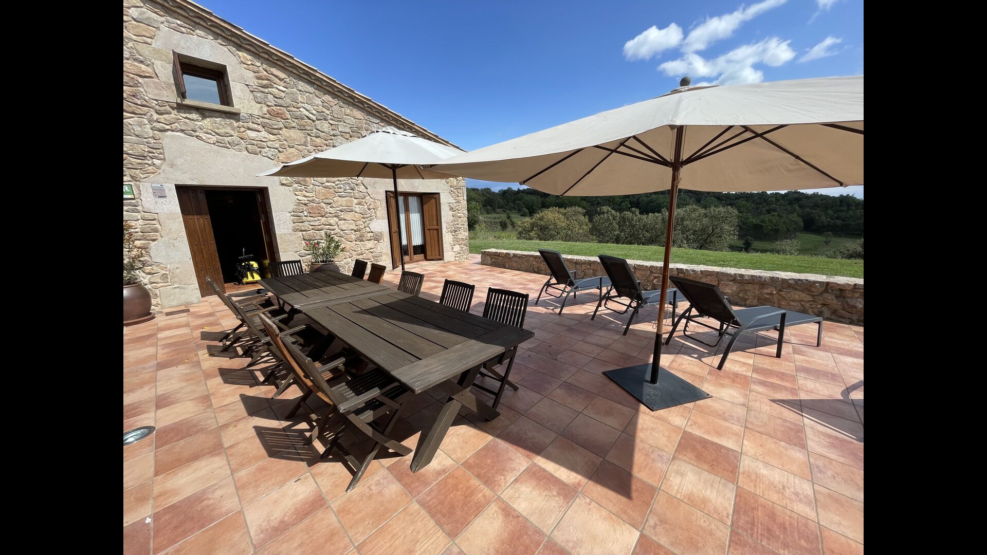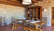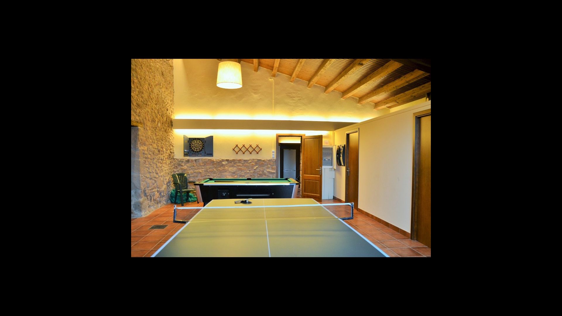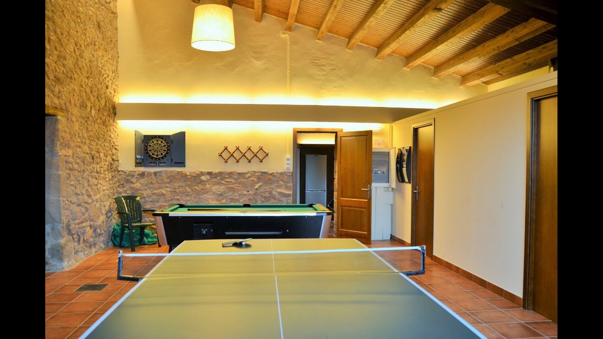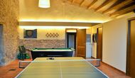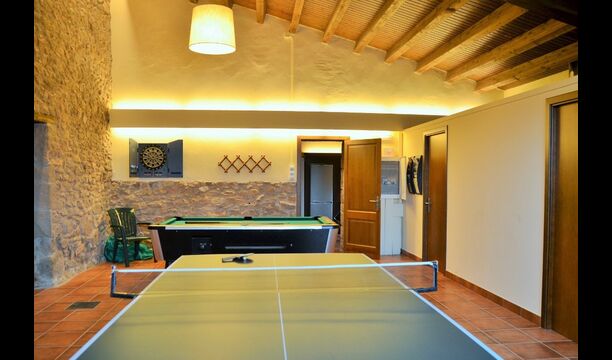 On the ground floor of the house, you enter a beautiful hall. To the left of the hall is the modern kitchen with freezer, oven, microwave, ceramic hob, dishwasher, espresso machine and even a draft beer tap. The kitchen has direct access to the large common room which has a beautiful Catalan refectory table (if you should want to eat in the shade for a day or two) and a cozy living room. From the common room's sliding doors you have direct access to the stone-paved terrace. The BBQ of the house is a bit further down in the garden. If you turn right from the kitchen you’ll meet the activity room, which probably will be the frame of some good hours, also for children in the group. Here are billiards, table tennis and darts.