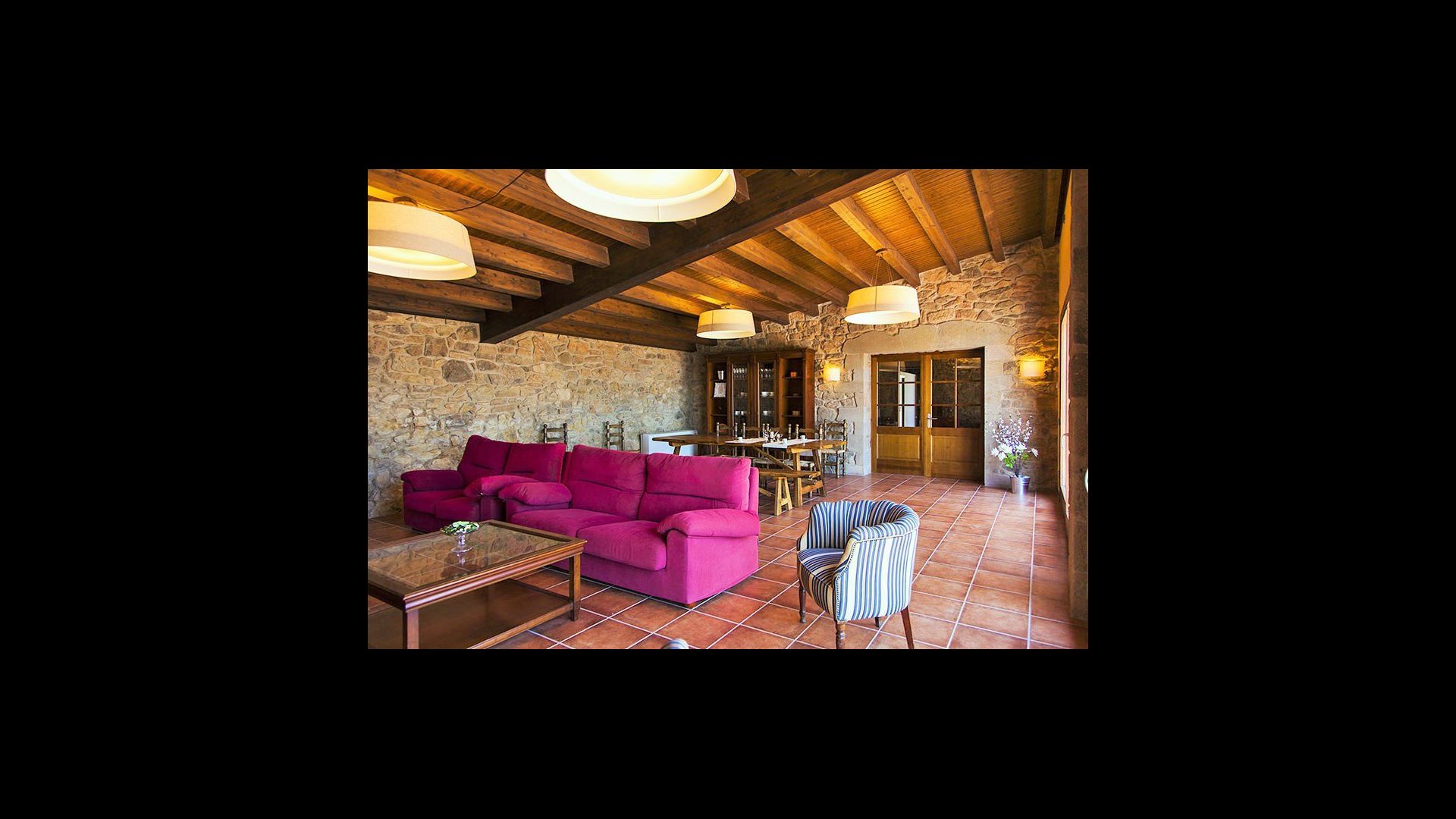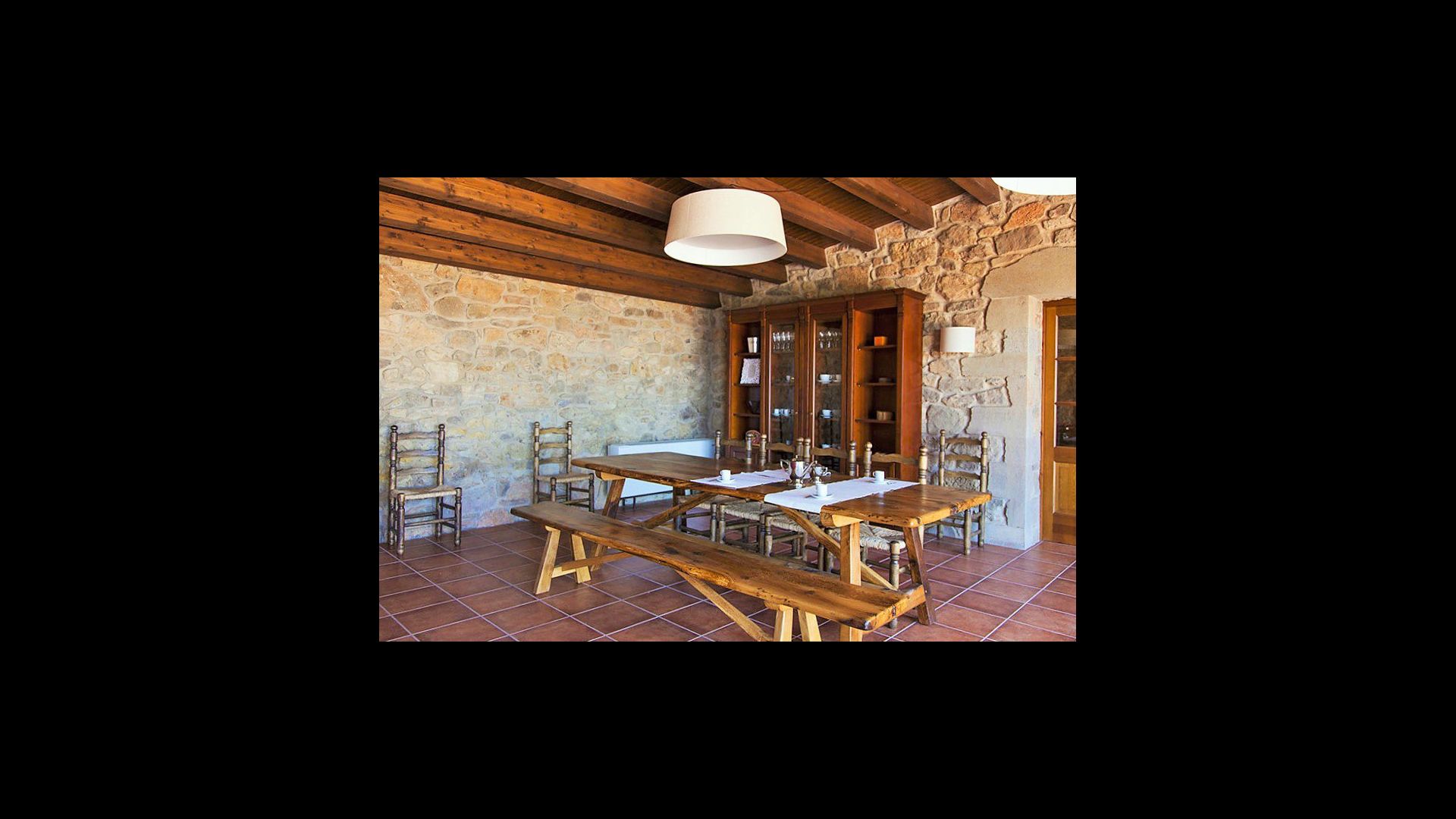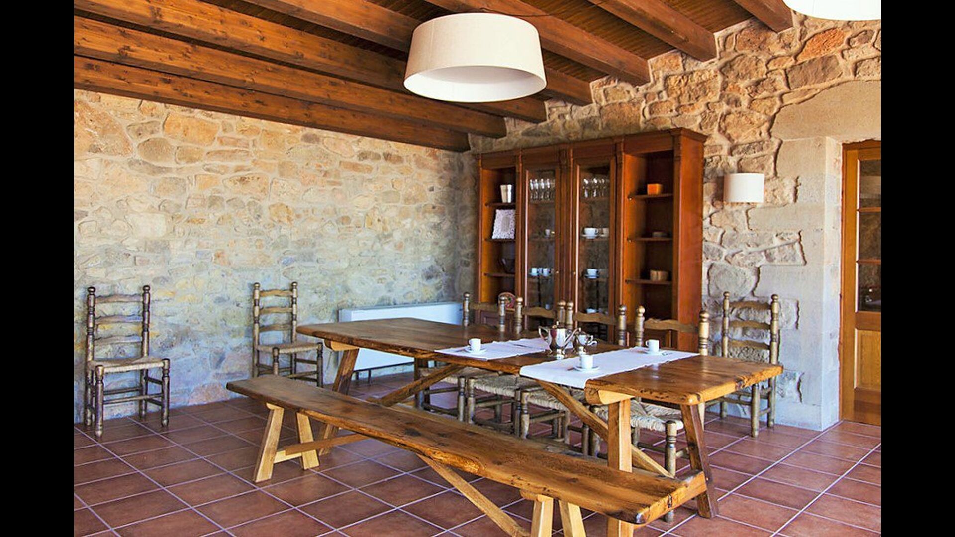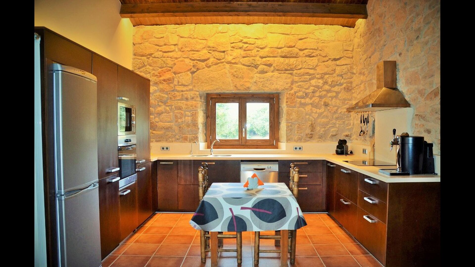 On the ground floor of the house, you enter a beautiful hall. To the left of the hall is the modern kitchen with freezer, oven, microwave, ceramic hob, dishwasher, espresso machine and even a draft beer tap. The kitchen has direct access to the large common room which has a beautiful Catalan refectory table (if you should want to eat in the shade for a day or two) and a cozy living room. From the common room's sliding doors you have direct access to the stone-paved terrace. The BBQ of the house is a bit further down in the garden. If you turn right from the kitchen you’ll meet the activity room, which probably will be the frame of some good hours, also for children in the group. Here are billiards, table tennis and darts.