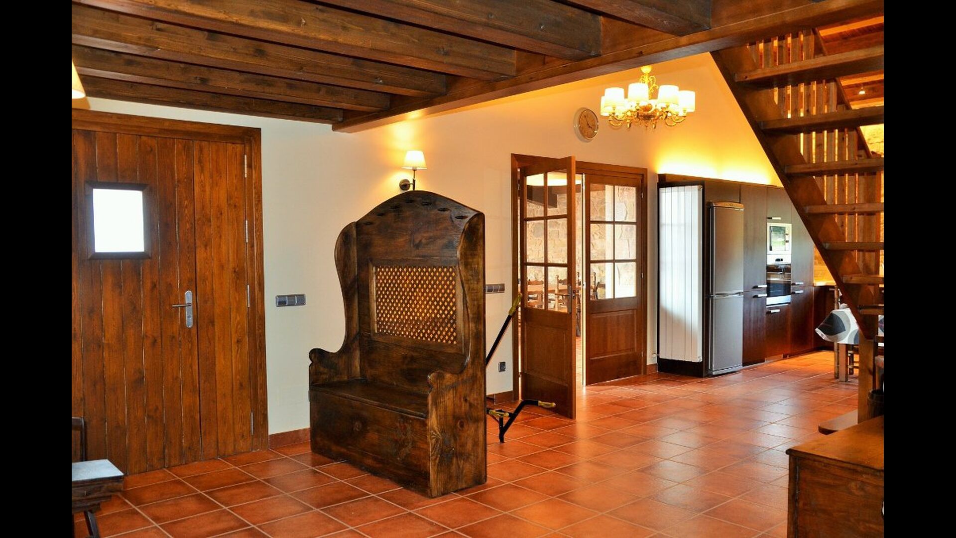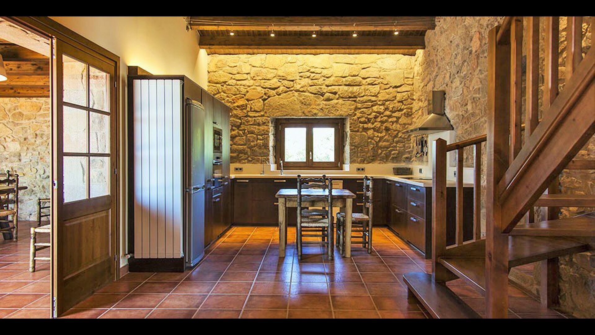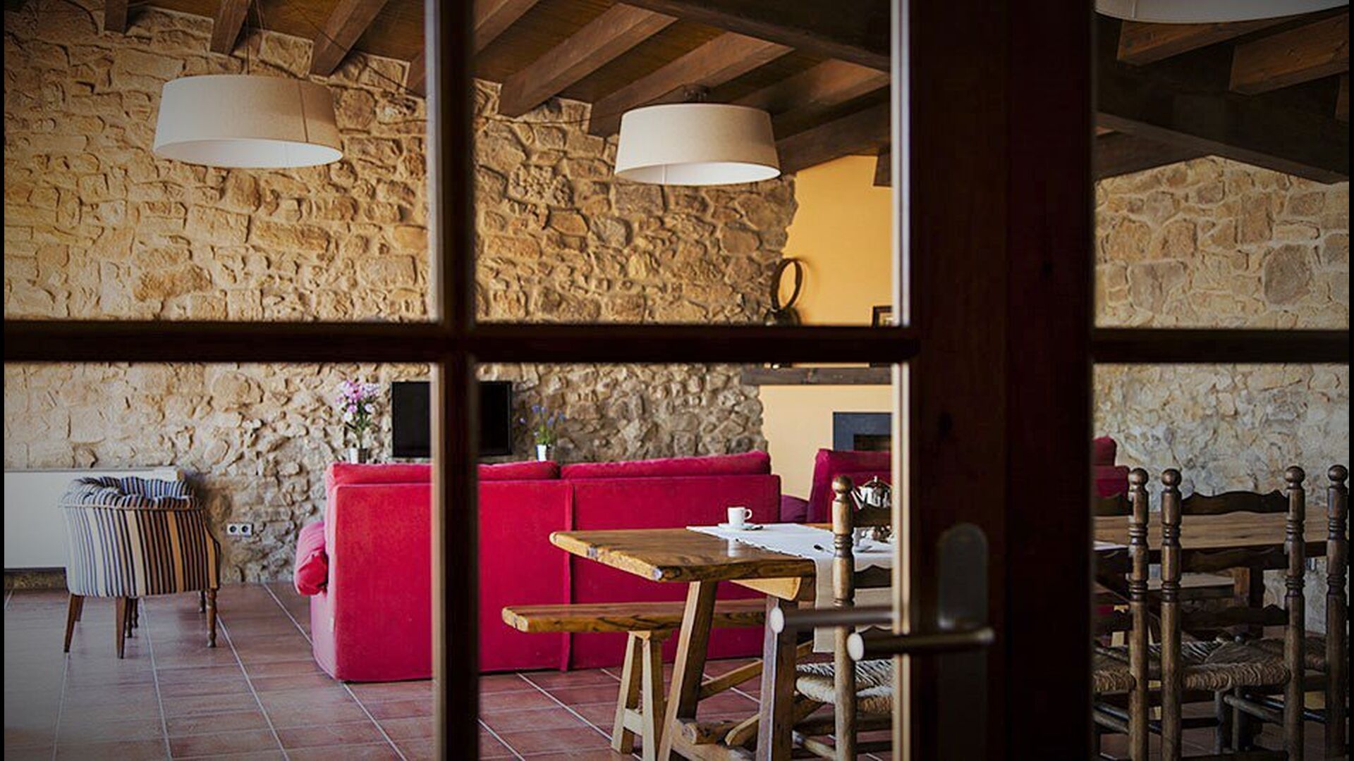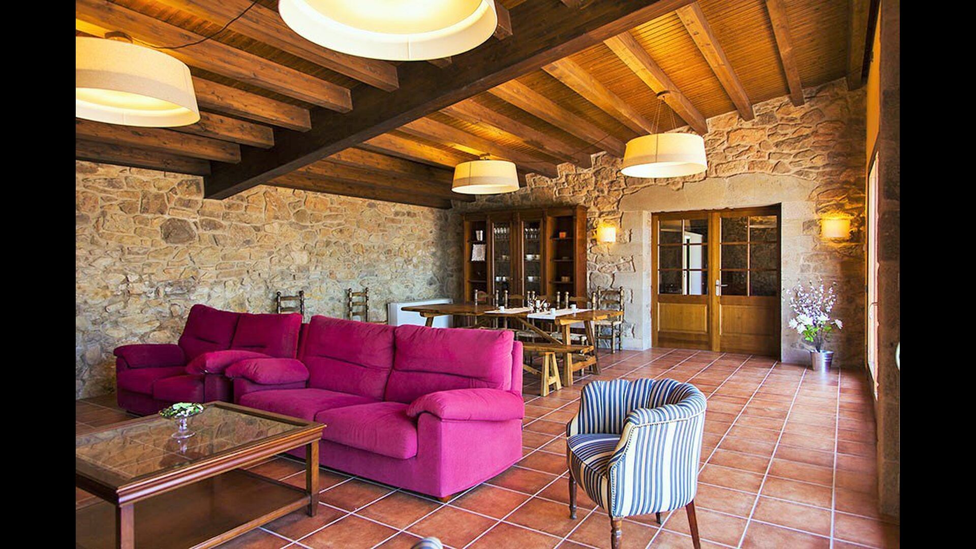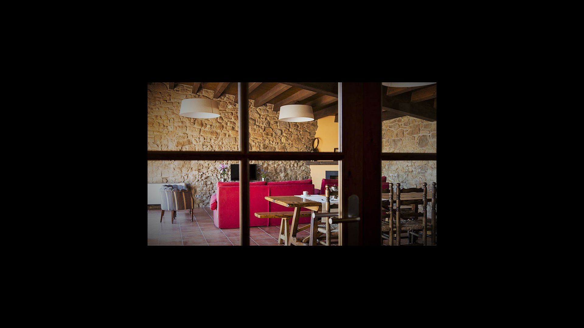 On the ground floor of the house, you enter a beautiful hall. To the left of the hall is the modern kitchen with freezer, oven, microwave, ceramic hob, dishwasher, espresso machine and even a draft beer tap. The kitchen has direct access to the large common room which has a beautiful Catalan refectory table (if you should want to eat in the shade for a day or two) and a cozy living room. From the common room's sliding doors you have direct access to the stone-paved terrace. The BBQ of the house is a bit further down in the garden. If you turn right from the kitchen you’ll meet the activity room, which probably will be the frame of some good hours, also for children in the group. Here are billiards, table tennis and darts.