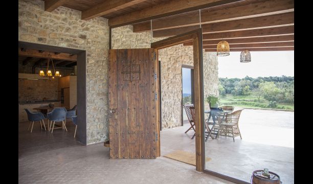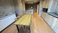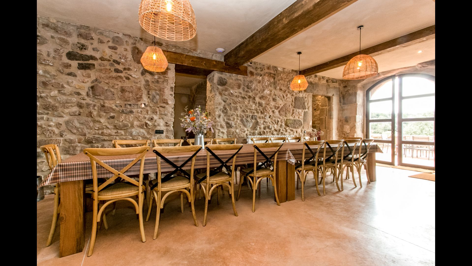 Des de la terrassa exterior, amb barbacoa, espai per menjar i gandules per relaxar-se, entrem directament a l'ampli menjador del Mas. Aquest actua com el cor de la casa, connectant les dues petites sales d'estar de la planta baixa amb la gran cuina. La cuina està totalment equipada amb 2 fogons de gas, 2 rentavaixelles, 2 neveres amb congelador, forn, microones i cafetera, així com una petita taula d'esmorzar.