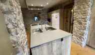 Connectada al menjador hi ha la cuina oberta amb mobles de fusta de roure natural, totalment equipada amb 2 neveres i 2 congeladors, forn, microones, vitroceràmica de gas, rentavaixelles, cafetera i a la mateixa habitació hi ha una zona de relax amb còmodes sofàs. En aquesta planta també hi ha un petit lavabo amb lavabo i lavabo.