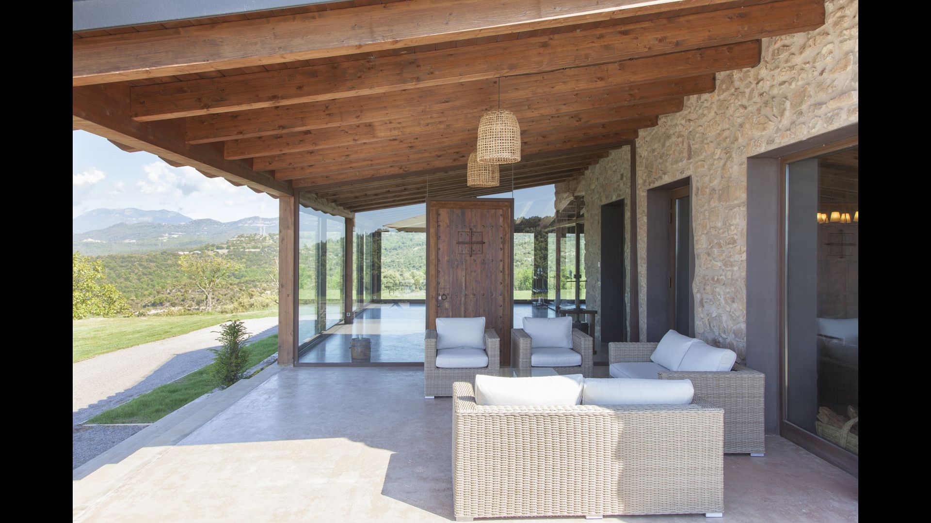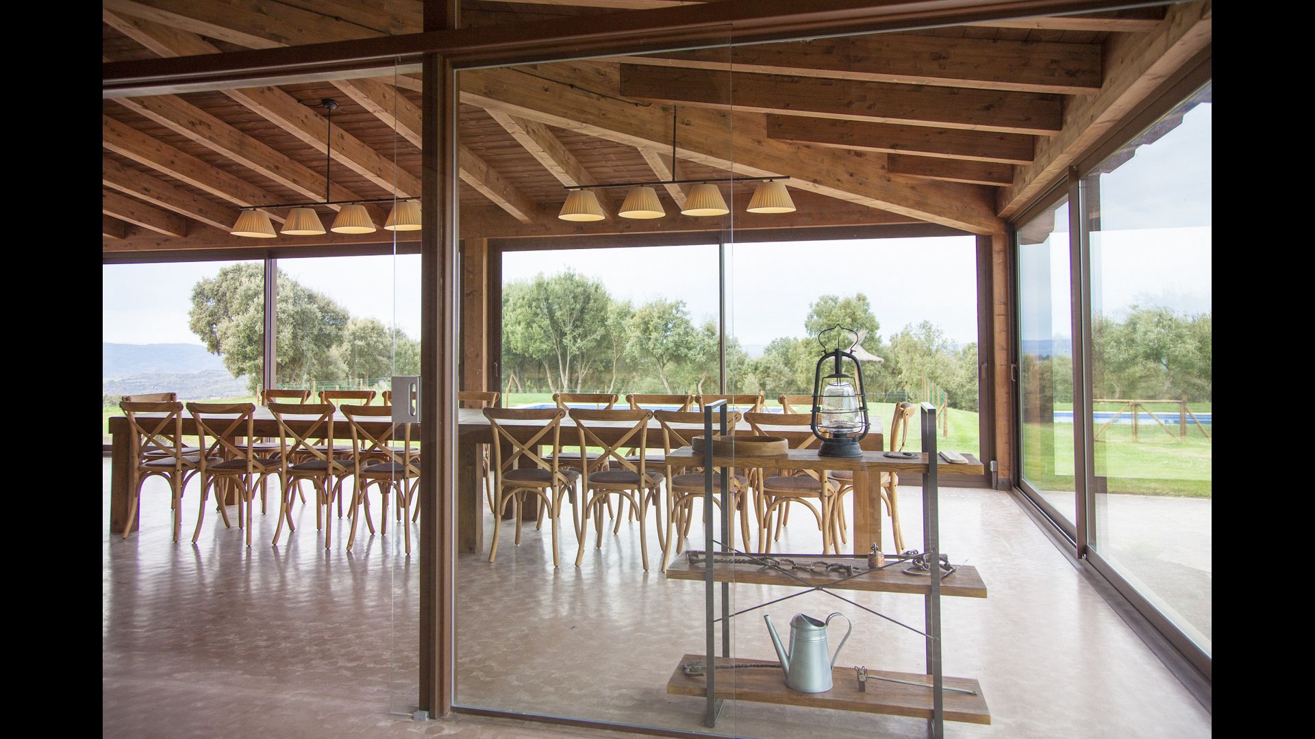 A la planta baixa hi ha un porxo situat davant de la piscina i amb unes vistes espectaculars a les muntanyes. Des d'aquí es pot entrar al menjador, que té vistes al jardí a través dels grans finestrals.