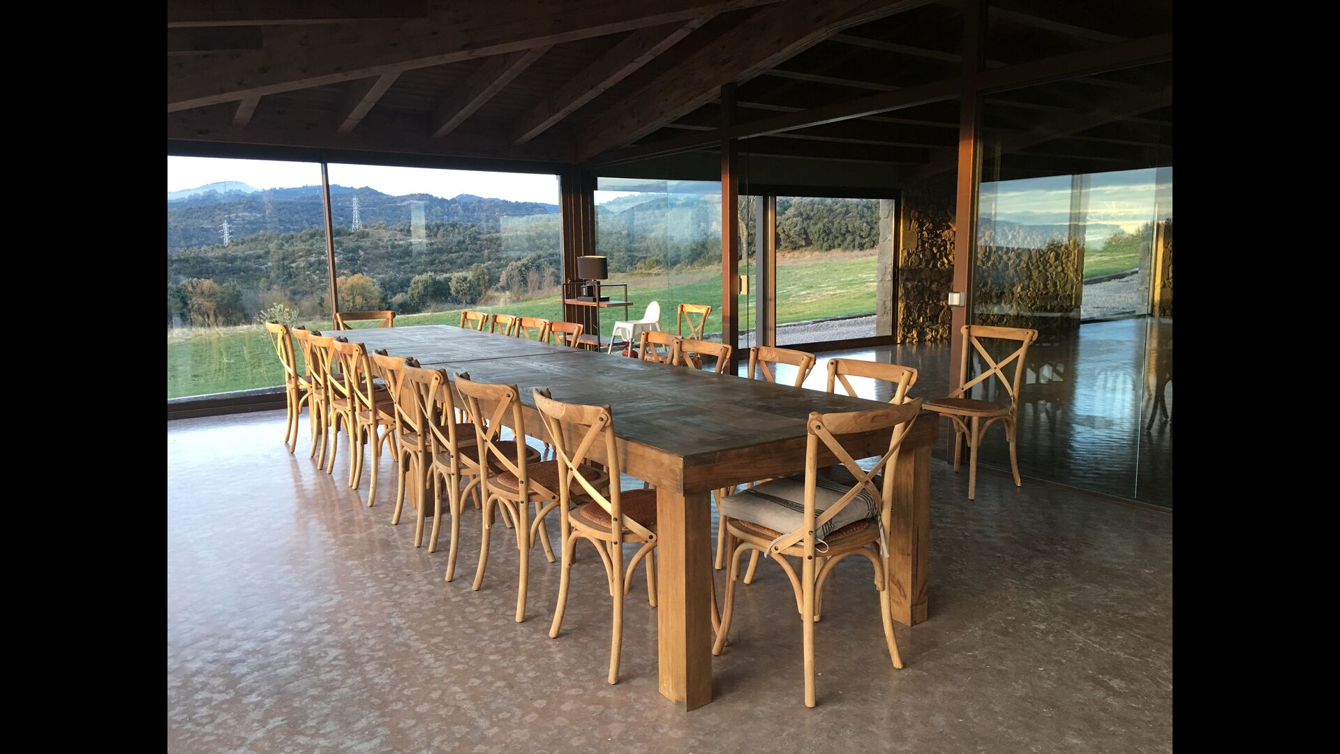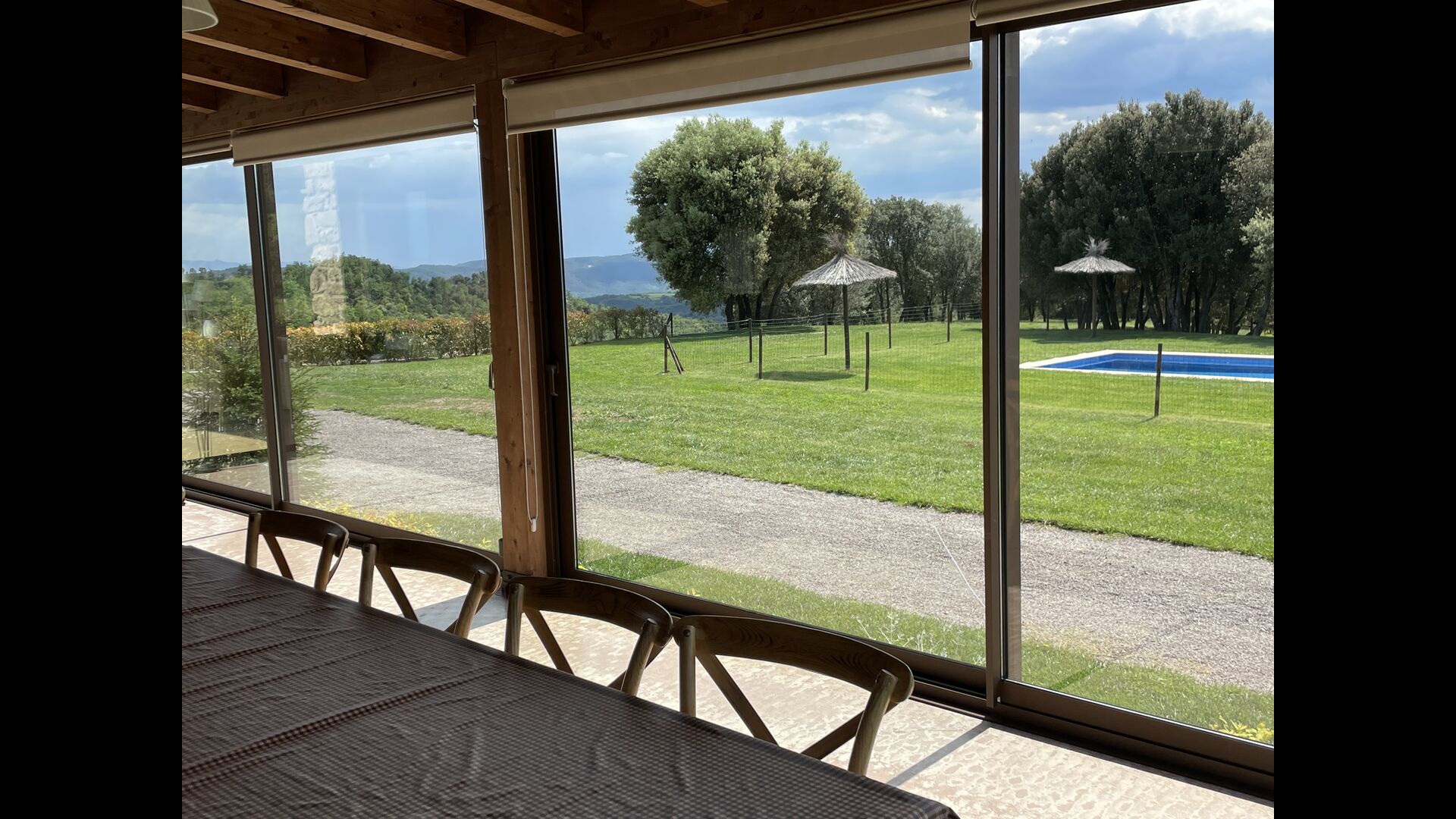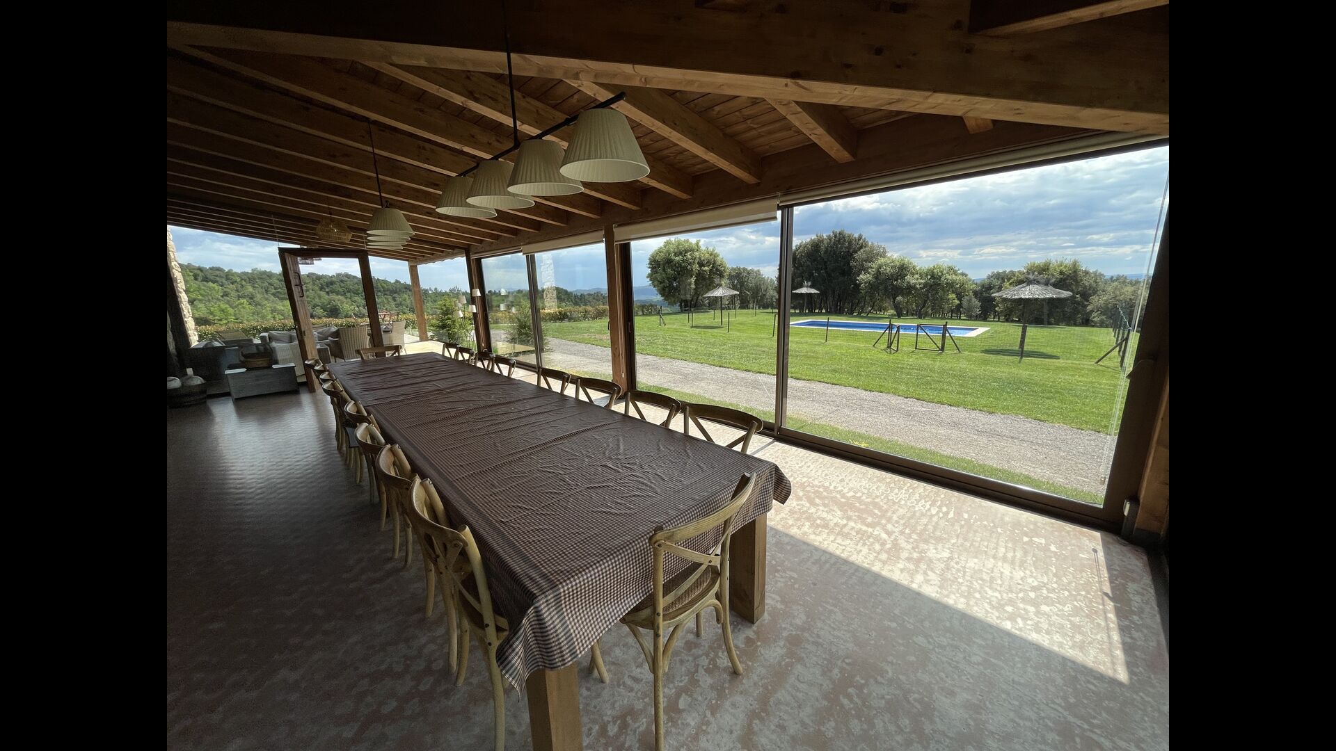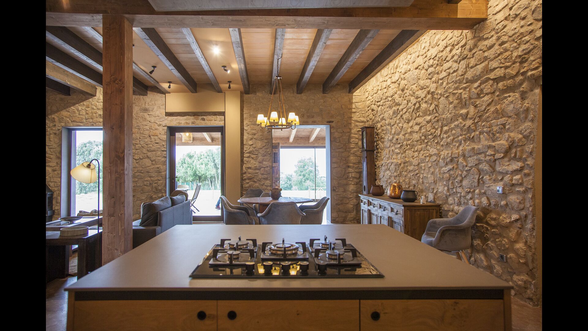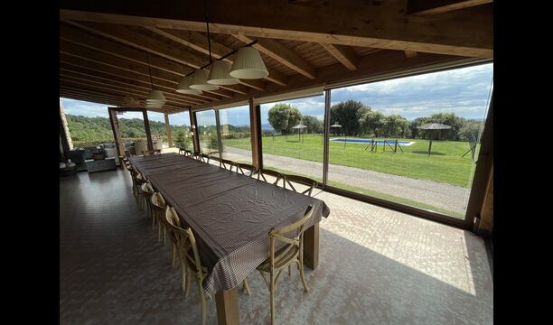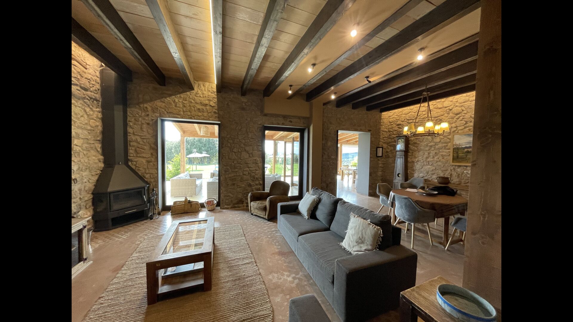 A la entrada de la casa hi ha un porxo situat al davant de la piscina, amb unes vistes espectaculars a les muntanyes. Des del porxo s’accedeix al menjador, amb uns grans finestrals oberts al jardí. Connectada al menjador trobem la cuina oberta, amb mobles de fusta de roure, completament equipada . Te 2 neveres, 2 congeladors, forn, microones, cuina de gas, rentaplats, cafetera. A la mateixa sala trobem la lar de foc, rodejada d’un àrea amb sofàs. En aquesta planta també hi ha un petit lavabo de cortesia.