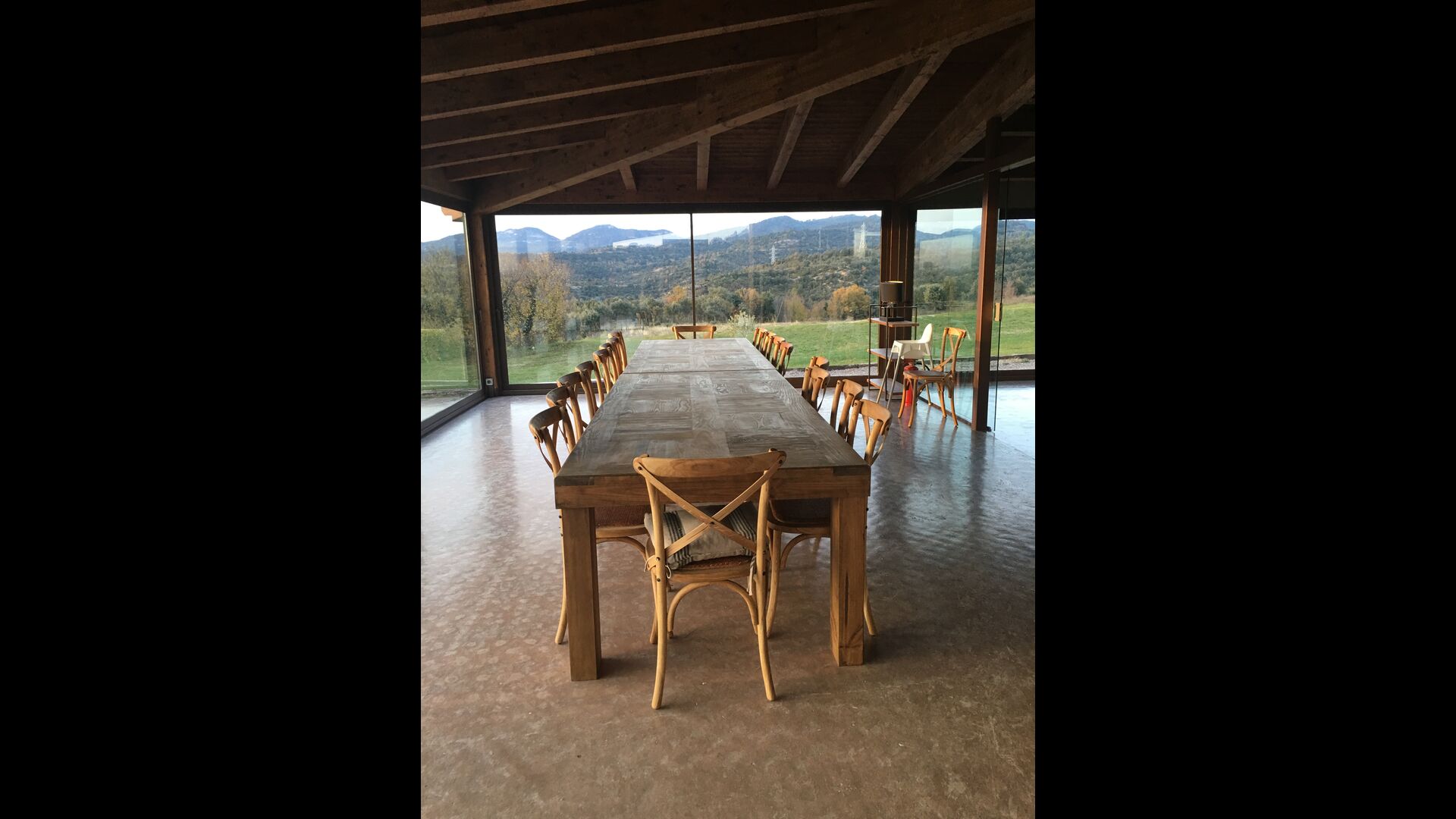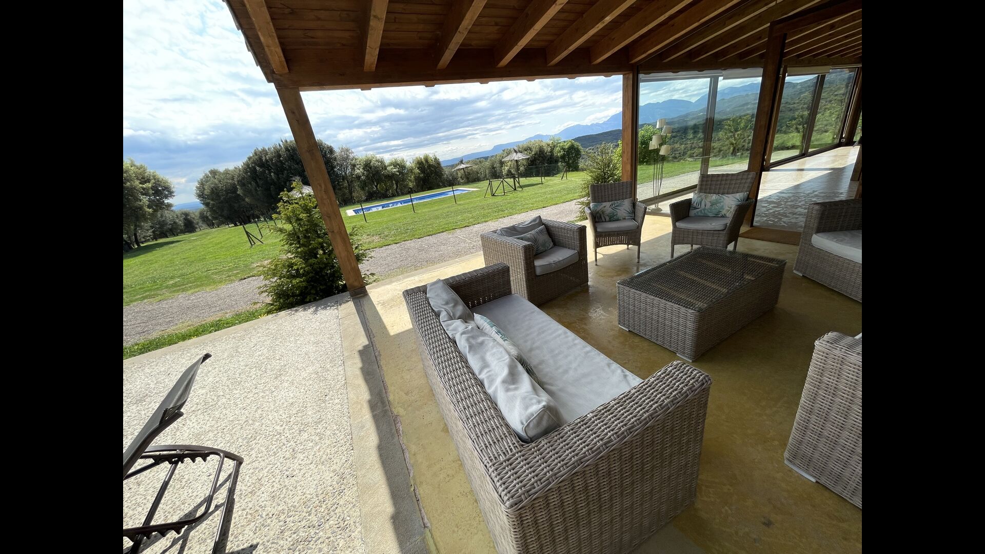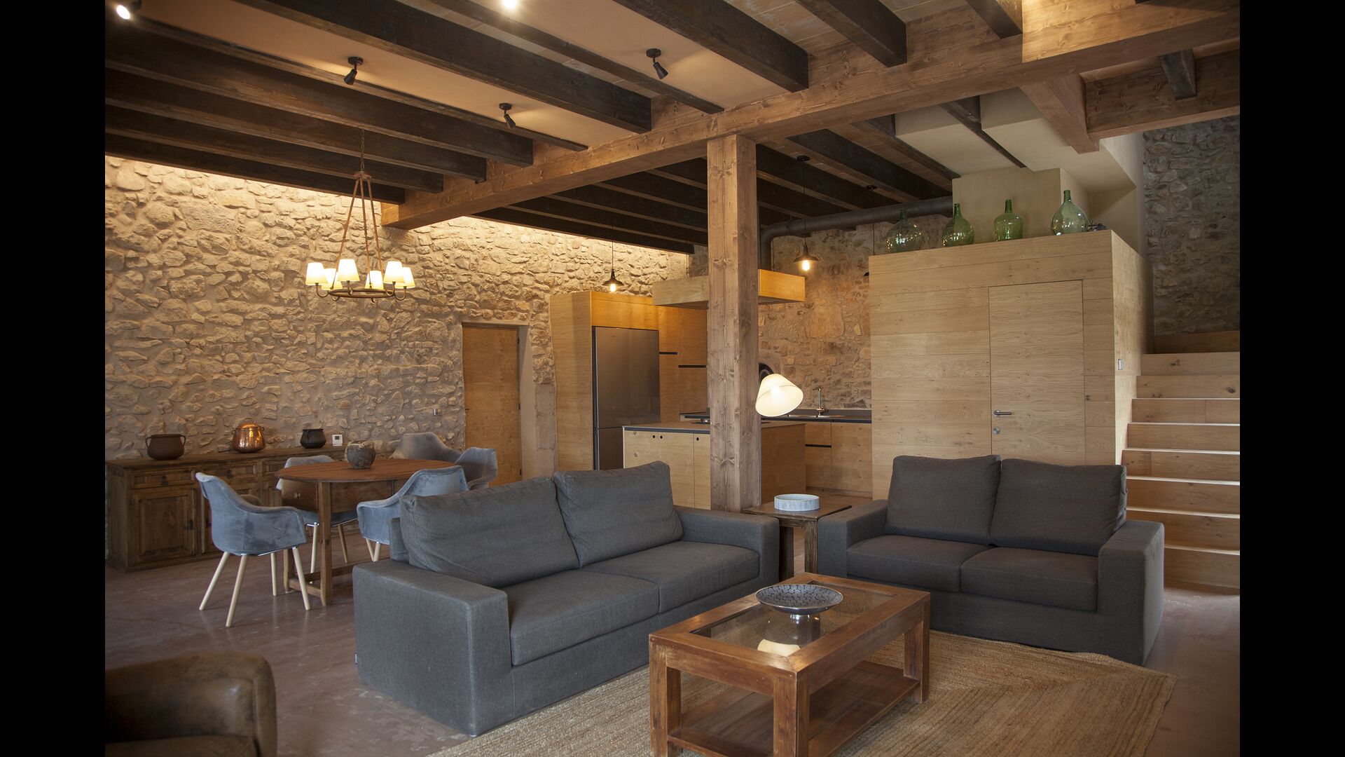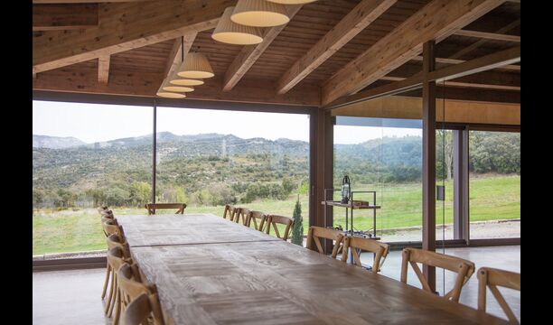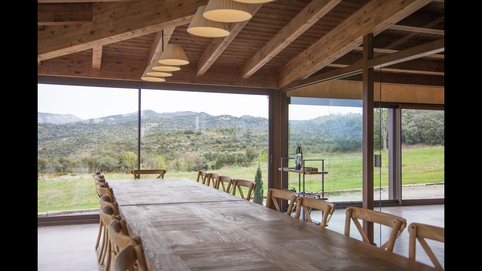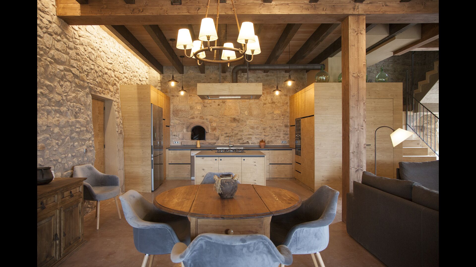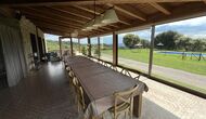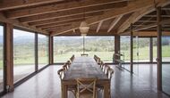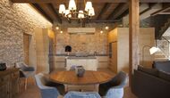 A la entrada de la casa hi ha un porxo situat al davant de la piscina, amb unes vistes espectaculars a les muntanyes. Des del porxo s’accedeix al menjador, amb uns grans finestrals oberts al jardí. Connectada al menjador trobem la cuina oberta, amb mobles de fusta de roure, completament equipada . Te 2 neveres, 2 congeladors, forn, microones, cuina de gas, rentaplats, cafetera. A la mateixa sala trobem la lar de foc, rodejada d’un àrea amb sofàs. En aquesta planta també hi ha un petit lavabo de cortesia.