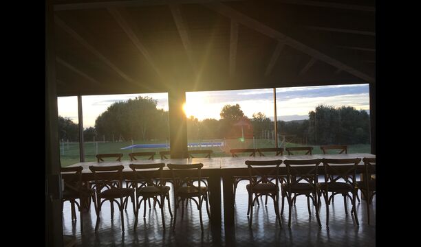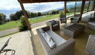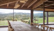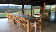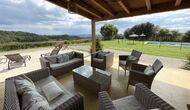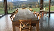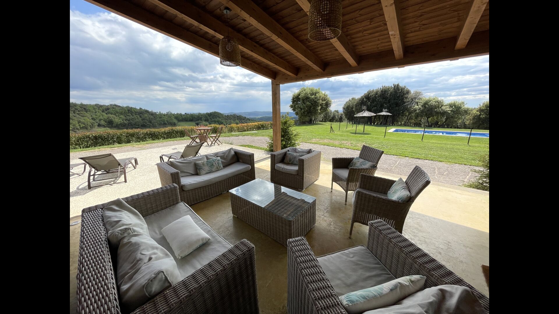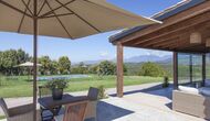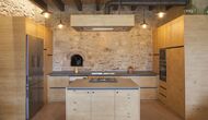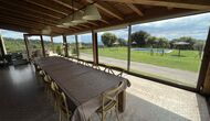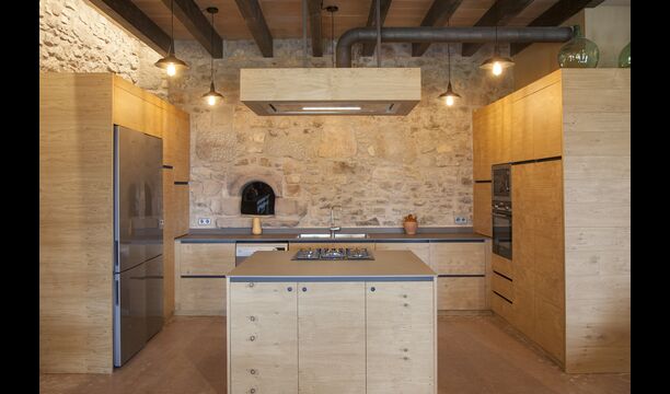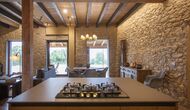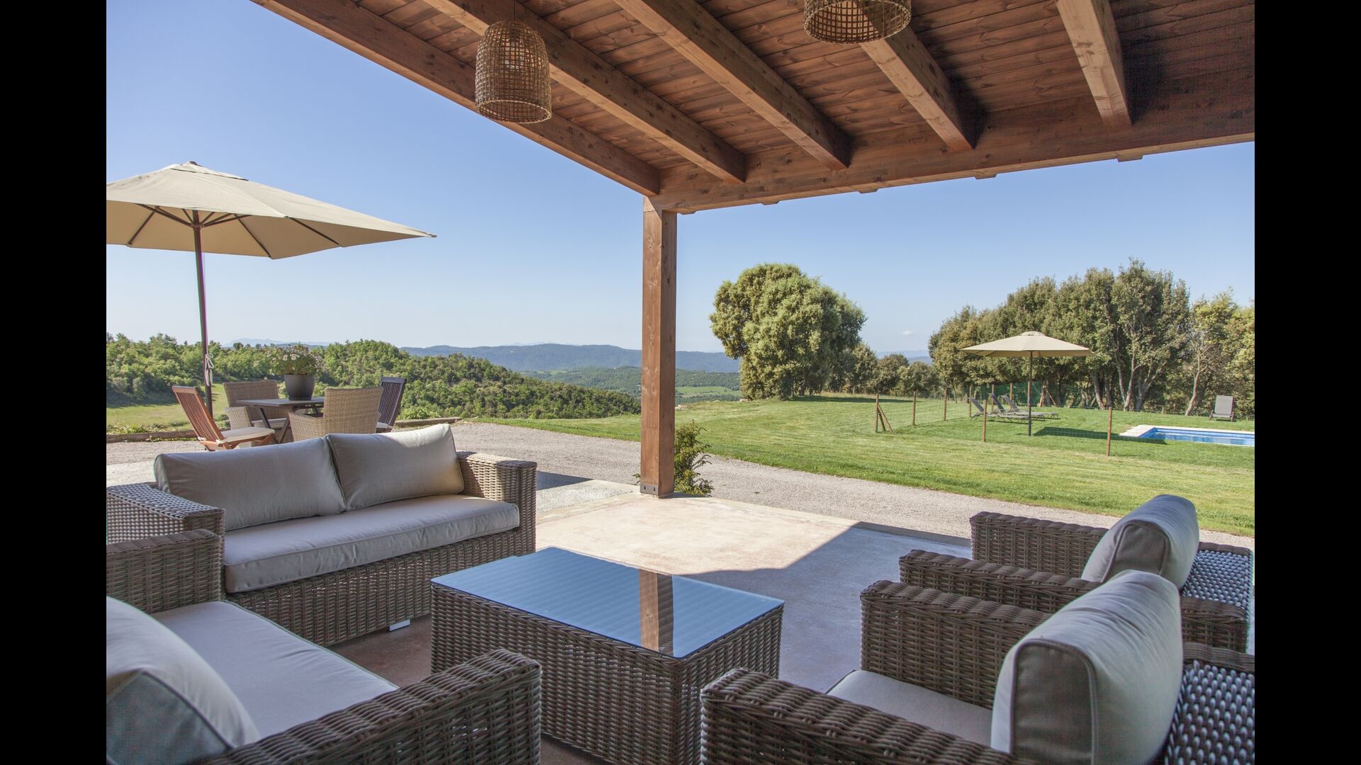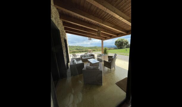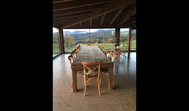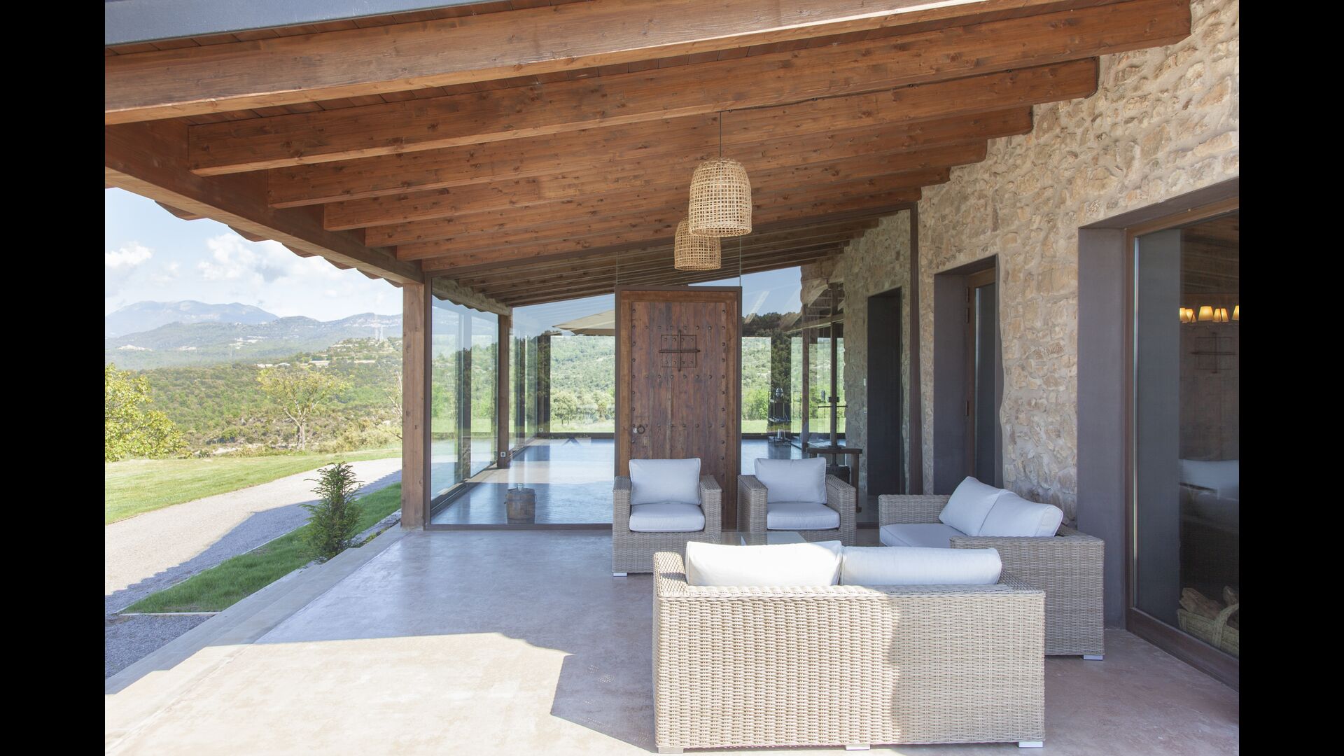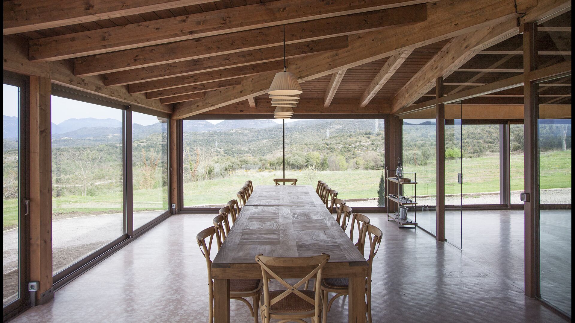 A la entrada de la casa hi ha un porxo situat al davant de la piscina, amb unes vistes espectaculars a les muntanyes. Des del porxo s’accedeix al menjador, amb uns grans finestrals oberts al jardí. Connectada al menjador trobem la cuina oberta, amb mobles de fusta de roure, completament equipada . Te 2 neveres, 2 congeladors, forn, microones, cuina de gas, rentaplats, cafetera. A la mateixa sala trobem la lar de foc, rodejada d’un àrea amb sofàs. En aquesta planta també hi ha un petit lavabo de cortesia.