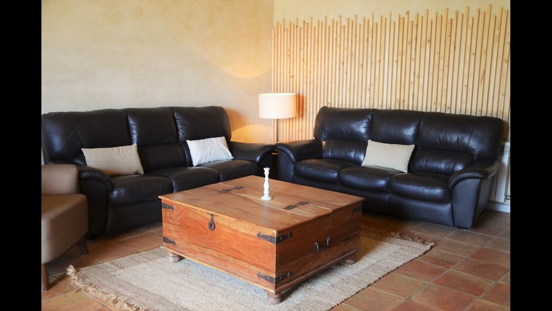 A l'entrada de l'exclusiva casaen dues plantes, hi ha una acollidora zona d'estar a l'ombra. La sala d'estar gran està decorada de manera tradicional i amb instal·lacions modernes. L'habitació ofereix una taula de menjador, sofà i pantalla plana. La cuina té tot el que necessita una cuina: nevera, congelador, rentadora, fogons, forn i microones.