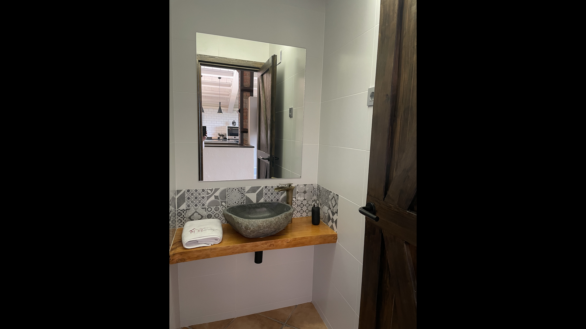 Com que la casa està situada en pendent, la primera planta té accés gairebé directe des de l'aparcament, on a través d'una gran terrassa s'accedeix a l'ampli saló menjador amb la cuina moderna i molt ben equipada, menjador amb un bonic taula llarga de fusta; i zona de sofàs amb sofàs, TV i llar de foc. A més, hi ha una gran habitació doble amb accés directe a la terrassa i un bany complet amb dutxa.