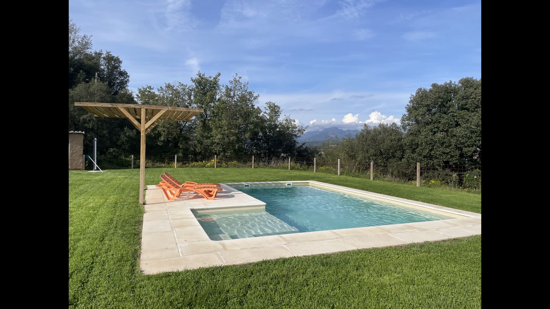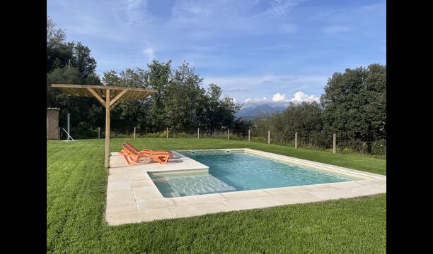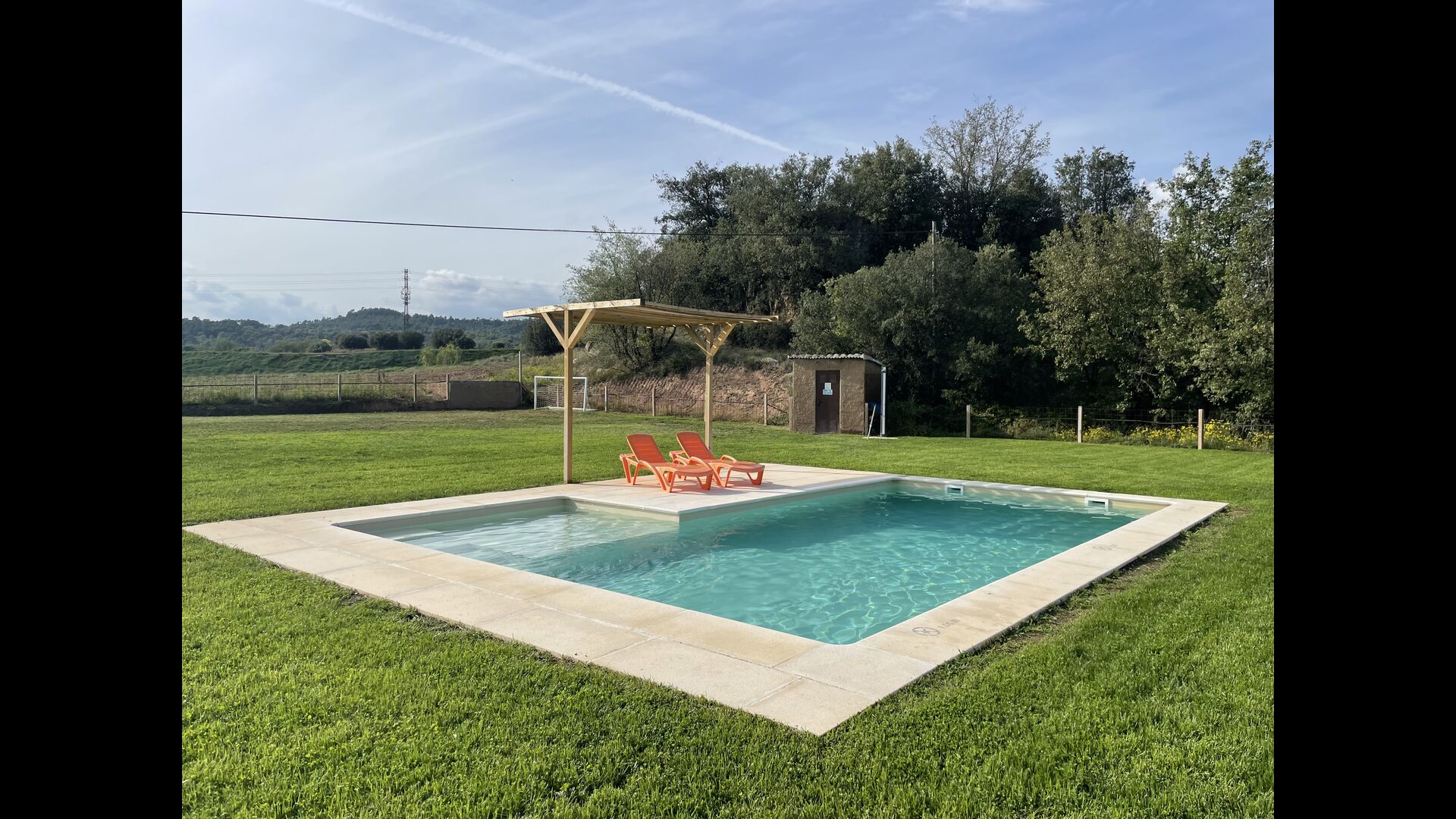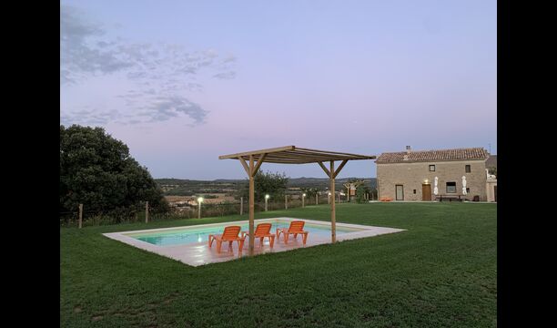 La piscina és de 8 x 4 metres i també té vistes al camp. I per als calorosos dies d'estiu, el Xavi i la Mabel han fet una coberta permanent, així que els que desitgeu una mica d'ombra teniu l'opció.També té una escala a un lateral,que la fa ideal per a nens més petits.