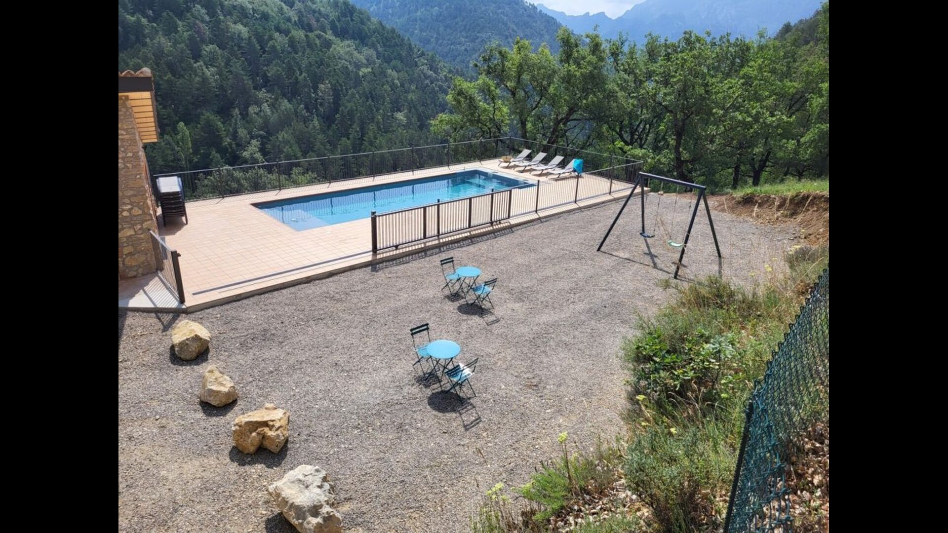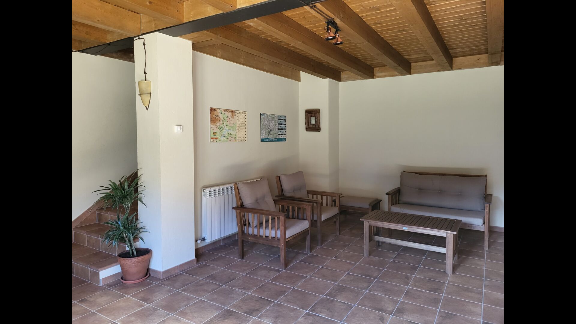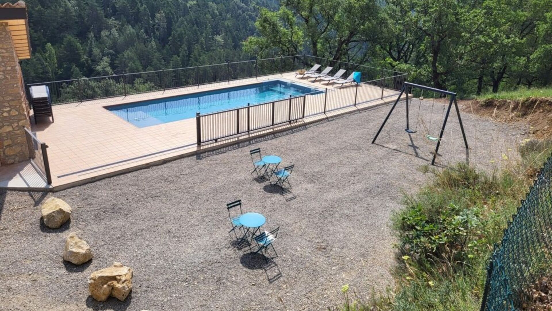 Fora de la casa hi trobareu unataula exterior amb quatre cadires, un banc de fusta,6 gandules i un gronxador. A més, hi ha una spiscina en construcció, que es preveu que estigui enllestida cap al maig.