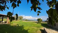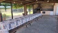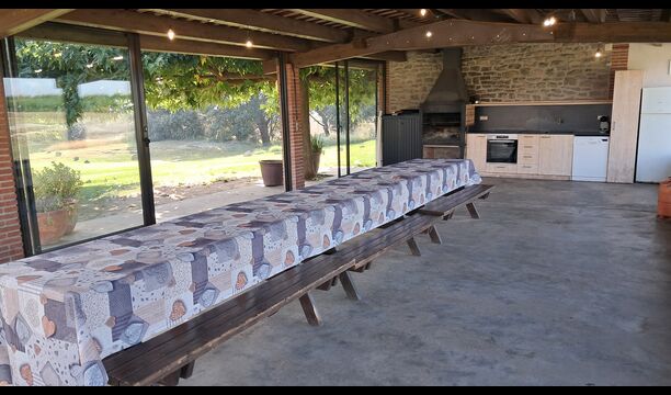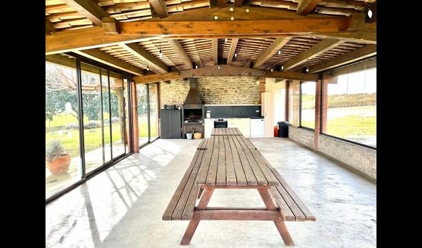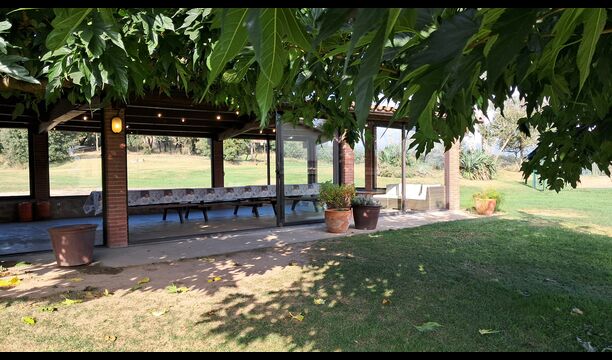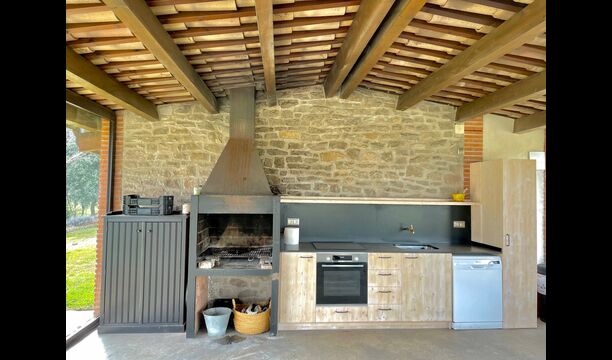 El jardí és gran i la nova terrassa coberta molt gran proporciona una excel·lent base exterior. Totes les parets de vidre són portes corredisses, de manera que la terrassa pot estar oberta o tancada com prefereixi. La terrassa té una taula llarga, perquè tots puguin menjar junts i en un extrem, una zona de descans amb sofàs. A l'altre extrem hi ha una cuina exterior completa amb placa d'inducció, forn, rentavaixelles grill, pica i nevera perquè pugui gaudir de el bon temps des del matí fins al vespre.