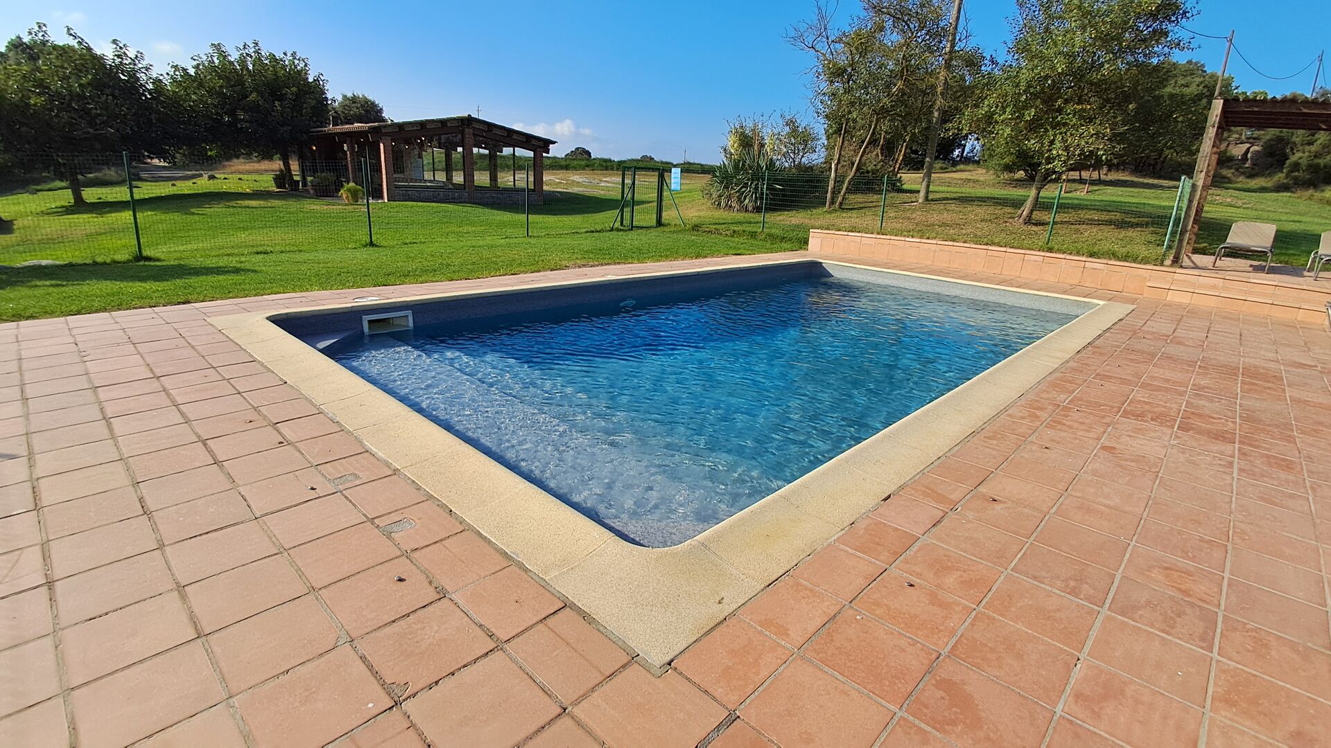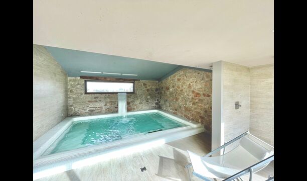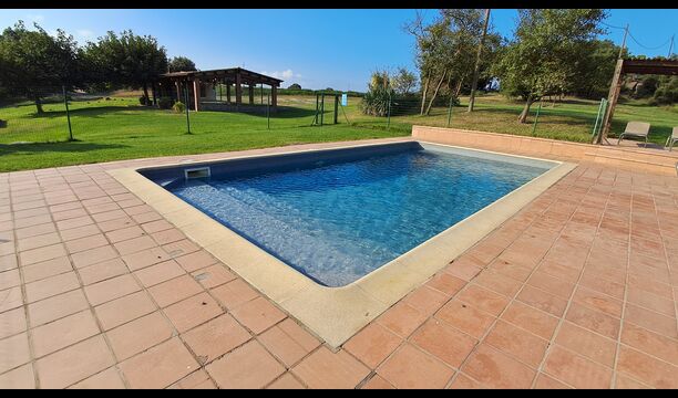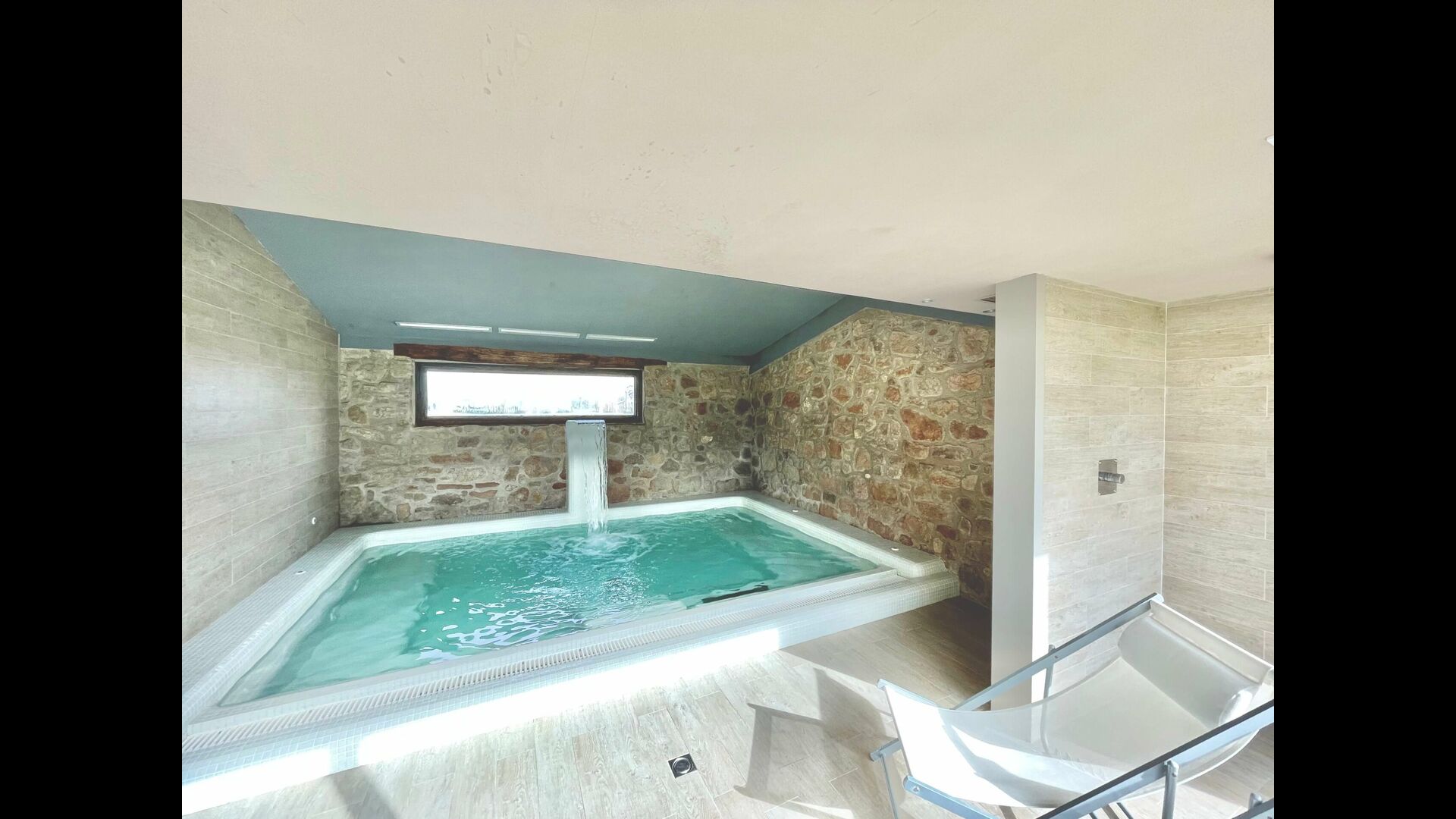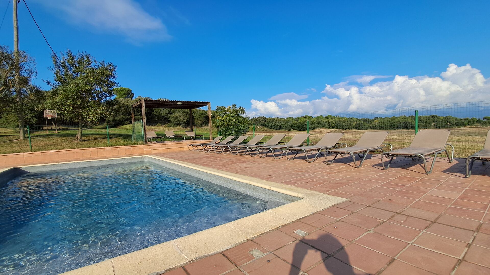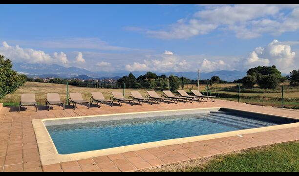 Al costat de la terrassa hi ha la piscina de 8 x 4 metres, la qual està tancada per a la protecció dels infants més petits. Des de la piscina té una vista panoràmica cap al poble i amb els Pirineus a el fons. En un edifici adjunt a la casa, ara hi ha un gran spa interior, que està inclòs en el preu i també pot ser utilitzat per nens acompanyats per adults.