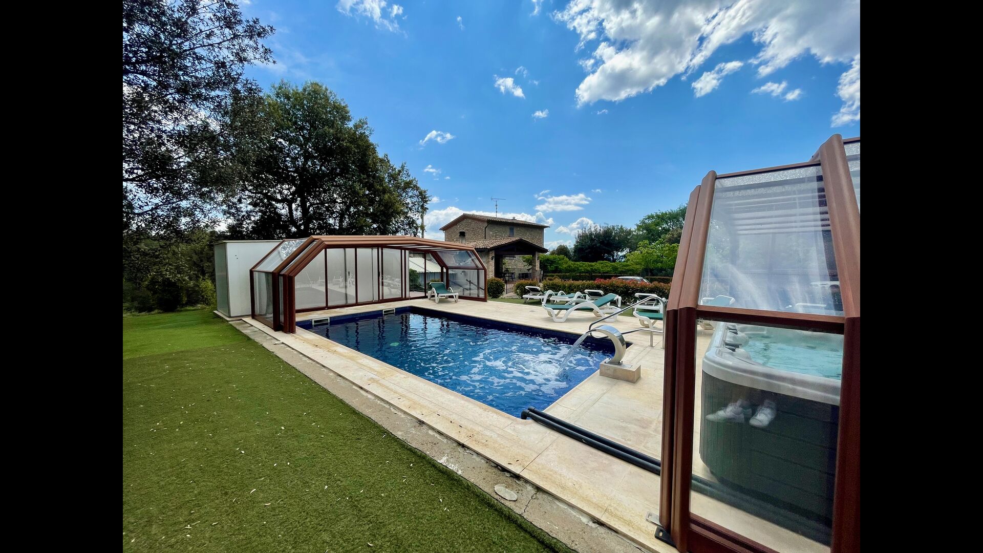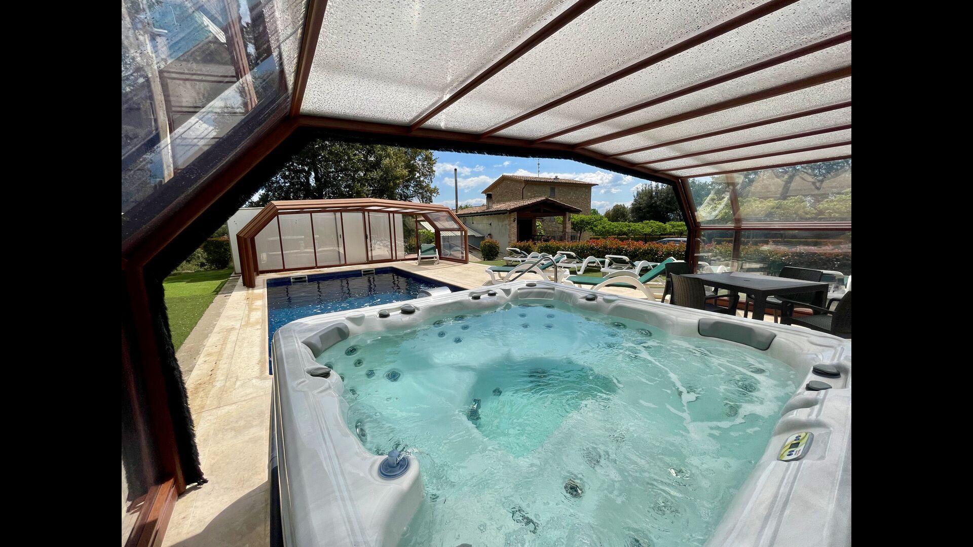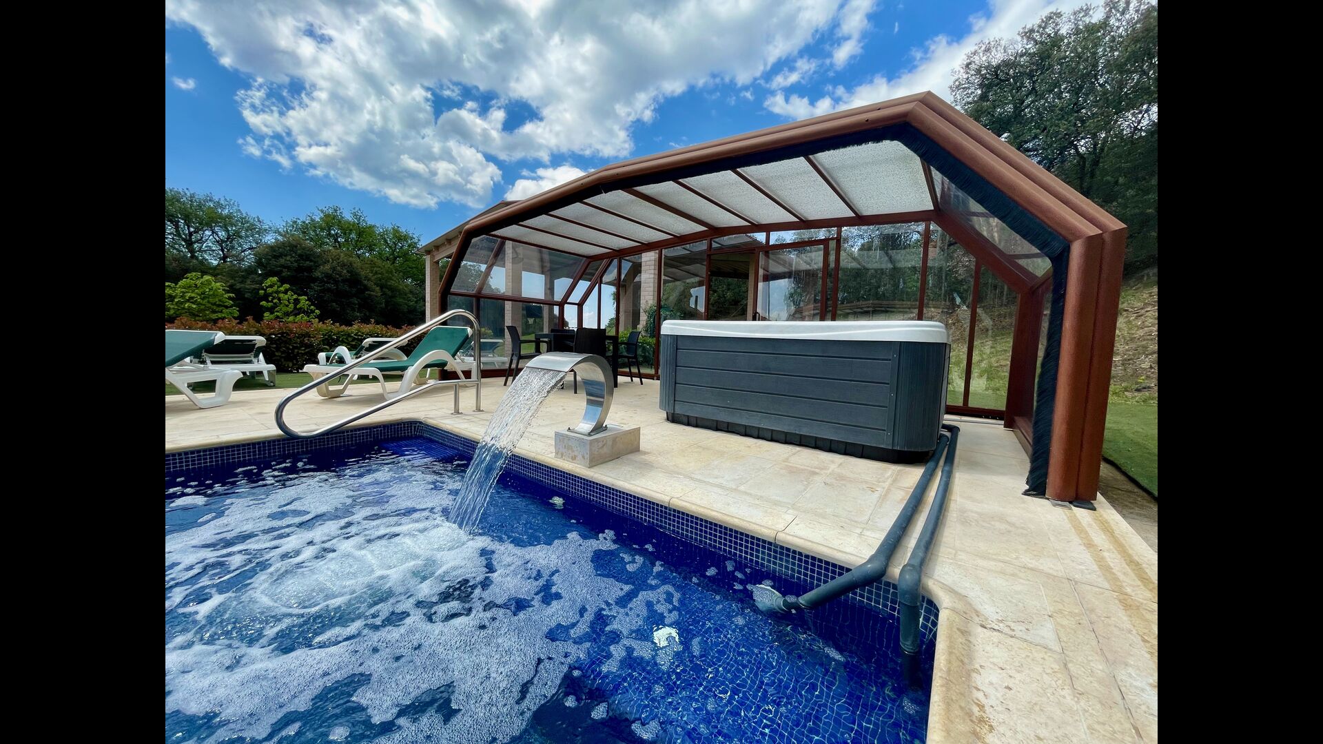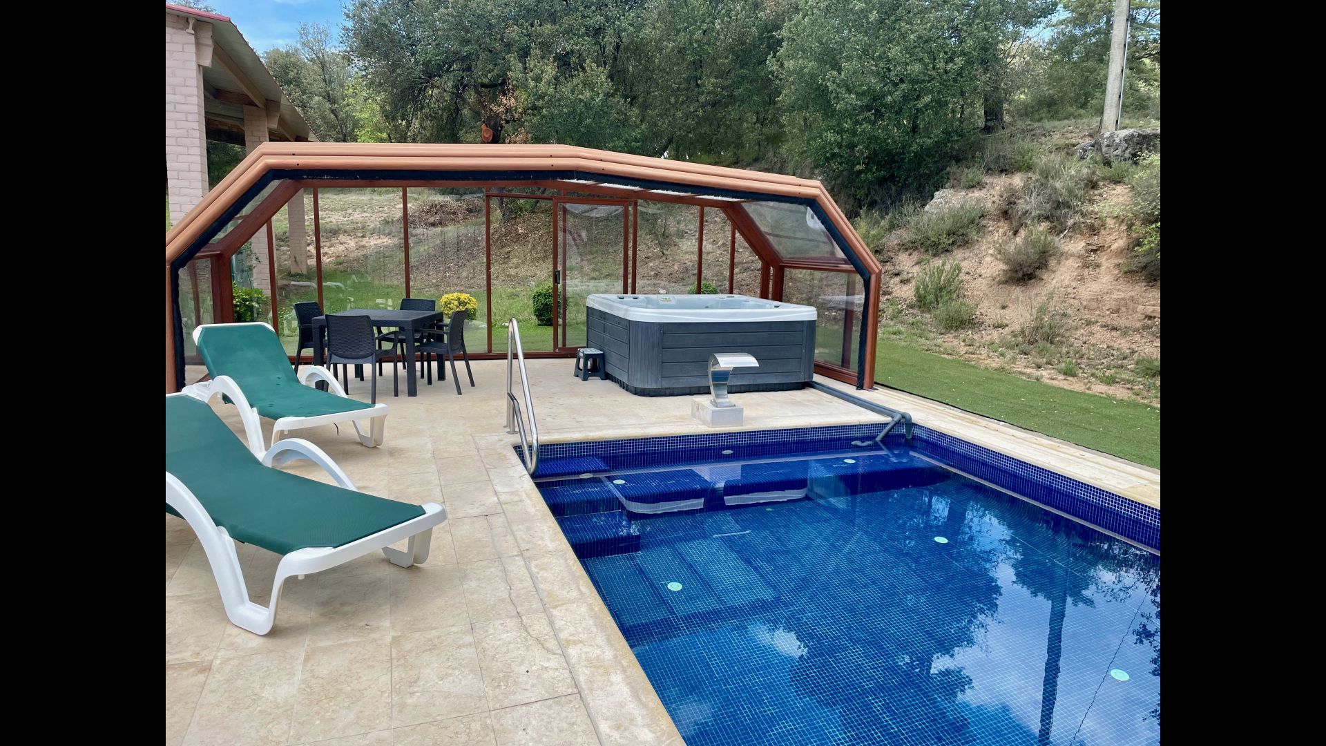 • Lovely heated pool area with Jacuzzi which can be all uncovered in the Summertime