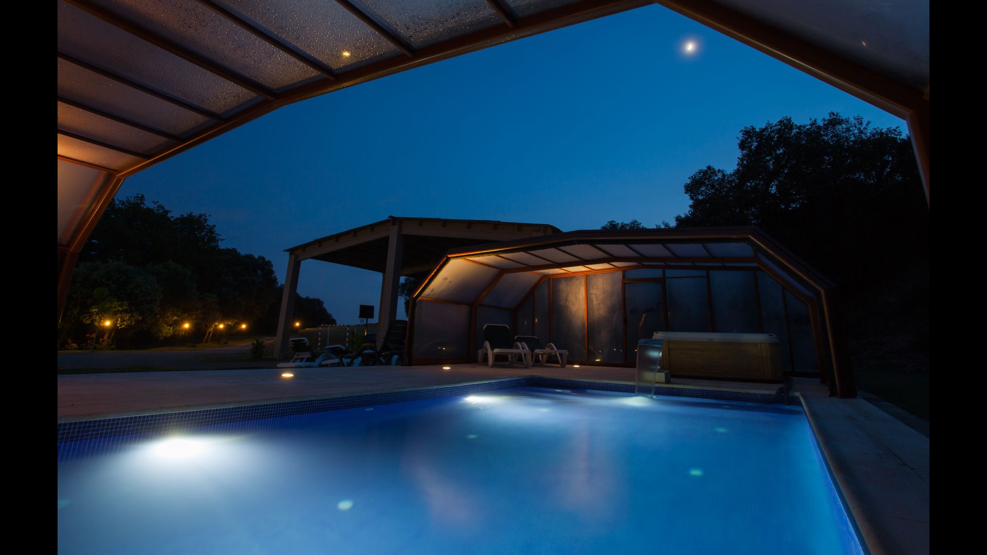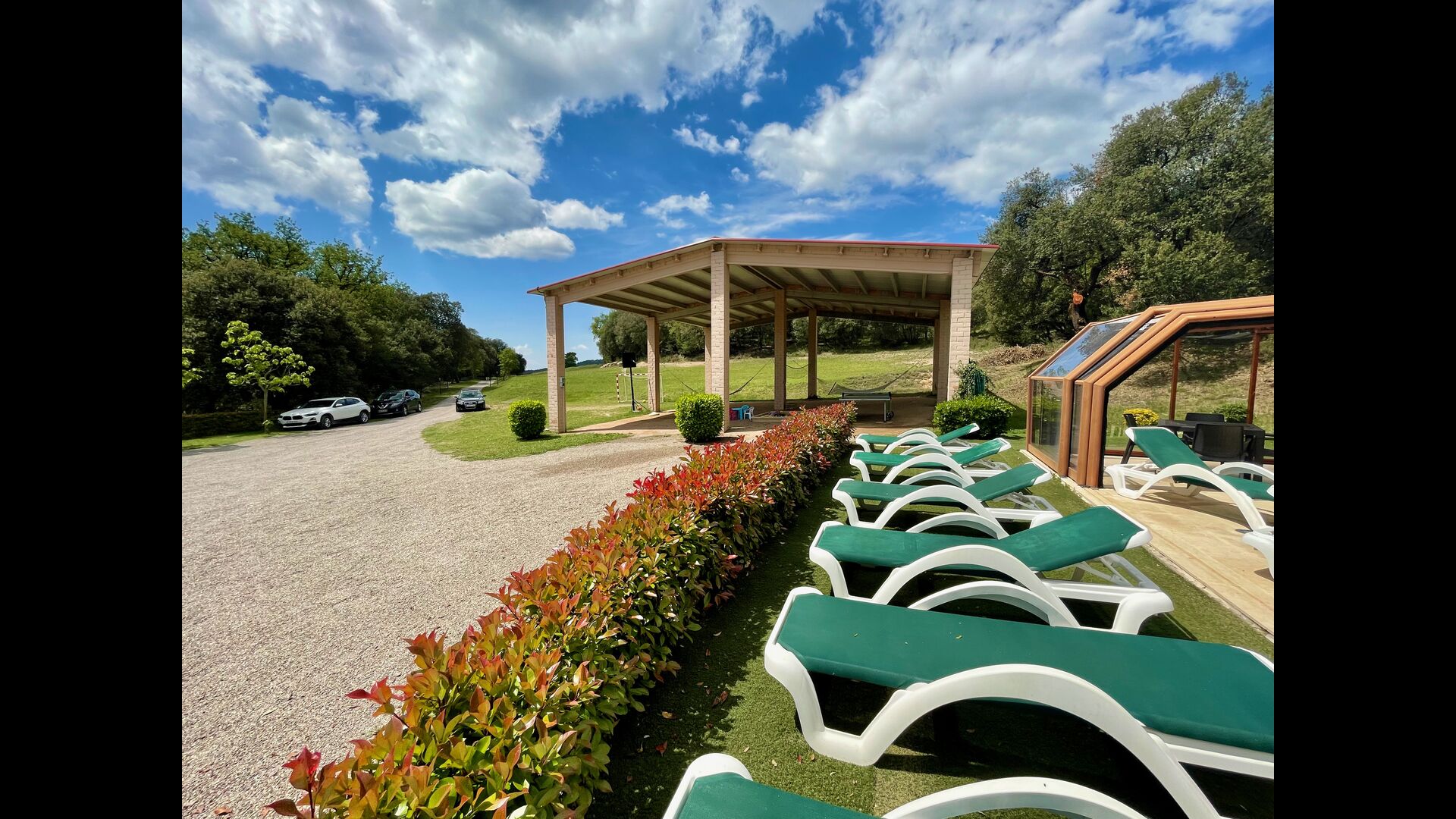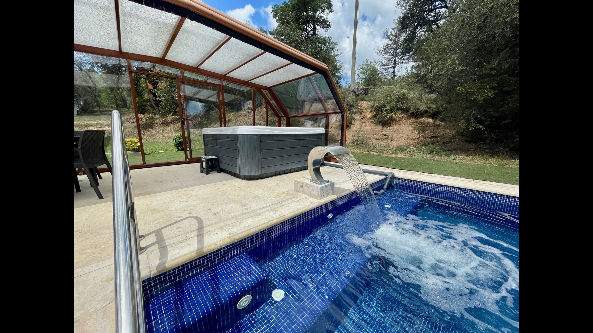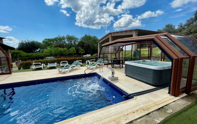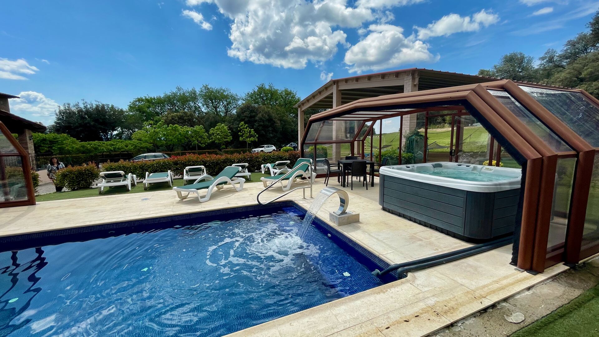 • Lovely heated pool area with Jacuzzi which can be all uncovered in the Summertime