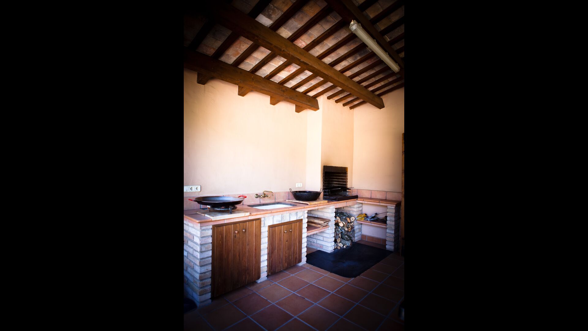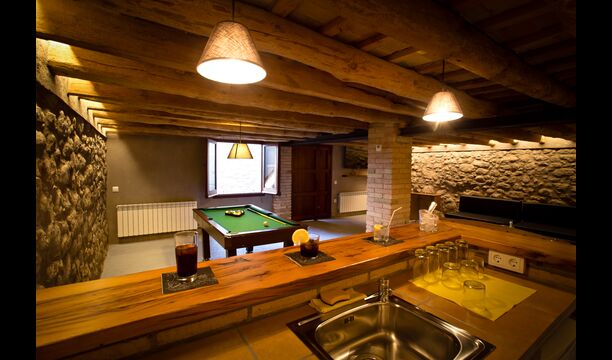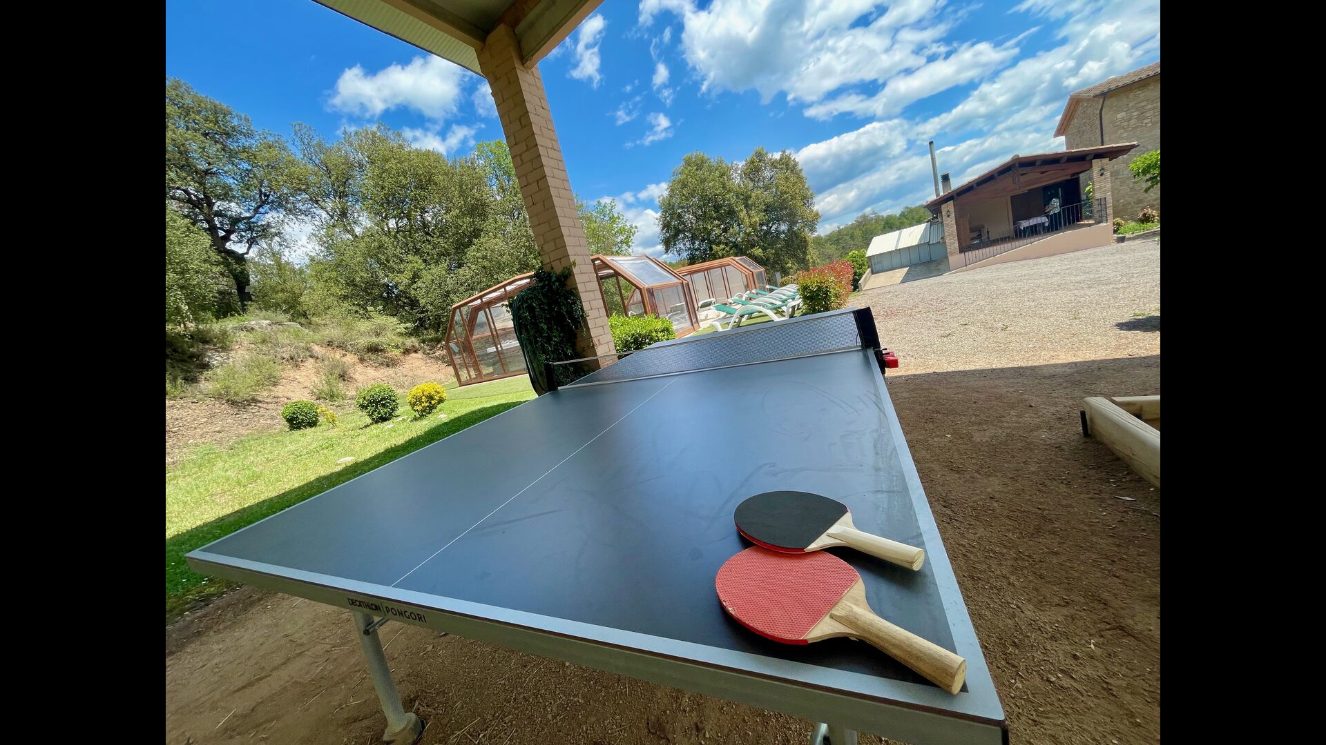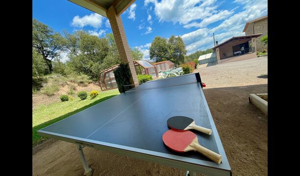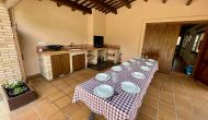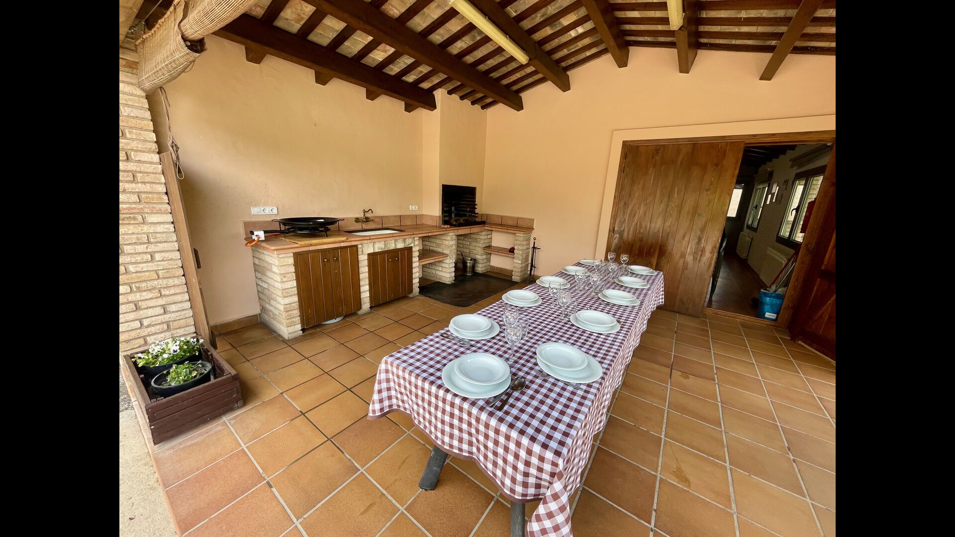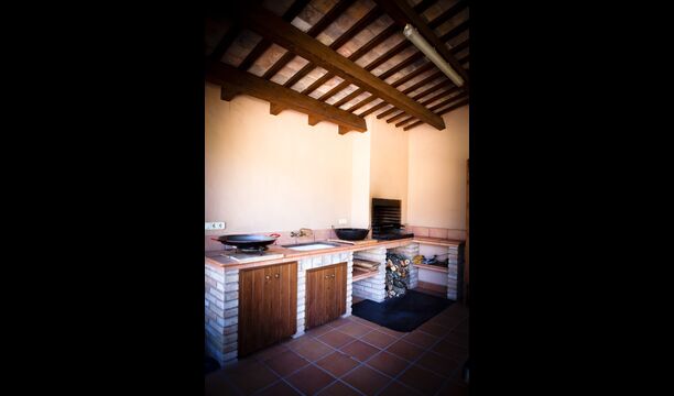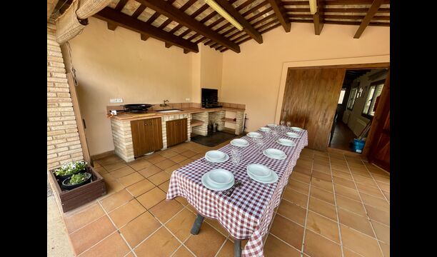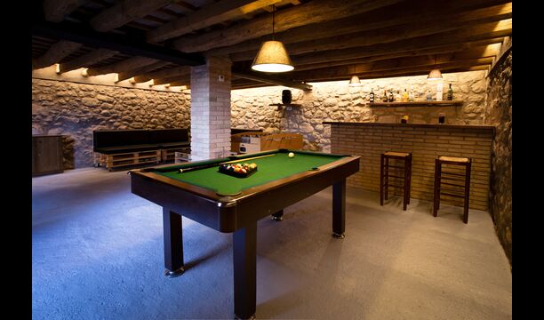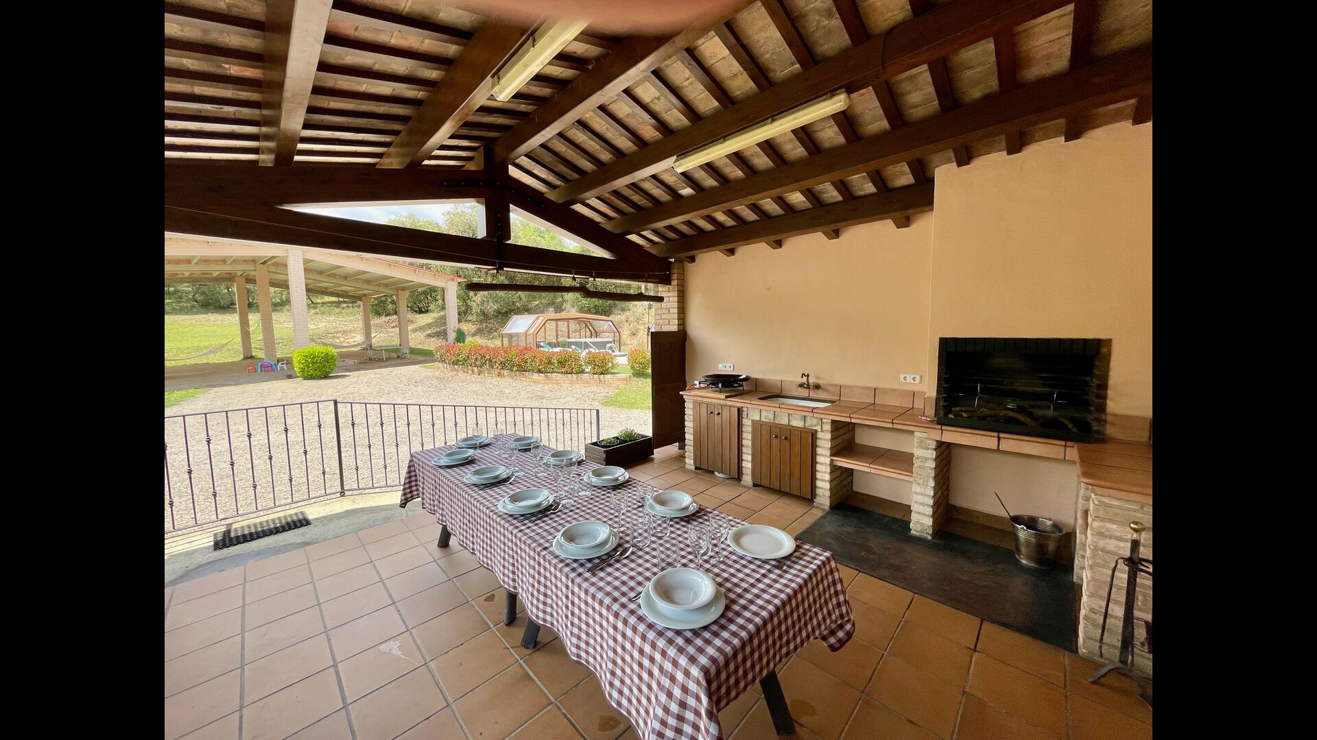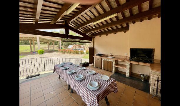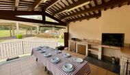 The outdoor area is large and in continuation of the covered terrace with BBQ and a wonderful outdoor kitchen is also a small hall with a long dining table as well as Billiards, table football and a large flat TV.