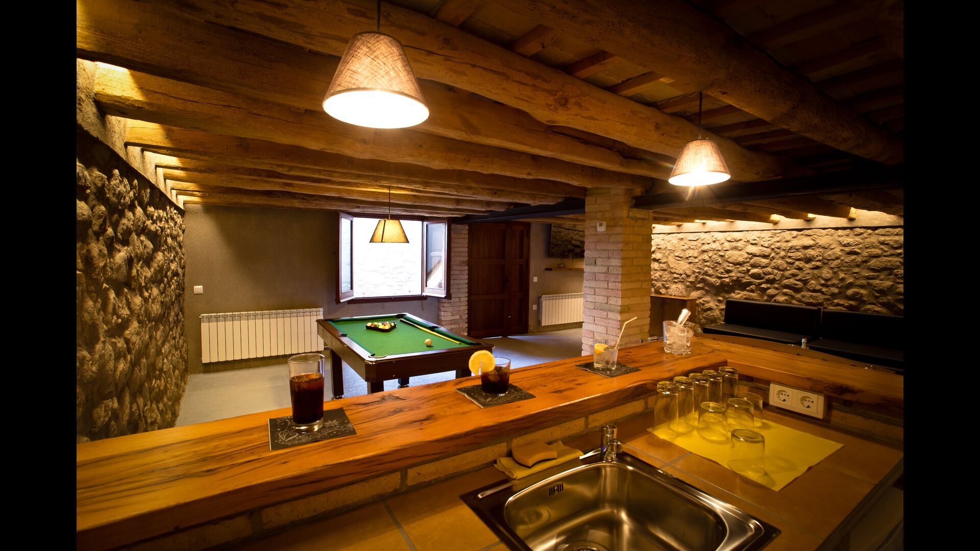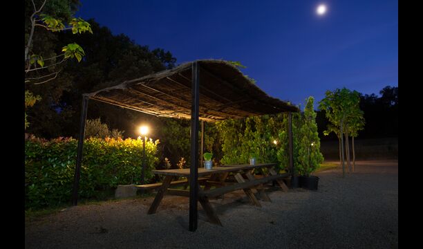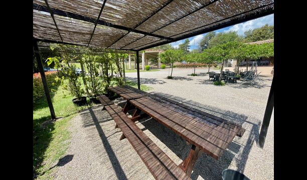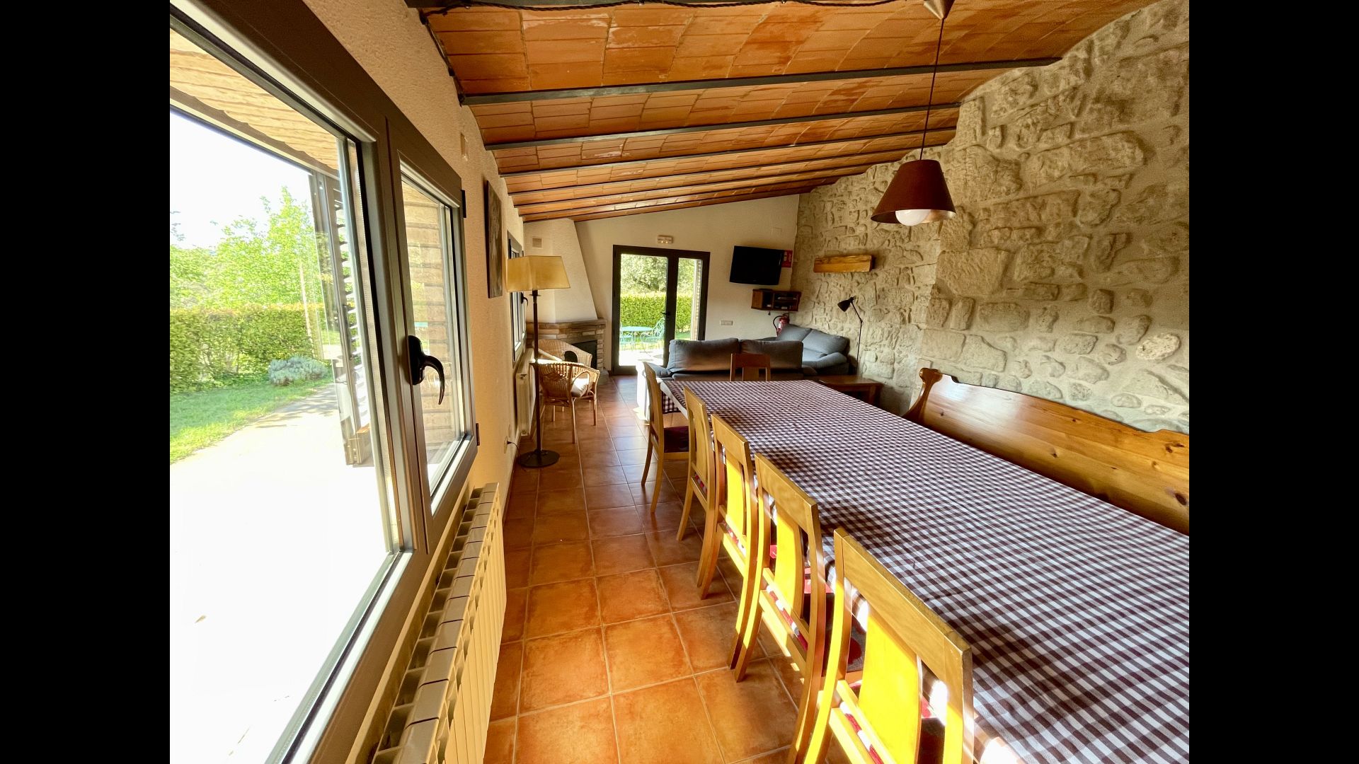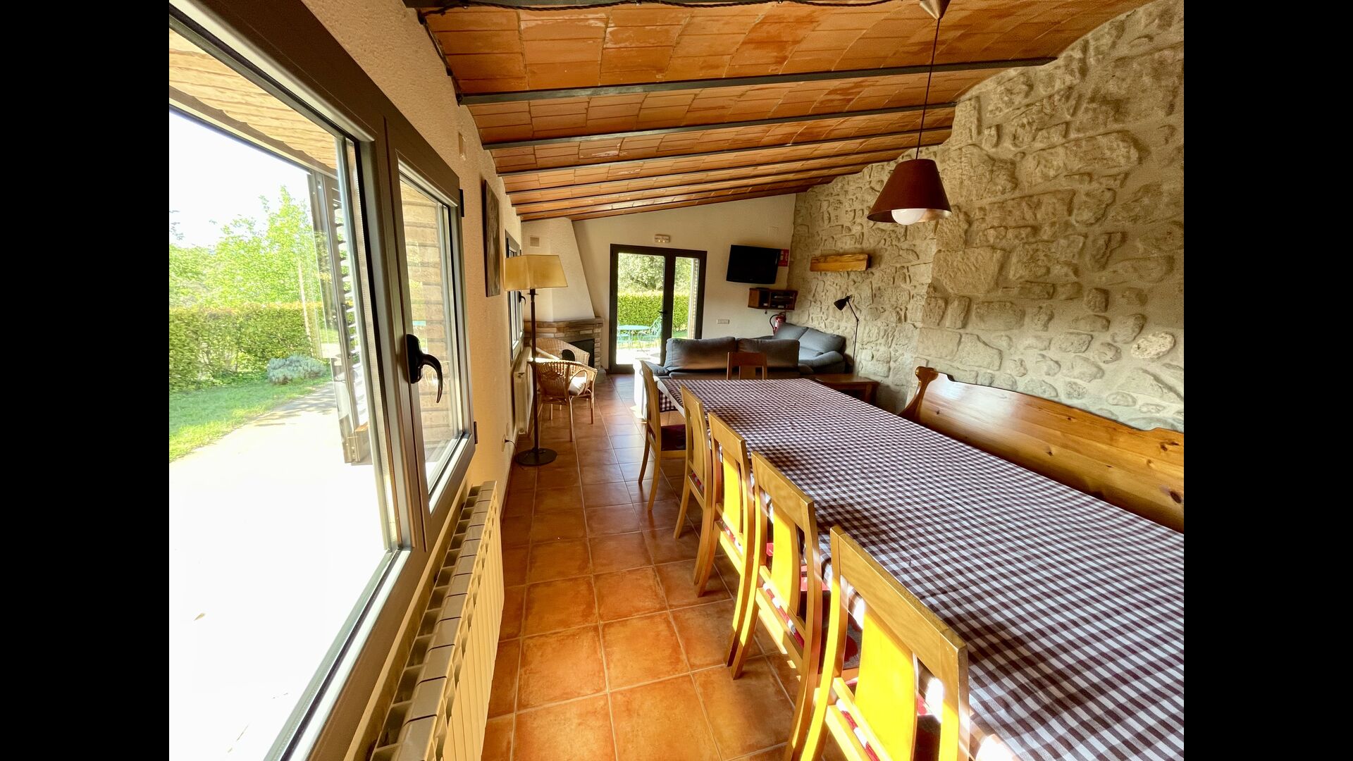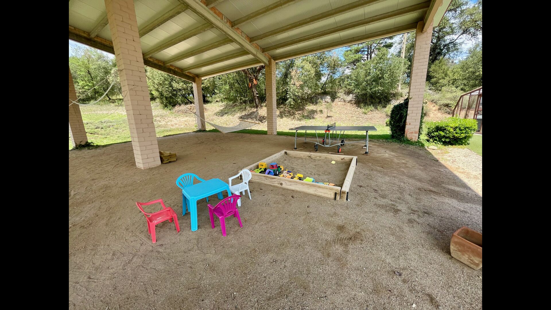 The outdoor area is large and in continuation of the covered terrace with BBQ and a wonderful outdoor kitchen is also a small hall with a long dining table as well as Billiards, table football and a large flat TV.