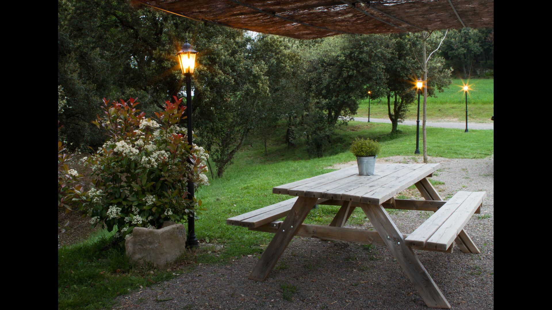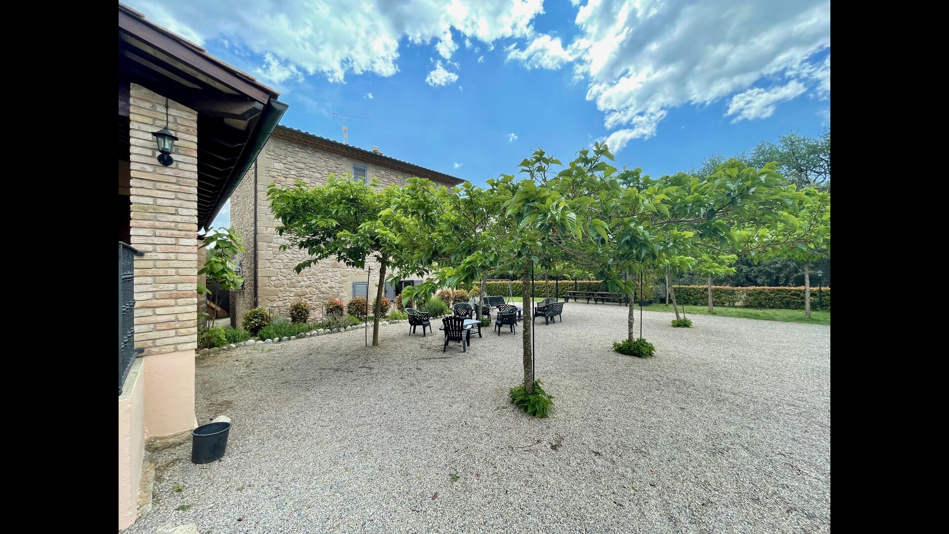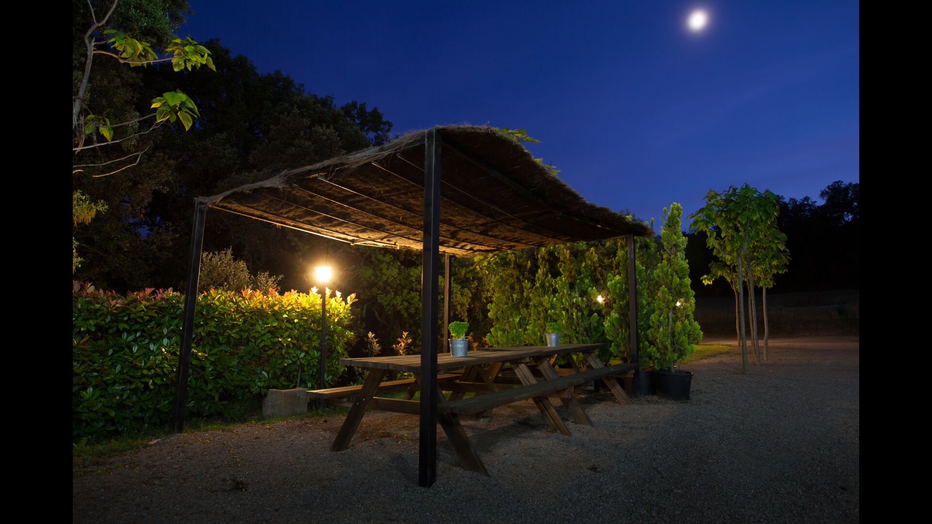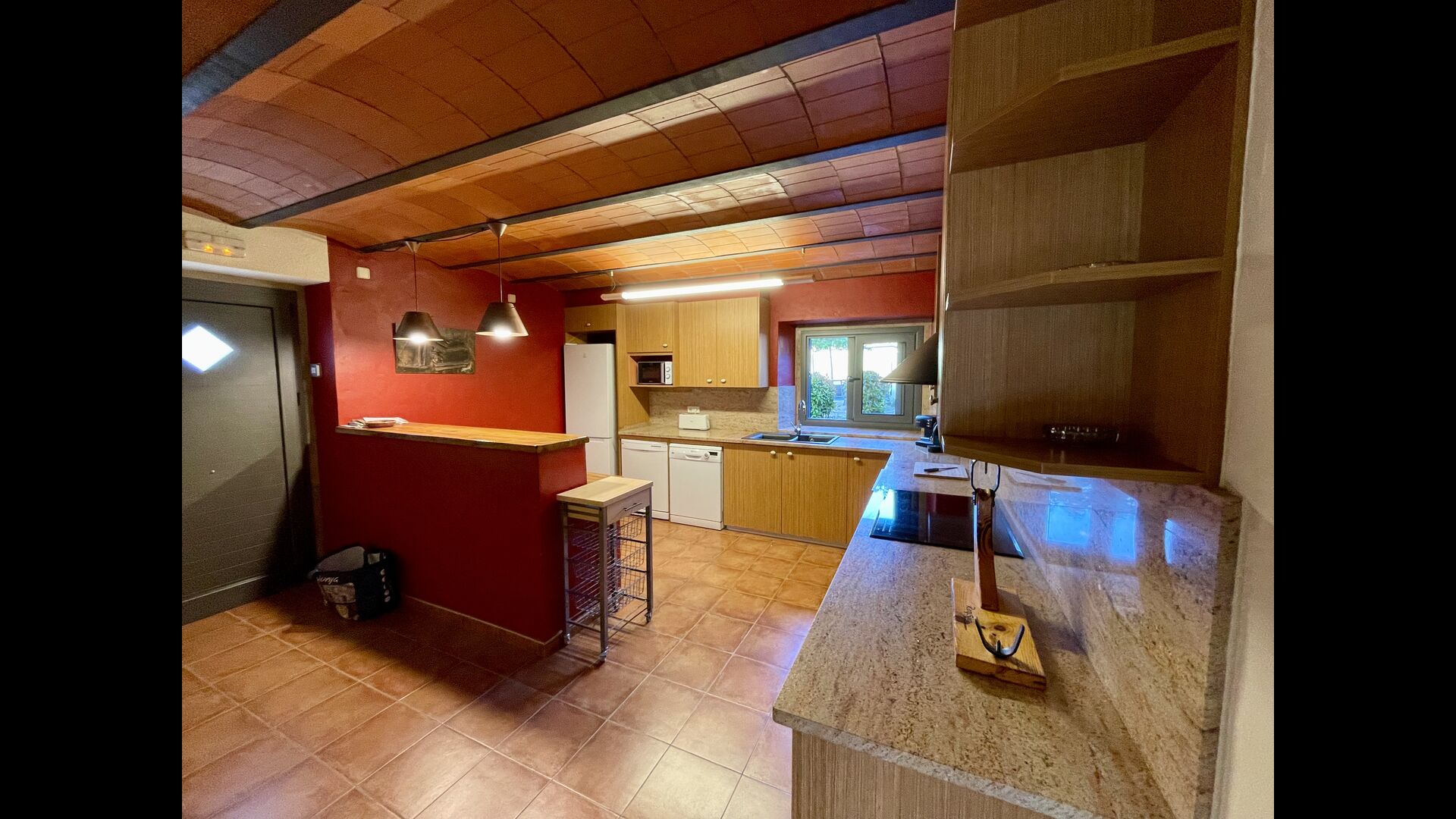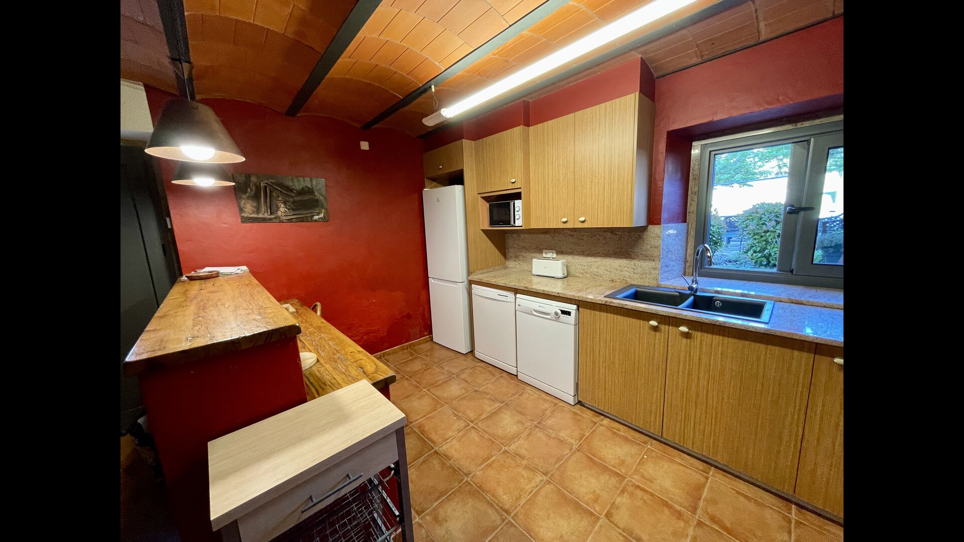 The outdoor area is large and in continuation of the covered terrace with BBQ and a wonderful outdoor kitchen is also a small hall with a long dining table as well as Billiards, table football and a large flat TV.
