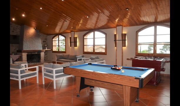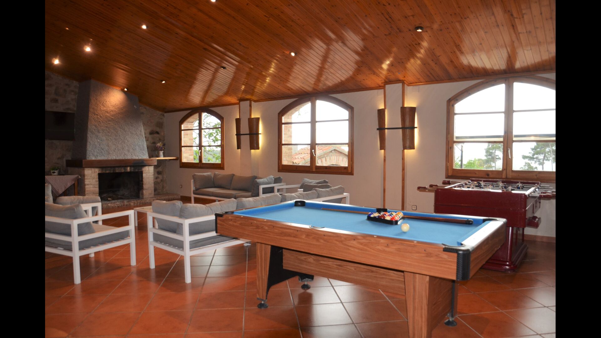La gran qualitat de la casa és el gran saló al costat de la casa, on té sofás, llar de foc i TV, un gran menjador i una nevera addicional. A més; billar i una taula de ping-pong i, molt convenient, dos baños.