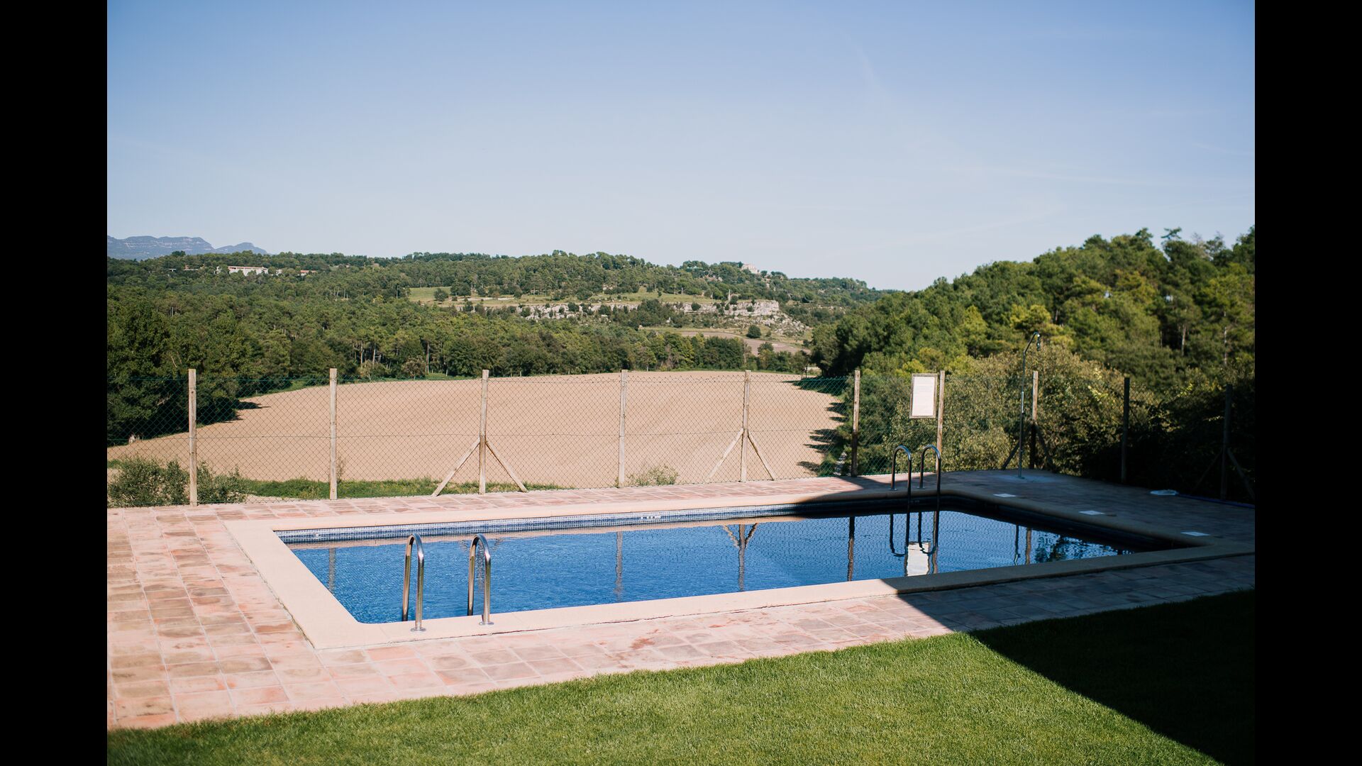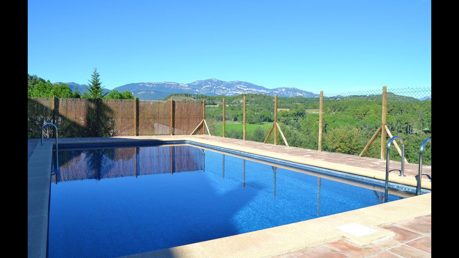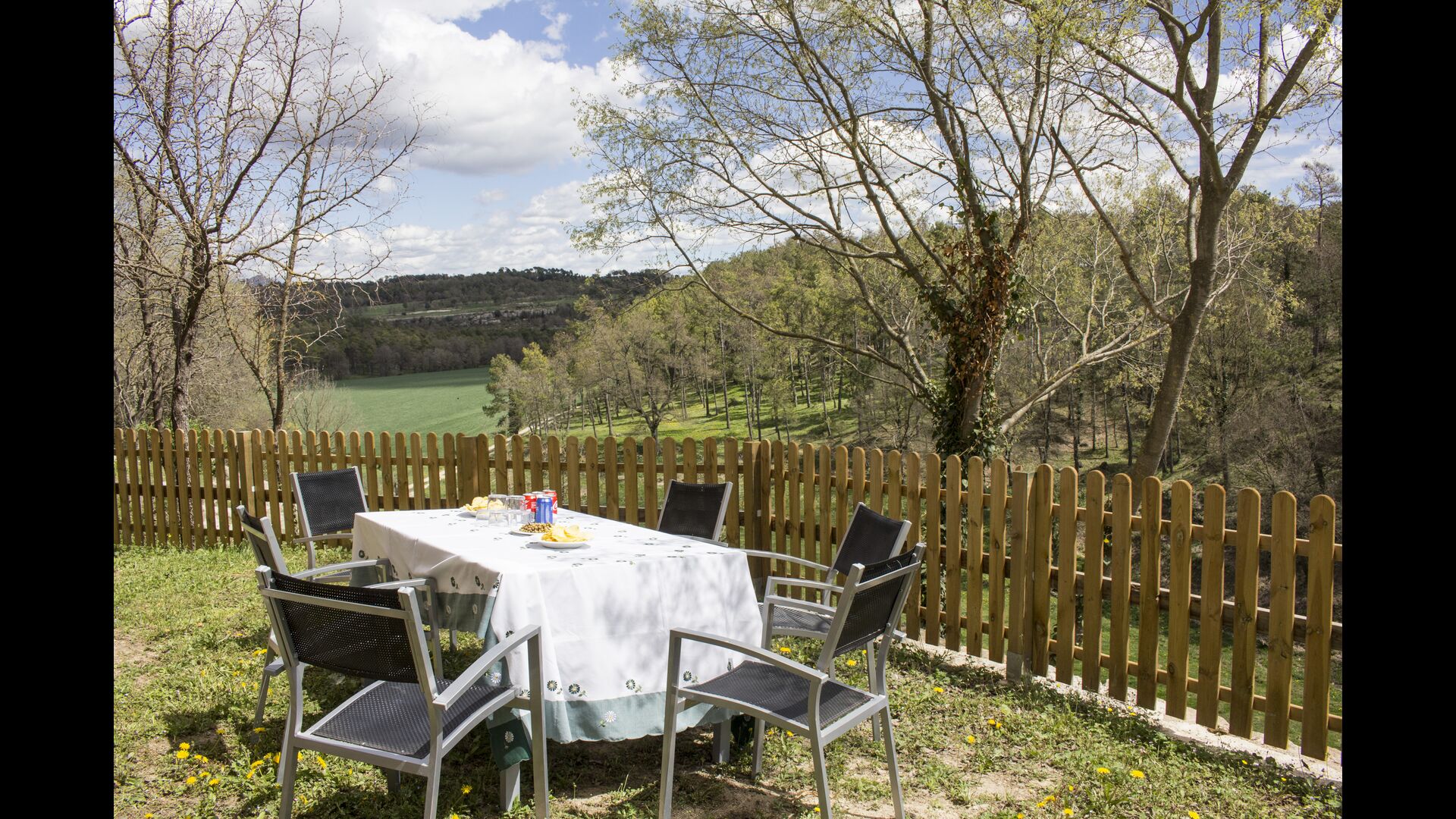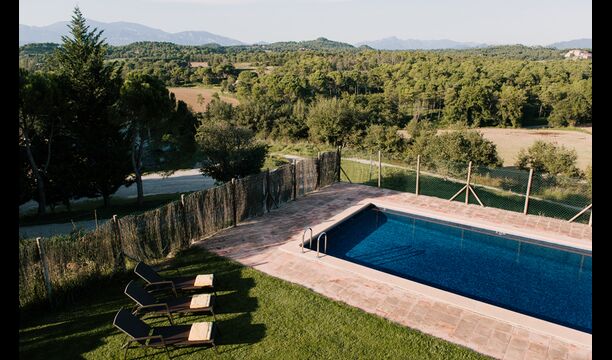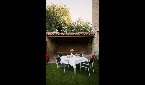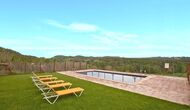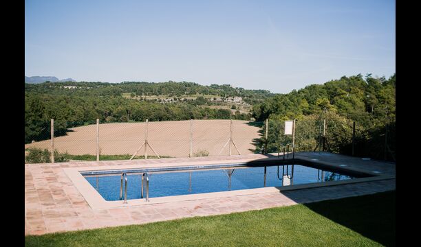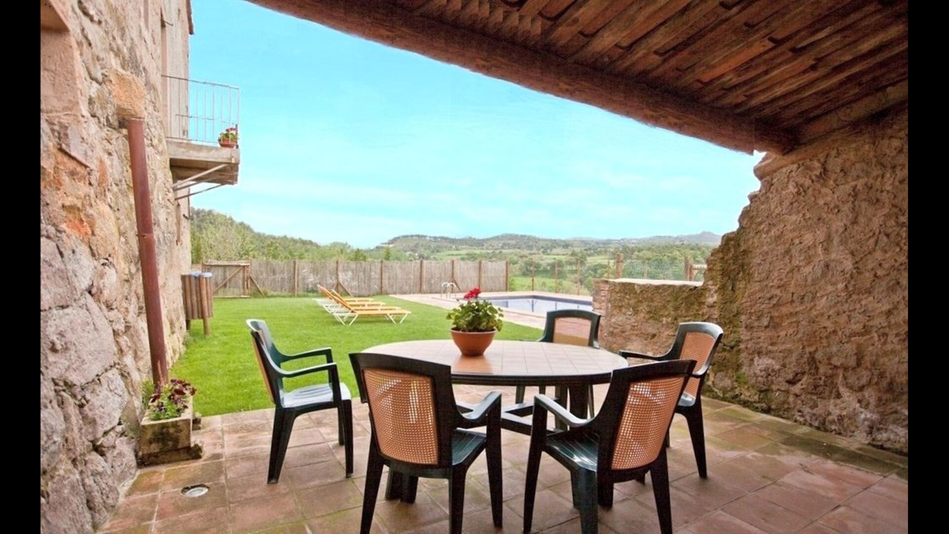 Al voltant de la casa, hi ha una terrassa coberta amb una taula per menjar i també una barbacoa. Per l'altra banda de la casa, tu pots trobar la piscina i un jardí amb gespa. Des de la casa, hi ha una porta directe que va al jardí, per tant no caldrá rodejar la casa per accedir-hi. Des de les tumbones tu tens unes excelents vistes als camps i al fons pots veure els Pirineus. L'entrada a la zona de la piscina és tancada per una porta per protegir els nens petits.