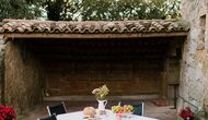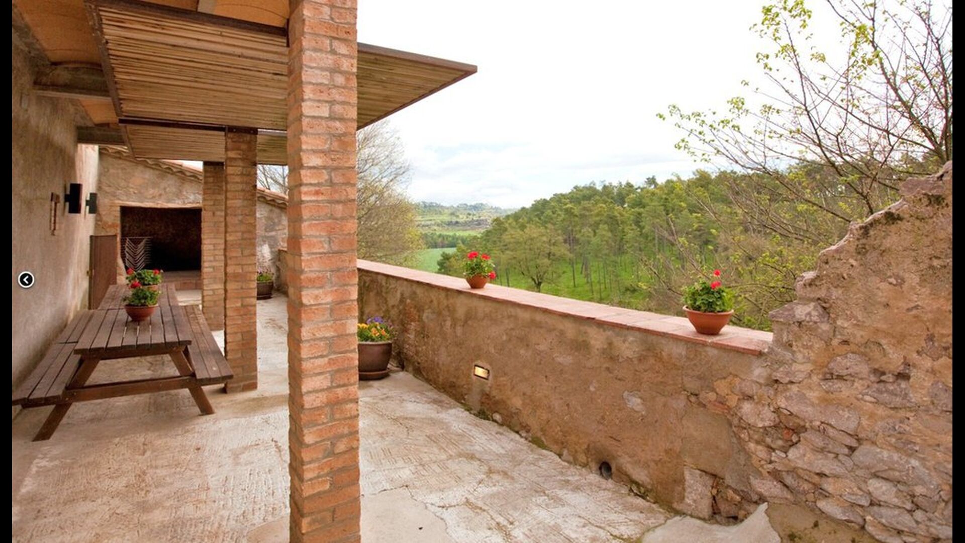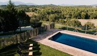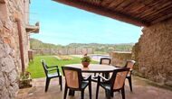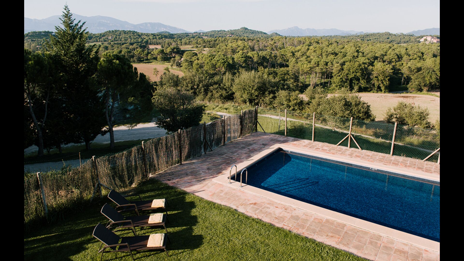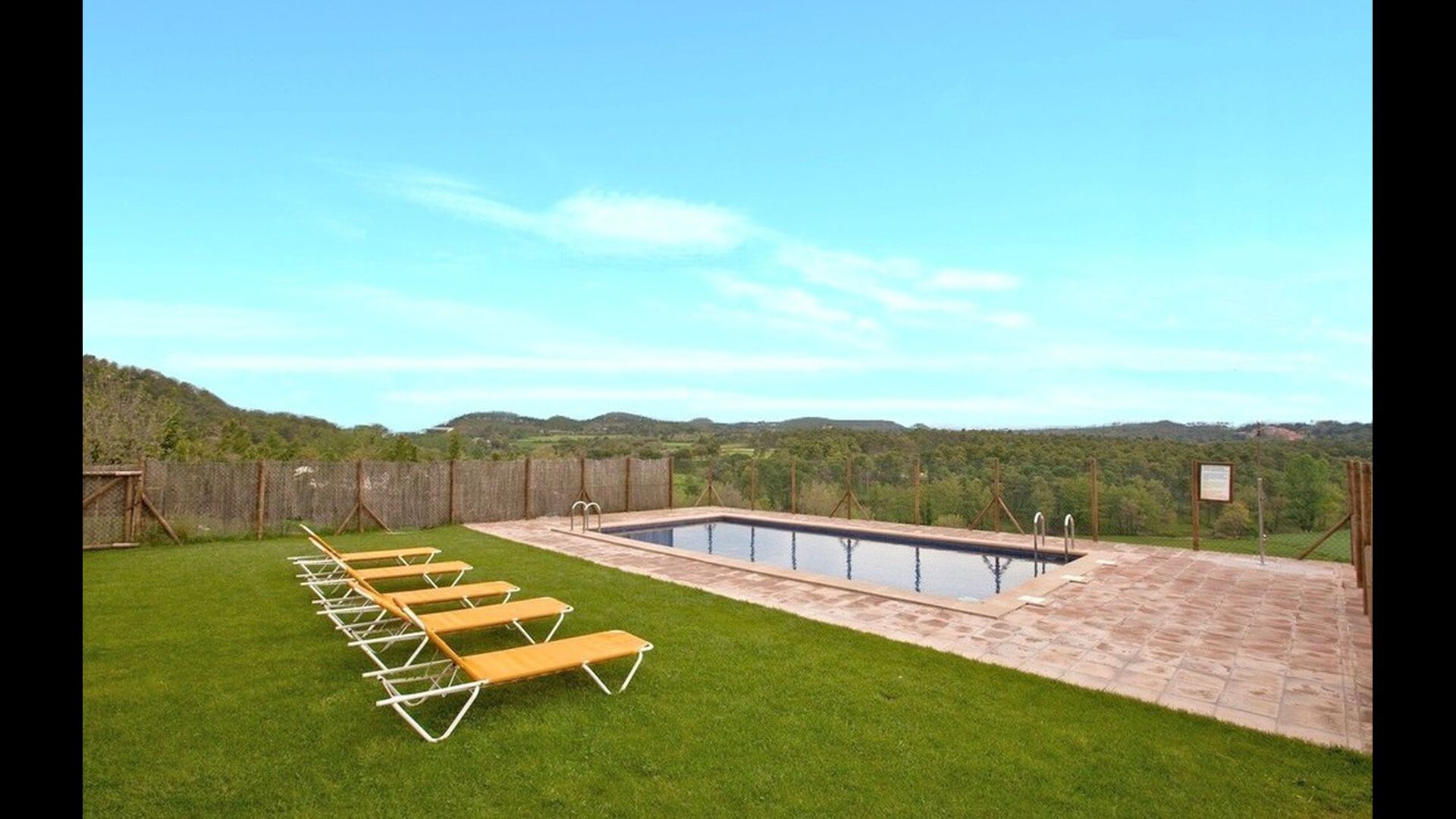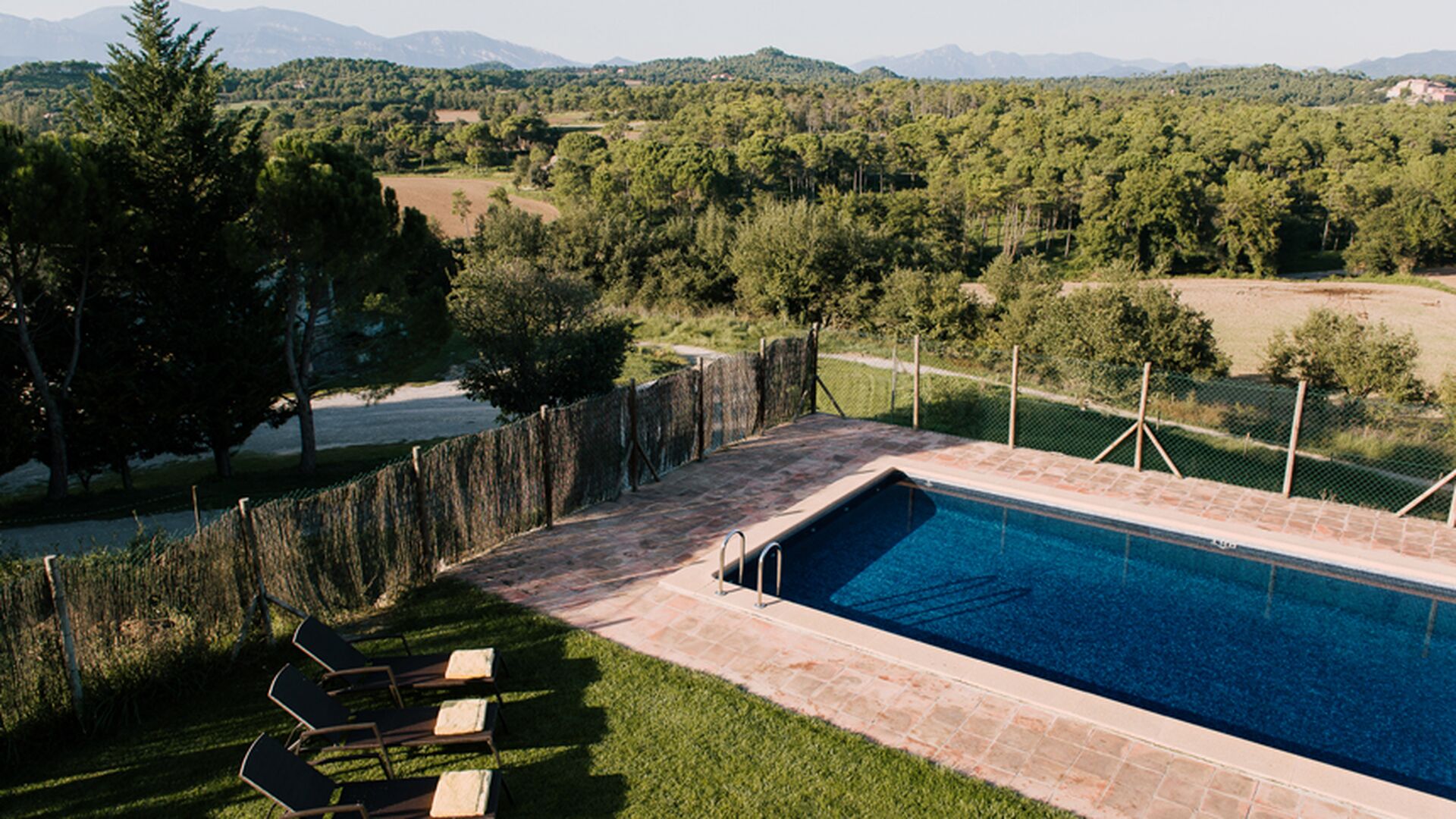 Al voltant de la casa, hi ha una terrassa coberta amb una taula per menjar i també una barbacoa. Per l'altra banda de la casa, tu pots trobar la piscina i un jardí amb gespa. Des de la casa, hi ha una porta directe que va al jardí, per tant no caldrá rodejar la casa per accedir-hi. Des de les tumbones tu tens unes excelents vistes als camps i al fons pots veure els Pirineus. L'entrada a la zona de la piscina és tancada per una porta per protegir els nens petits.