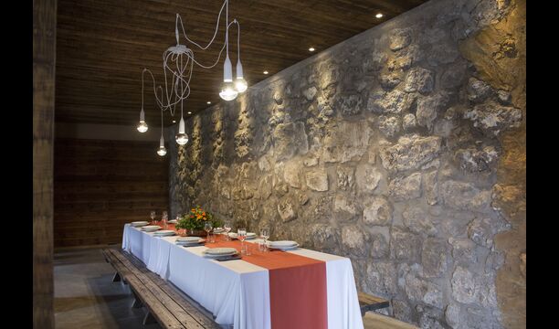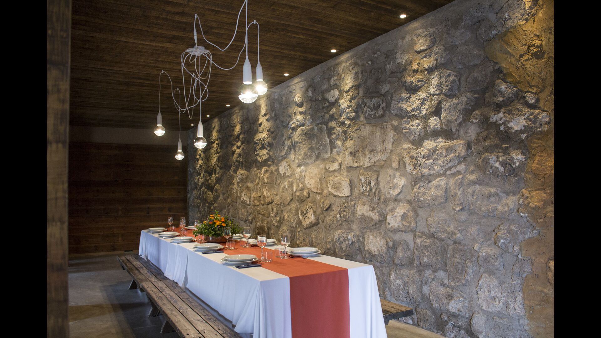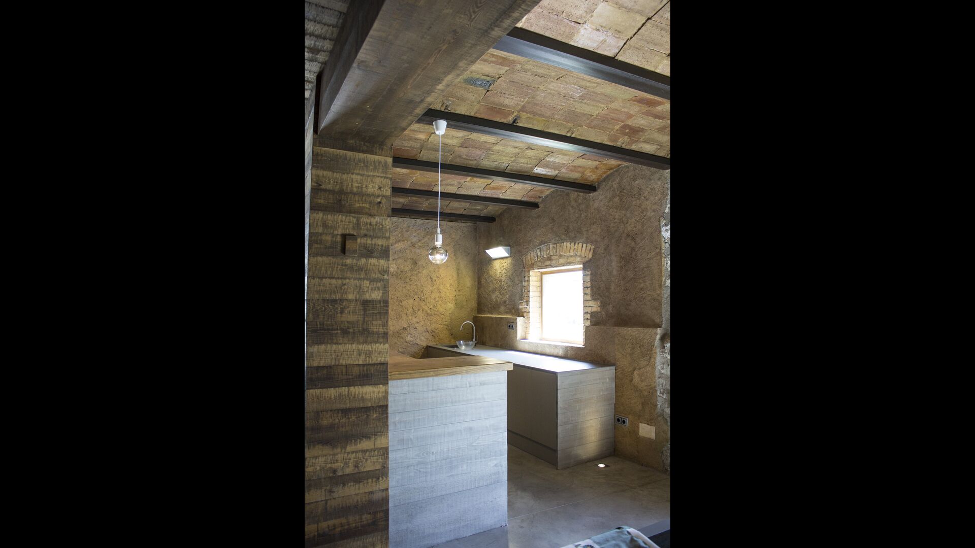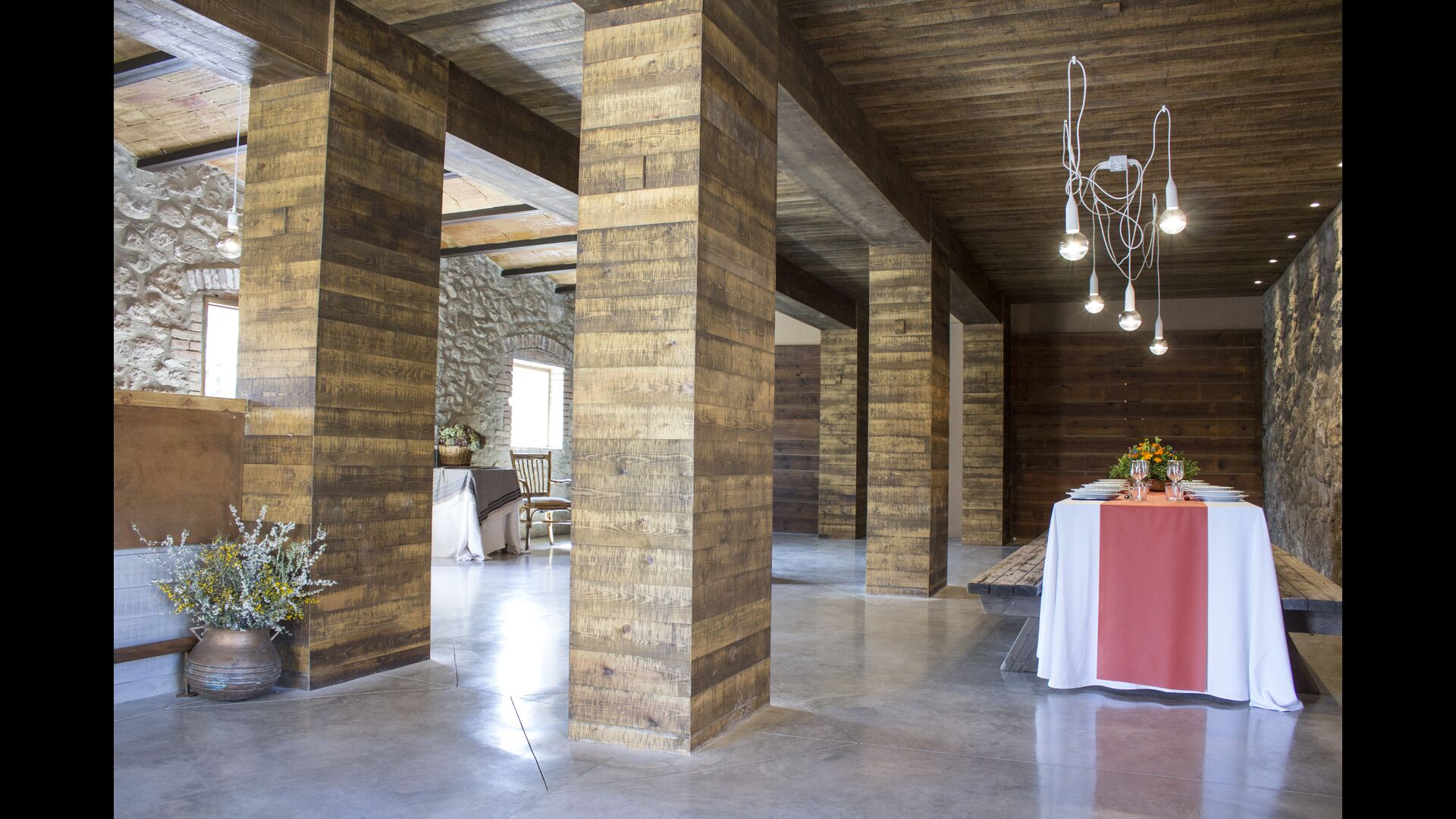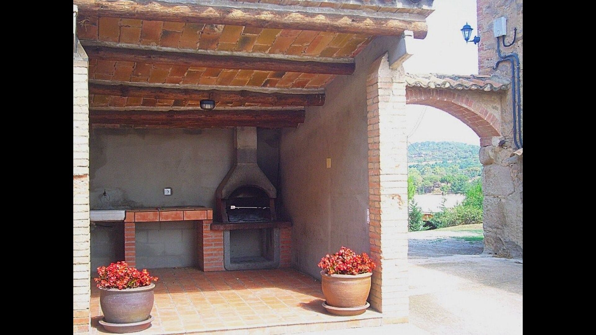 A la part de davant de la casa, hi ha una sala polívalent amb una barra, una pica i una nevera, i també amb dues taules grans amb bancs, on podreu reunir-vos, menjar o fer una petita celebració.