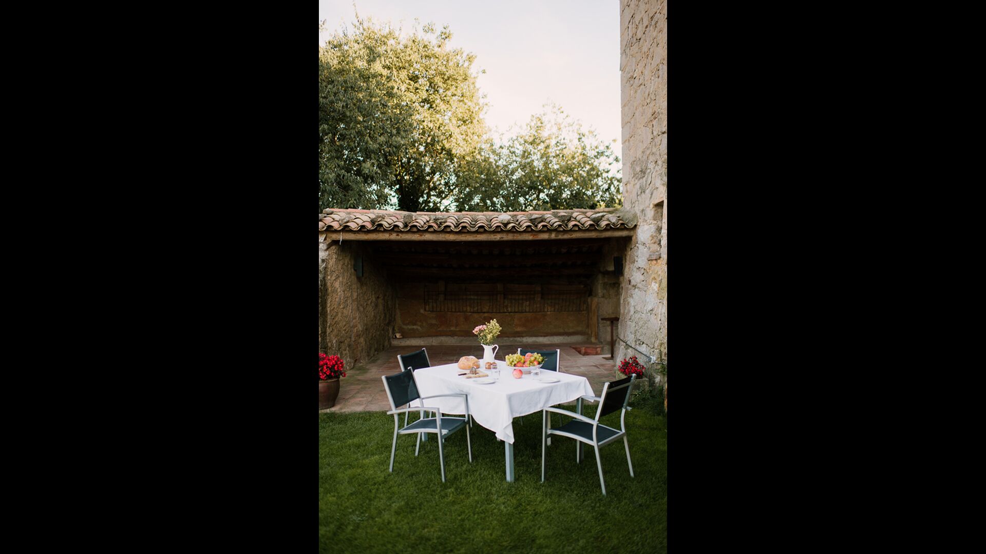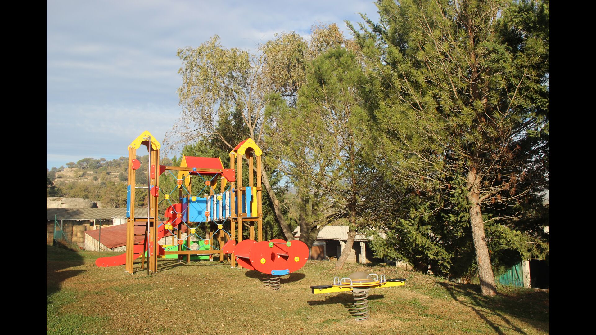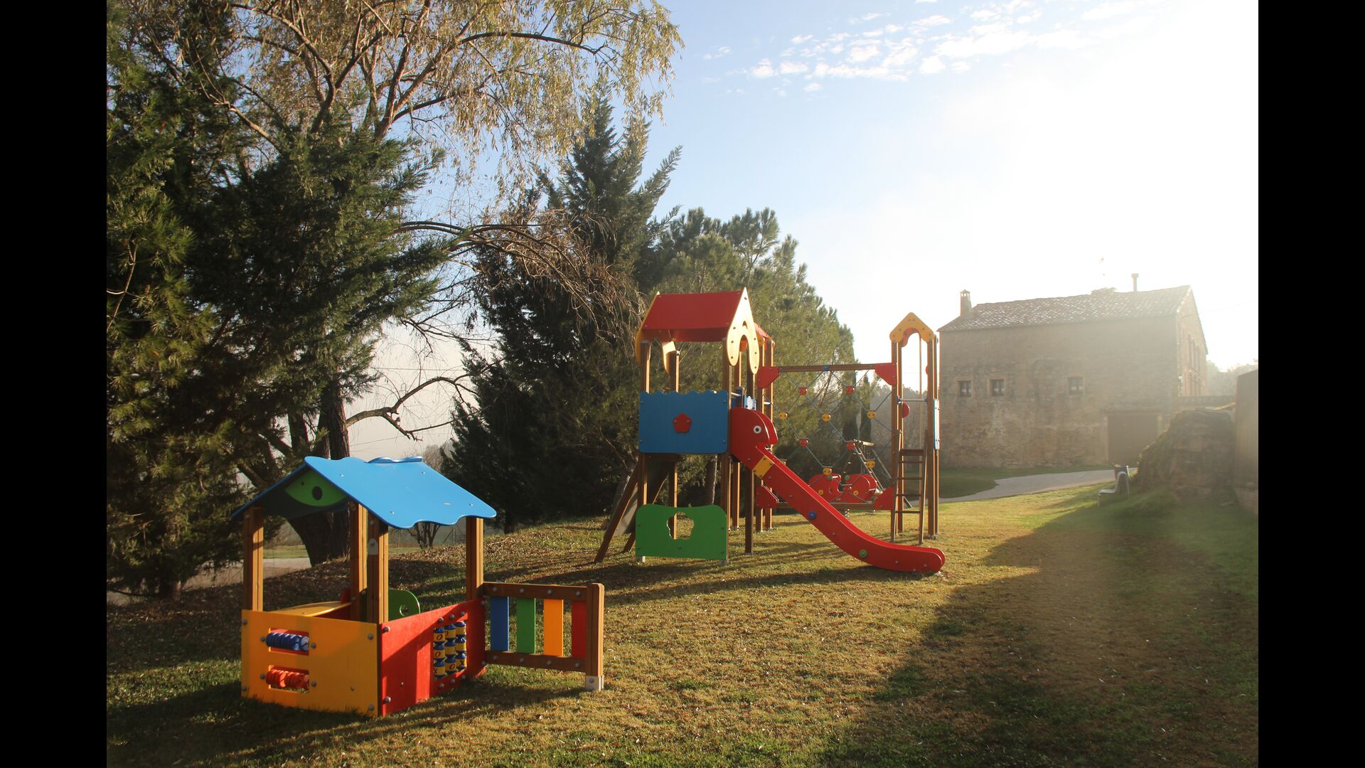 Per l'altra banda de la casa on hi ha el pàrquing dels cotxes, ells han redissenyat dos recintes anteriors, prèviament utilitzats per a l'emmagatzematge d'aliments per als animals, amb una mini-pista de bàsquet i un futbito. A més a més, per l'entreteniment de les famílies, ells tenen fites d'una cursa d'orientació al voltant de la propietat, per tant pots fer una mica d'exercici i divertir-te si tu vols. L'Anna us explicarà com fer-ho quan arribeu.
