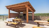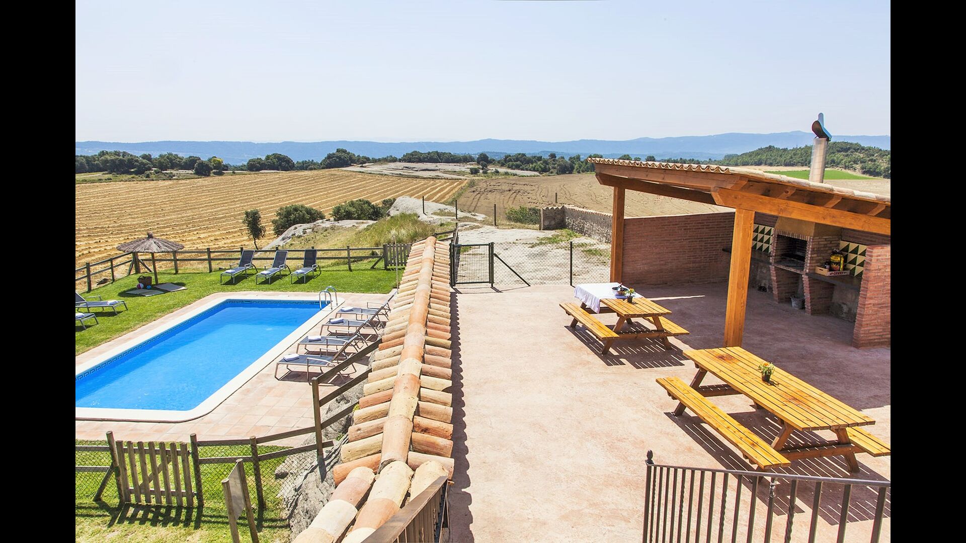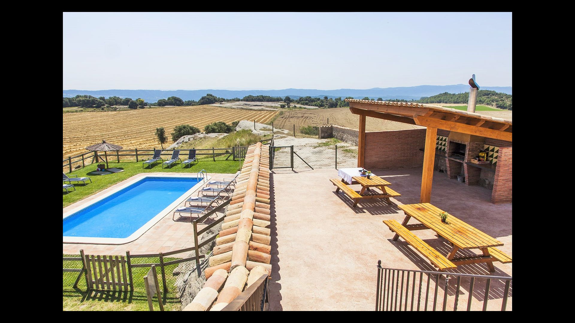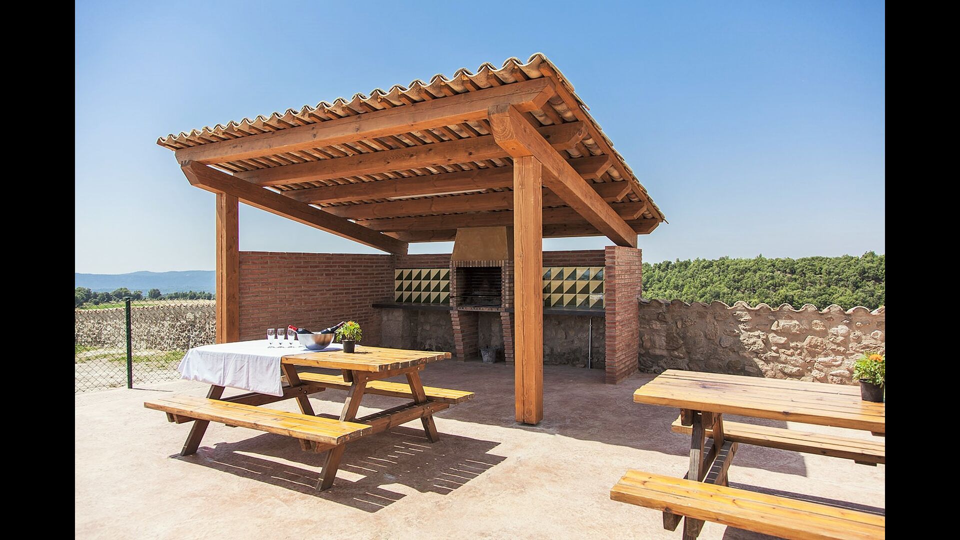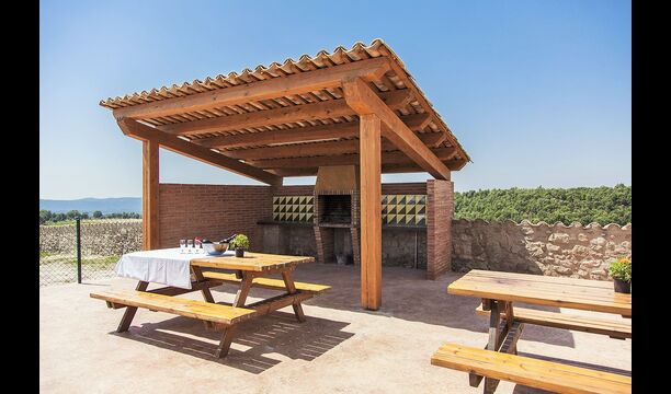 Un poco por encima de la piscina se hace una buena terraza (que también tiene acceso directo desde la casa), con mesas largas y una bonita zona de barbacoa. Creemos que se sentará aquí y disfrutará de una excelente barbacoa y de las largas y cálidas noches, mientras que todavía puede tener un ojo en los niños que quieran darse un chapuzón en la piscina. Desde la terraza también hay una hermosa vista del hermoso paisaje y no menos importante de los impresionantes Pirineos.