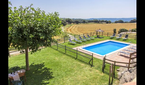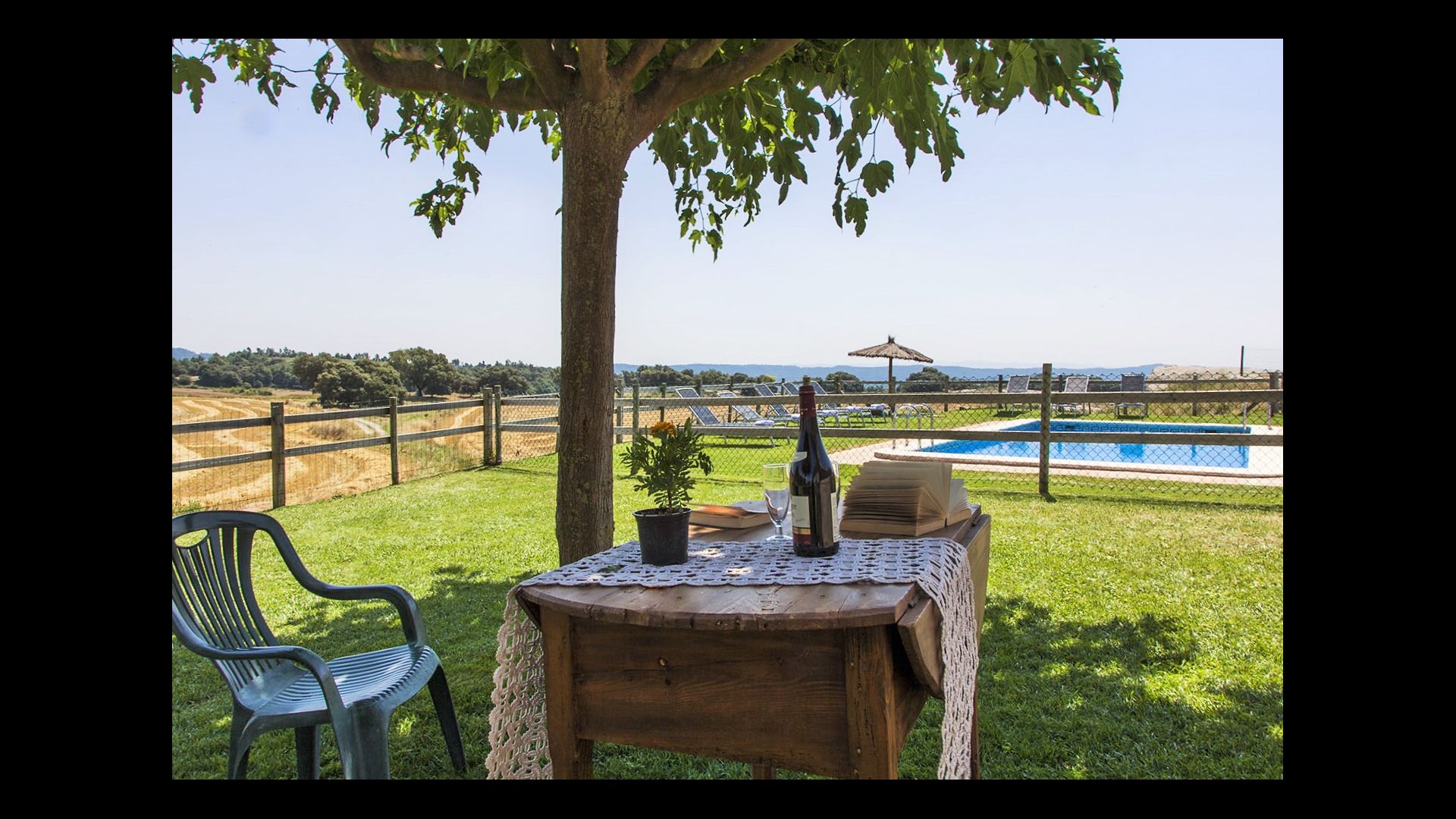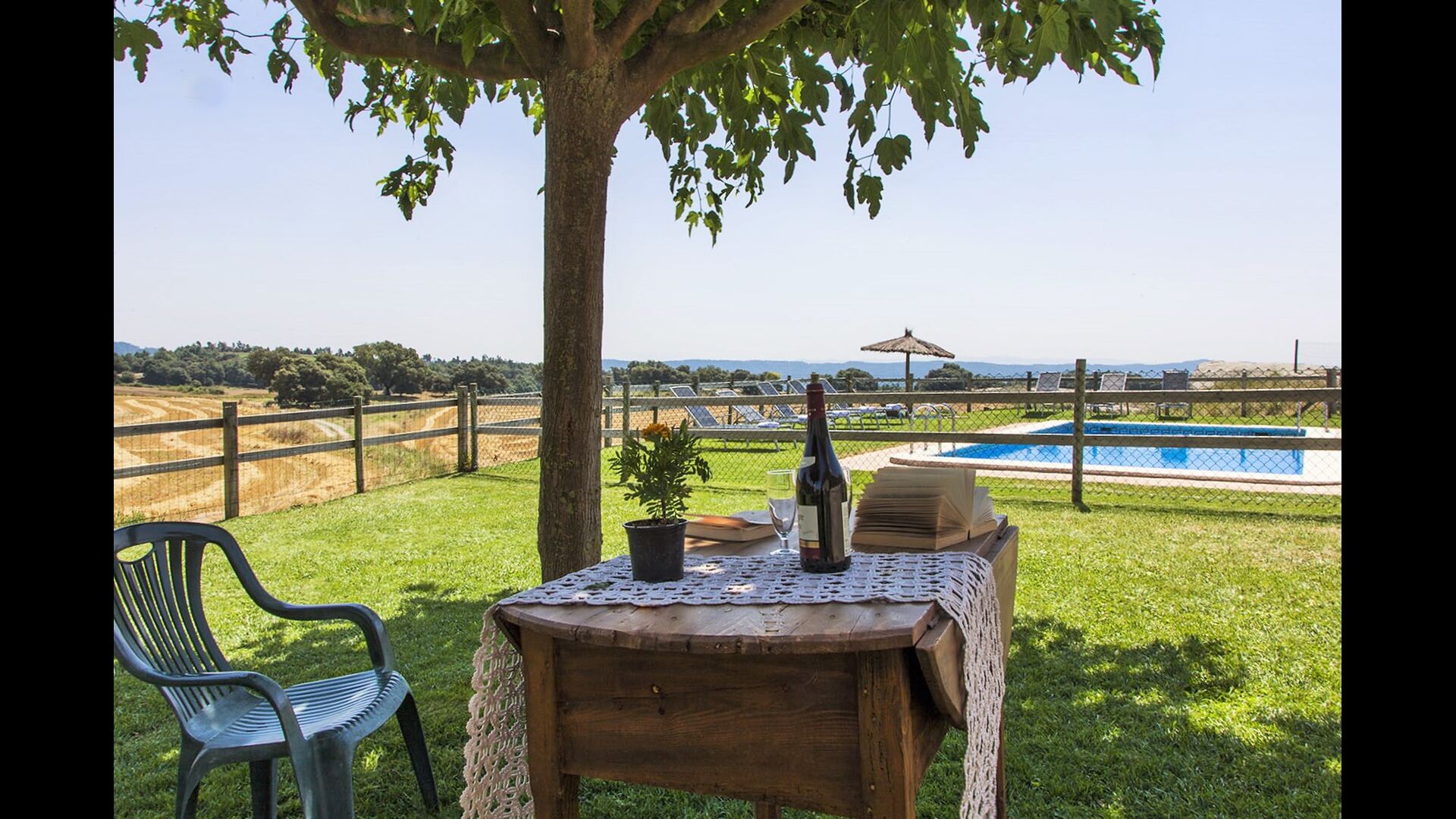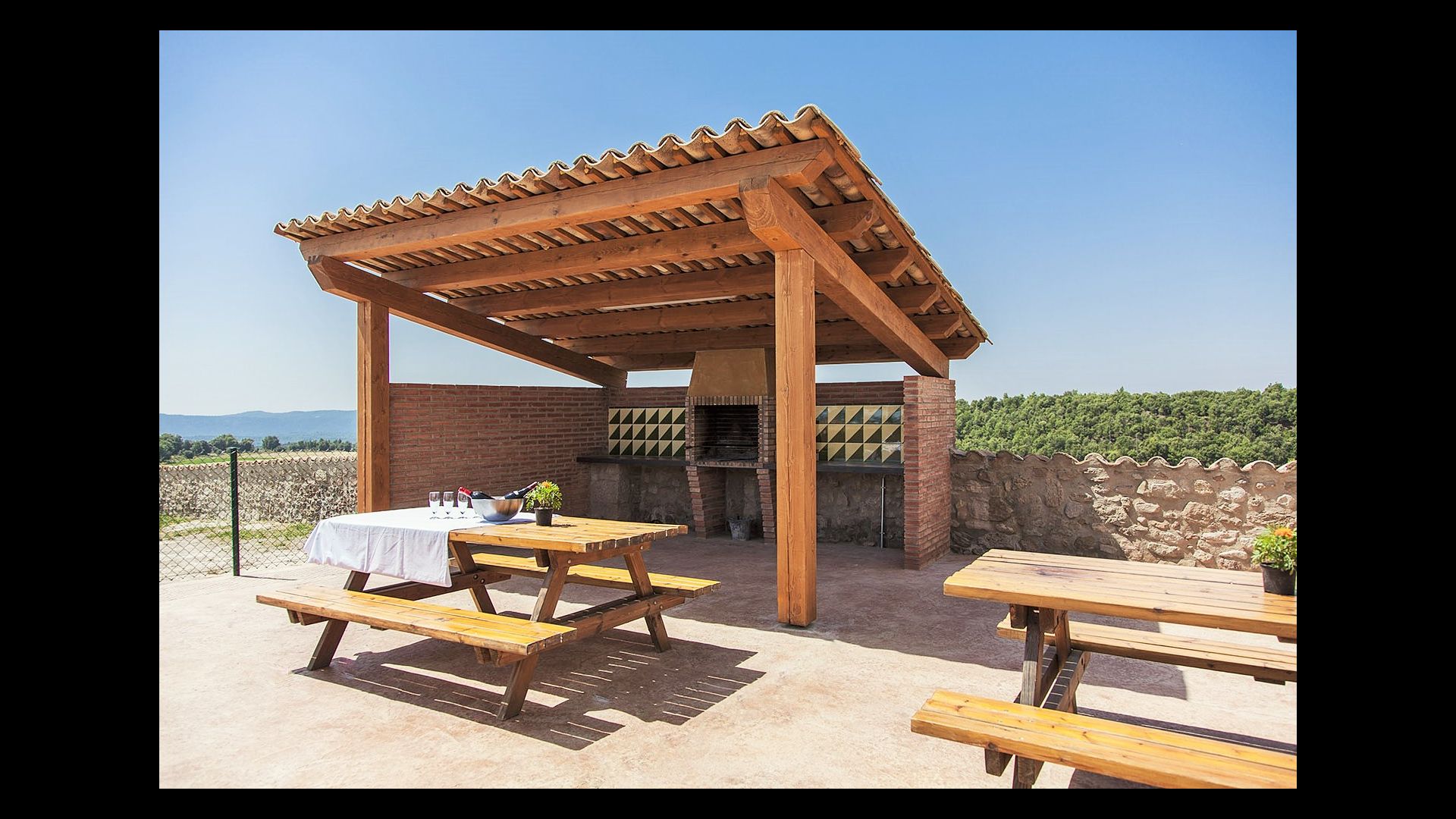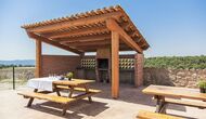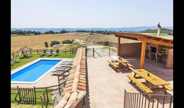 Un poco por encima de la piscina se hace una buena terraza (que también tiene acceso directo desde la casa), con mesas largas y una bonita zona de barbacoa. Creemos que se sentará aquí y disfrutará de una excelente barbacoa y de las largas y cálidas noches, mientras que todavía puede tener un ojo en los niños que quieran darse un chapuzón en la piscina. Desde la terraza también hay una hermosa vista del hermoso paisaje y no menos importante de los impresionantes Pirineos.