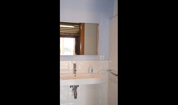 La casa grande de 550 m2 tiene ocho habitaciones, siete de las cuales son dobles y una es una habitación triple. Hay 6 camas dobles y 5 camas individuales en la casa de vacaciones. En cada uno de los dos pisos superiores también hay 3 baños (6 baños en total).