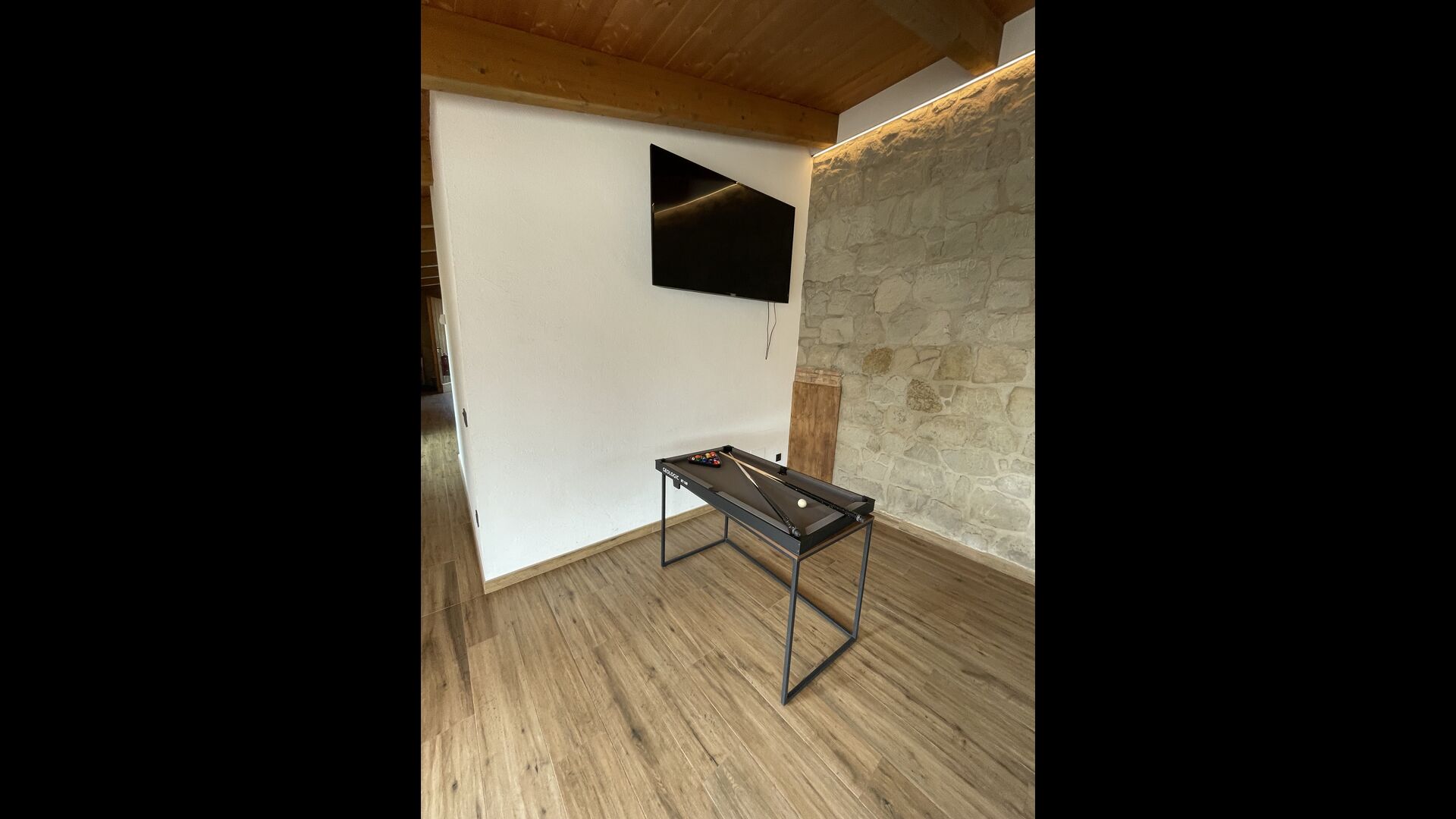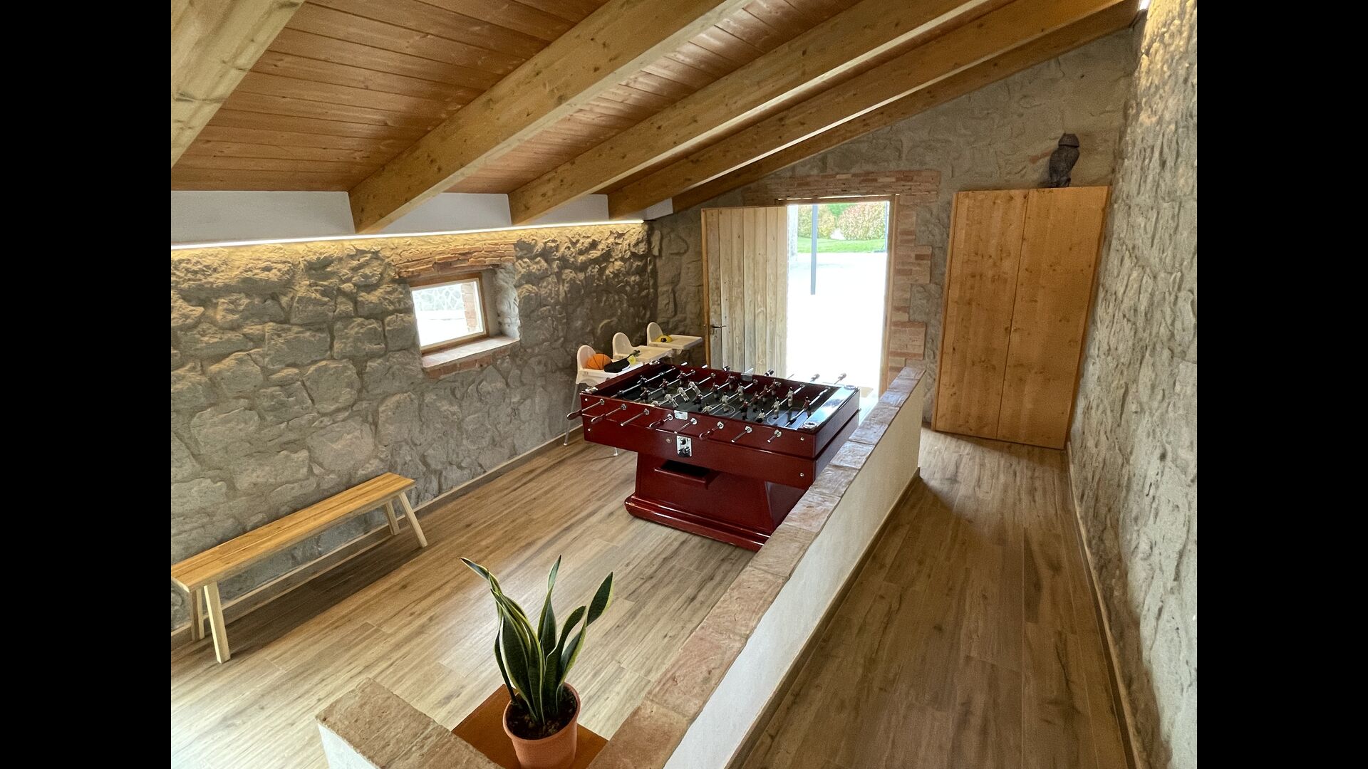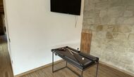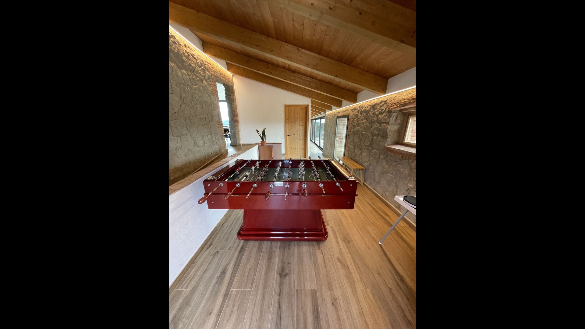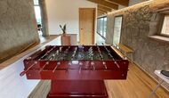 En entrar des del nivell del terra, trobareu un futbolí i un bany. També a la planta baixa, hi trobareu una taula de sopar gran, una configuració de barbacoa (amb una graella de paret), un televisor de pantalla plana a la paret > i una taula de billar petita.